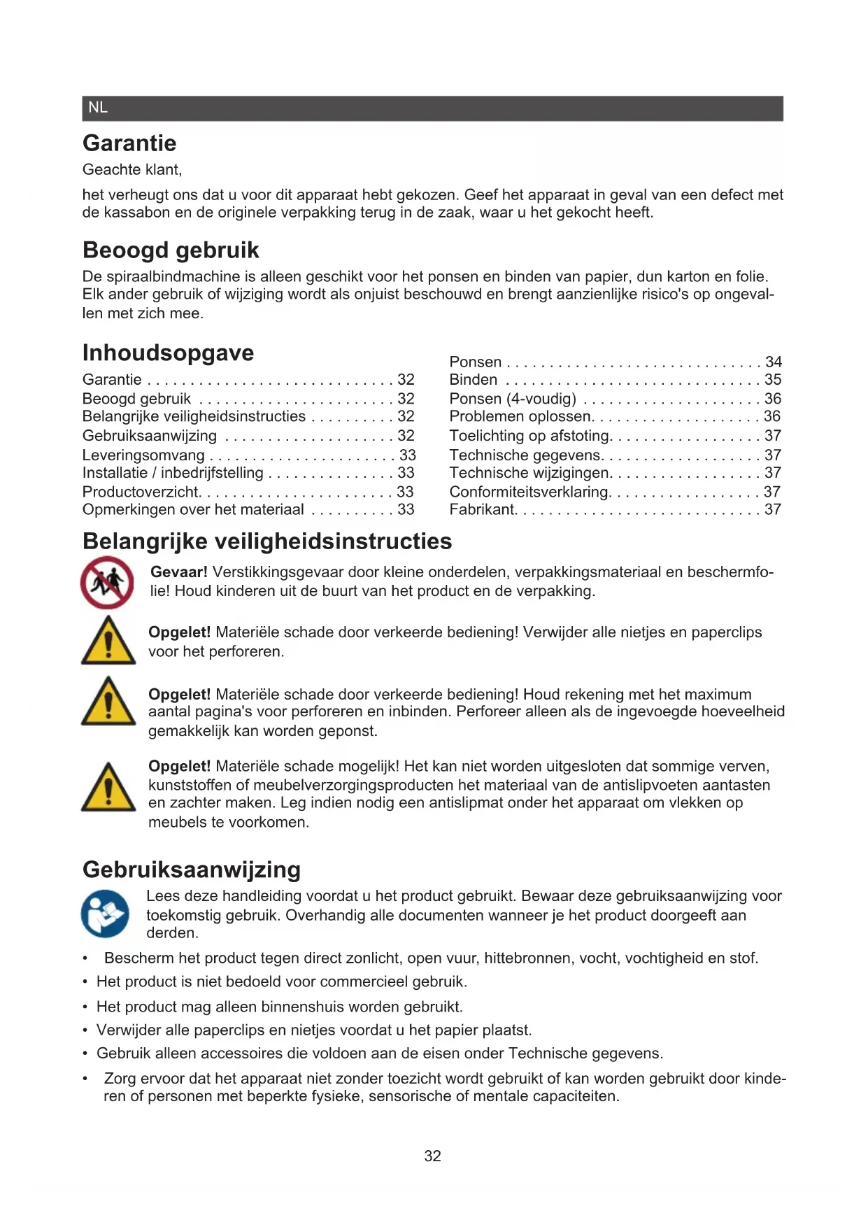 - Garantie Geachte klant, het verheugt ons dat u voor dit apparaat hebt gekozen. Geef het apparaat in geval van een defect met de kassabon en de originele verpakking terug in de zaak, waar u het gekocht heeft. Beoogd gebruik De spiraalbindmachine is alleen geschikt voor het ponsen en binden van papier, dun karton en folie. Elk ander gebruik of wijziging wordt als onjuist beschouwd en brengt aanzienlijke risico's op ongeval- len met zich mee. Inhoudsopgave Garantie p. 32