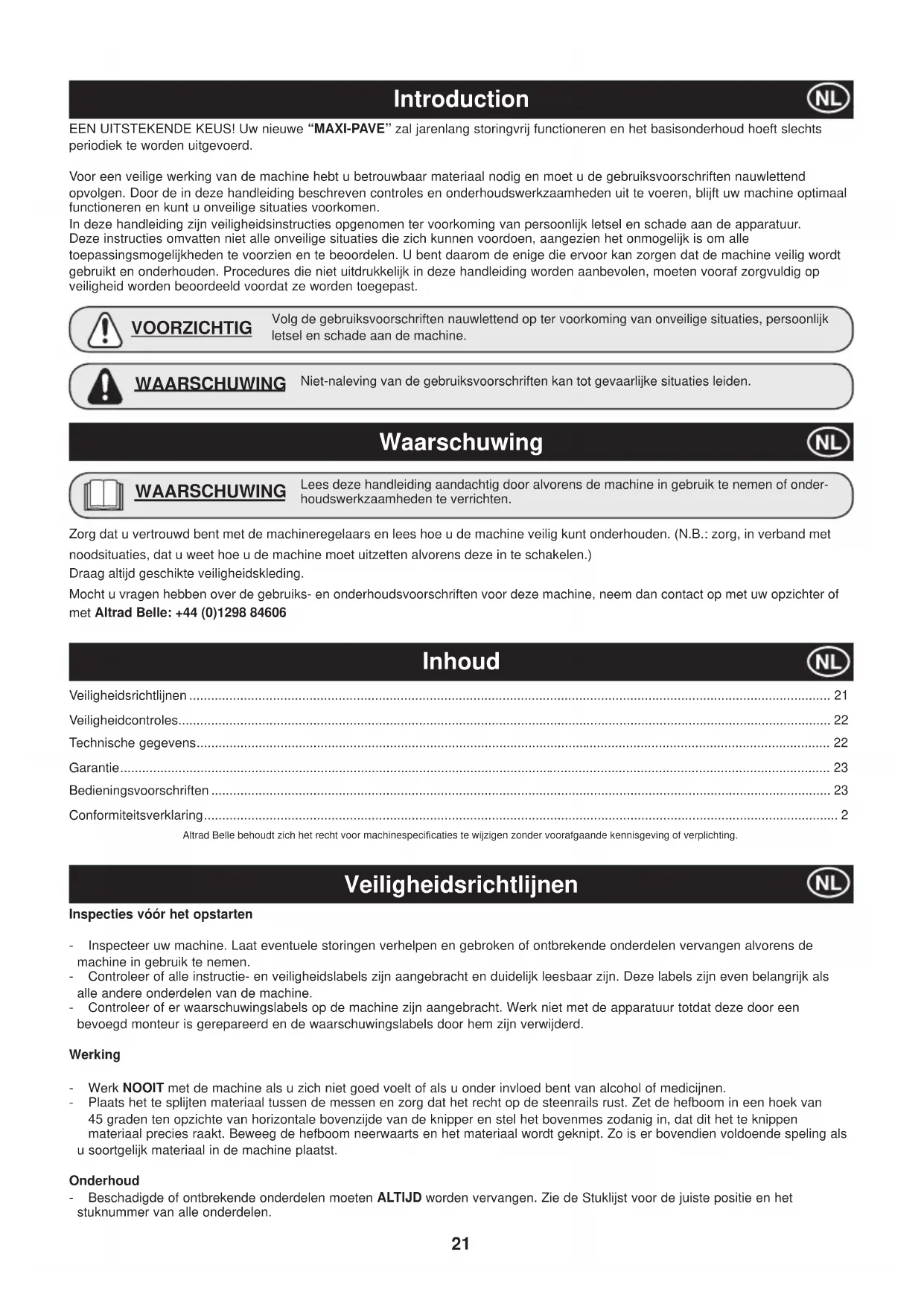 - A “Altrad Belle” e/ou os seus agentes autorizados, directores, empregados ou seguradores não serão considerados responsáveis por danos, perdas ou despesas, consequentes ou outros, relativos ou devido a incapacidade de usar a máquina para qualquer ¿ nalidade. Reclamações de Garantia. Todas as reclamações de garantia deverão ser primeiramente dirigidas ao Altrad Belle, por telefone, fax, E-mail ou por escrito. Reclamações de Garantia. Tel : +44 (0)1298 84606, Fax : +44 (0)1298 84073, Email : Warranty@belle-group.co.uk Para reclamações de garantia: Altrad Belle Departamento de Garantias, Sheen, Nr. Buxton Derbyshire SK17 0EU Inglaterra Registo de Garantia: Seguindo o compromisso que assumiu para ser mais ecológica e respeitadora do ambiente, a ALTRAD Belle acaba de lançar o registo online da Garantia. Para aceder à página de registo do website, utilize o seguinte endereço:- http://www.bellegroup.com/index.php?p=warranty_registration Em alternativa, também pode digitalizar o Código QR (código de resposta rápida) com o seu smartphone para aceder à página de registo. Garantia21 Introduction EEN UITSTEKENDE KEUS! Uw nieuwe “MAXI-PAVE” zal jarenlang storingvrij functioneren en het basisonderhoud hoeft slechts periodiek te worden uitgevoerd. Voor een veilige werking van de machine hebt u betrouwbaar materiaal nodig en moet u de gebruiksvoorschriften nauwlettend opvolgen. Door de in deze handleiding beschreven controles en onderhoudswerkzaamheden uit te voeren, blijft uw machine optimaal functioneren en kunt u onveilige situaties voorkomen. In deze handleiding zijn veiligheidsinstructies opgenomen ter voorkoming van persoonlijk letsel en schade aan de apparatuur. Deze instructies omvatten niet alle onveilige situaties die zich kunnen voordoen, aangezien het onmogelijk is om alle toepassingsmogelijkheden te voorzien en te beoordelen. U bent daarom de enige die ervoor kan zorgen dat de machine veilig wordt gebruikt en onderhouden. Procedures die niet uitdrukkelijk in deze handleiding worden aanbevolen, moeten vooraf zorgvuldig op veiligheid worden beoordeeld voordat ze worden toegepast. Veiligheidsrichtlijnen p. 21