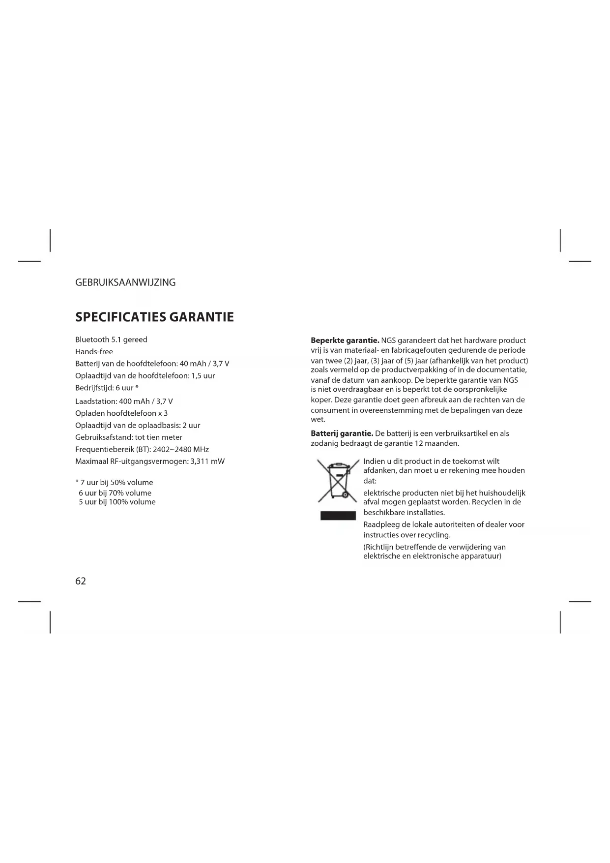 SPECIFICATIES GARANTIE Beperkte garantie. NGS garandeert dat het hardware product vrij is van materiaal- en fabricagefouten gedurende de periode van twee (2) jaar, (3) jaar of (5) jaar (afhankelijk van het product) zoals vermeld op de productverpakking of in de documentatie, vanaf de datum van aankoop. De beperkte garantie van NGS is niet overdraagbaar en is beperkt tot de oorspronkelijke koper. Deze garantie doet geen afbreuk aan de rechten van de consument in overeenstemming met de bepalingen van deze wet. Batterij garantie. De batterij is een verbruiksartikel en als zodanig bedraagt de garantie 12 maanden. Bluetooth 5.1 gereed Hands-free Batterij van de hoofdtelefoon: 40 mAh / 3,7 V Oplaadtijd van de hoofdtelefoon: 1,5 uur Bedrijfstijd: 6 uur * Laadstation: 400 mAh / 3,7 V Opladen hoofdtelefoon x 3 Oplaadtijd van de oplaadbasis: 2 uur Gebruiksafstand: tot tien meter Frequentiebereik (BT): 2402~2480 MHz Maximaal RF-uitgangsvermogen: 3,311 mW