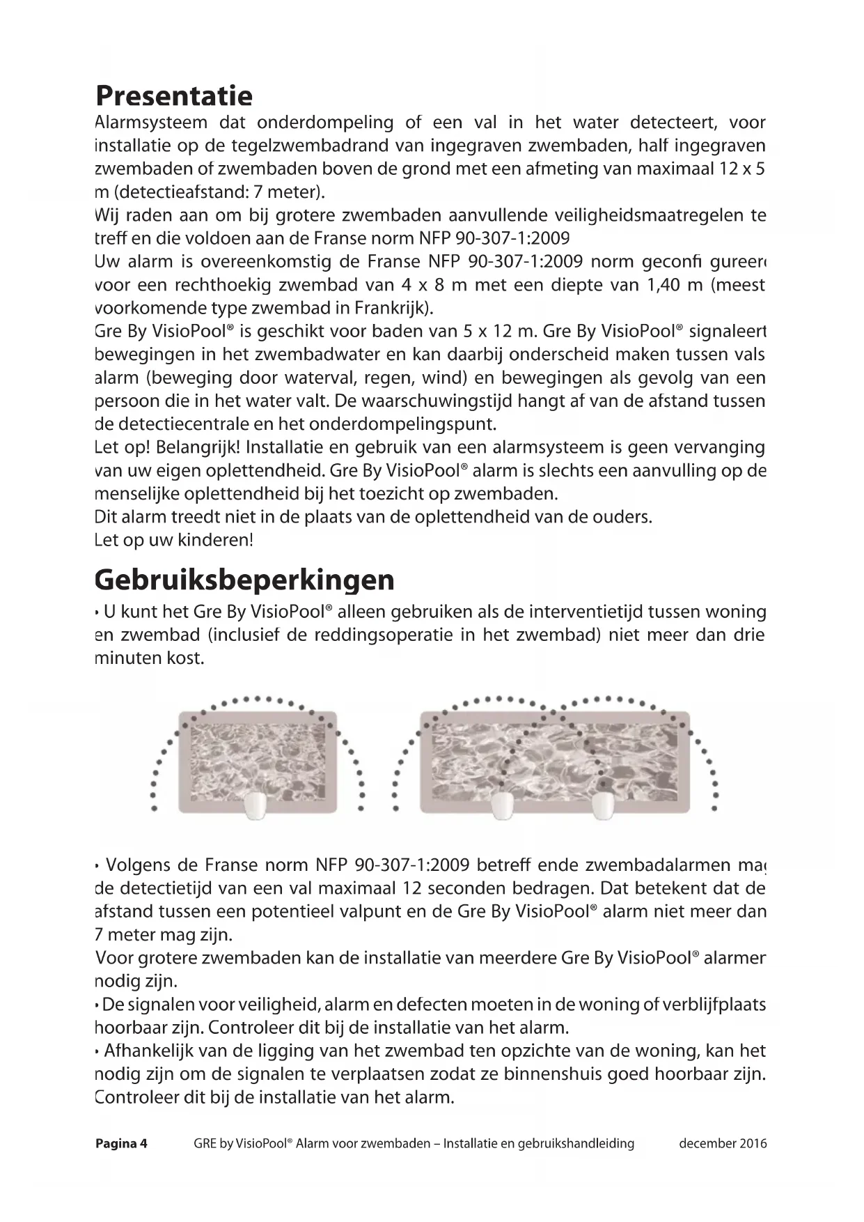 - Permanente informatie over toezichtstatus Installatiehandleiding - Gebruikshandleiding Aandachtig doorlezen en bewaren voor later gebruik. byPagina 2 GRE by VisioPool® Alarm voor zwembaden – Installatie en gebruikshandleiding december 2016 WAARSCHUWING Beste klant, U heeft een alarmsysteem voor zwembaden aangeschaft, welke voldoet aan de Franse norm NFP 90-307-1:2009. Het alarm vervangt niet de eigen verantwoordelijkheid en het gebruik van gezond verstand. U blijft verantwoordelijk voor de veiligheid van uw kinderen! Kinderen onder de 5 jaar lopen het grootste risico. Ongelukken gebeuren niet alleen bij anderen! Neem dus uw maatregelen! ACIS kan niet aansprakelijk worden gehouden voor het vallen of verdrinken van personen of dieren. Het gebruik van het alarm Gre By VisioPool® ontslaat u niet van uw taak om in en rond het zwembad oplettend te blijven. Garantie : om gebruik te kunnen maken van de garantie van VisioPool®, bent u verplicht het geleverde garantiecerti caat in te vullen en binnen 1 week per aangetekende post terug te zenden aan ACIS - 15, rue des Marais- 44310 ST PHILBERT DE GRAND LIEU (FRANKRIJK). De garantie van de Gre By VisioPool® treedt in werking zodra het volledig ingevulde garantiecerti caat door ons is ontvangen. Zonder ontvangst van dit certi caat kunnen wij geen garantie toekennen. Lees navolgende gebruiksaanwijzing van de Gre By VisioPool® aandachtig door en bewaar deze om eventueel later nog te kunnen raadplegen.december 2016 GRE by VisioPool® Alarm voor zwembaden - Installatie en gebruikshandleiding Pagina 3 Inhoudsopgave Waarschuwing ..................................................................................... 4 Voorafgaande controles ............................................................... 5 Verpakking en inhoud controleren ............................................... 5 Controle voor ingebruikname ....................................................... 6 Bevestigingsplaats .............................................................................. 7 Bevestiging op zwembadrand ................................................... 8 Functietest in het zwembad .......................................................... 9 Alkalinebatterijen ............................................................................. 10 Bebruik ................................................................................................ 11 Overwintering ....................................................................................11 Uitschakelen ....................................................................................... 12 Waarschuwingen .............................................................................. 12 Aanvullende informatie .................................................................. 13 Wettelijke vermeldingen ................................................................ 13 Informatie over het Gre By VisioPool® alarm ........................... 13 Veiligheidsvoorschriften ............................................................ 14Pagina 4 GRE by VisioPool® Alarm voor zwembaden – Installatie en gebruikshandleiding december 2016 Presentatie Alarmsysteem dat onderdompeling of een val in het water detecteert, voor installatie op de tegelzwembadrand van ingegraven zwembaden, half ingegraven zwembaden of zwembaden boven de grond met een afmeting van maximaal 12 x 5 m (detectieafstand: 7 meter). Wij raden aan om bij grotere zwembaden aanvullende veiligheidsmaatregelen te tre en die voldoen aan de Franse norm NFP 90-307-1:2009. Uw alarm is overeenkomstig de Franse NFP 90-307-1:2009 norm gecon gureerd voor een rechthoekig zwembad van 4 x 8 m met een diepte van 1,40 m (meest voorkomende type zwembad in Frankrijk). Gre By VisioPool® is geschikt voor baden van 5 x 12 m. Gre By VisioPool® signaleert bewegingen in het zwembadwater en kan daarbij onderscheid maken tussen vals alarm (beweging door waterval, regen, wind) en bewegingen als gevolg van een persoon die in het water valt. De waarschuwingstijd hangt af van de afstand tussen de detectiecentrale en het onderdompelingspunt. Let op! Belangrijk! Installatie en gebruik van een alarmsysteem is geen vervanging van uw eigen oplettendheid. Gre By VisioPool® alarm is slechts een aanvulling op de menselijke oplettendheid bij het toezicht op zwembaden. Dit alarm treedt niet in de plaats van de oplettendheid van de ouders. Let op uw kinderen! Gebruiksbeperkingen