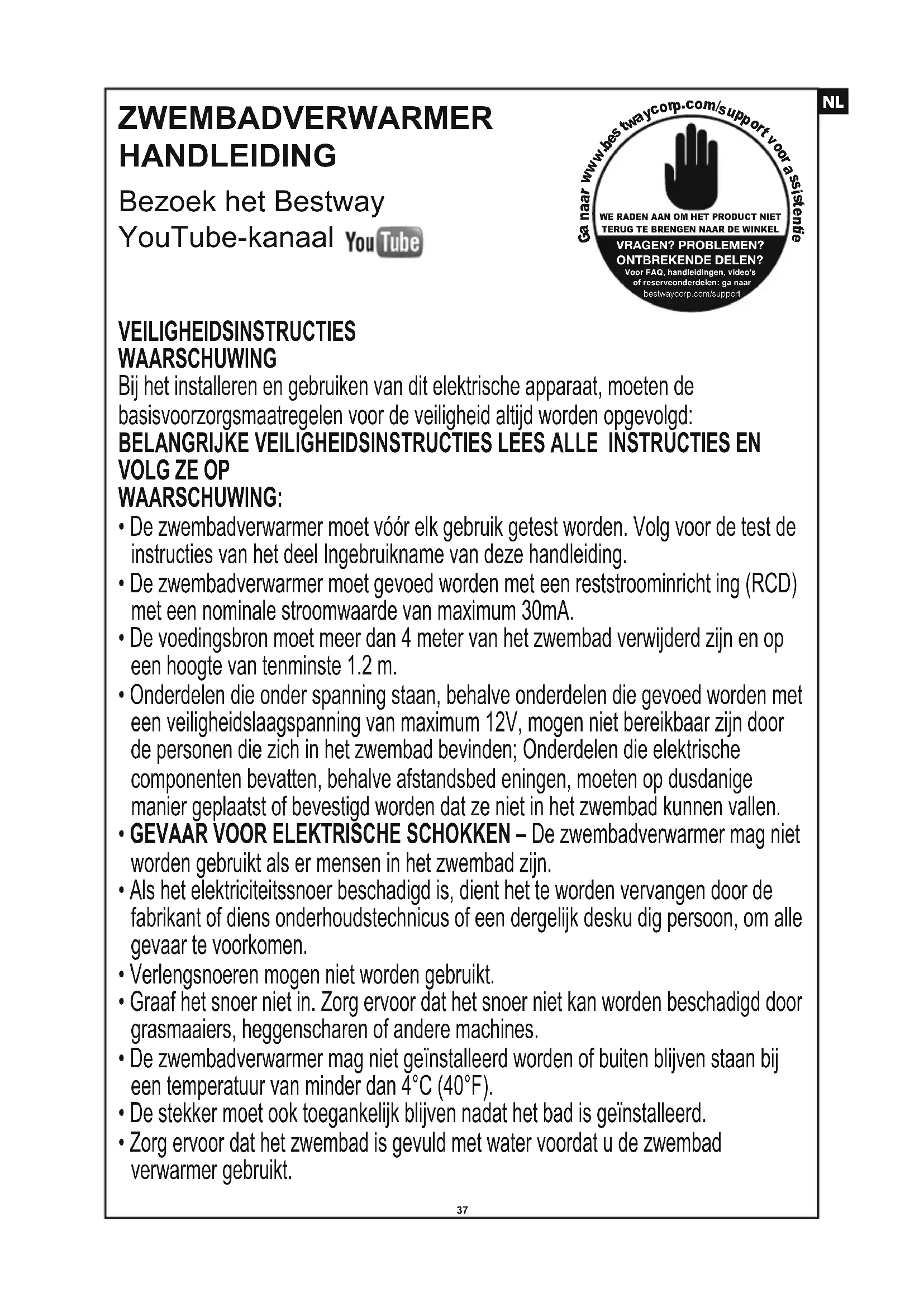 WAARSCHUWING: Gebruik de verwarmer niet als deze test faalt, Voor assistentie kunt u de supportafdeling op onze website bezoeken op www.bestwaycorp.com.VEILIGHEIDSINSTRUCTIES WAARSCHUWING Bij het installeren en gebruiken van dit elektrische apparaat, moeten de basisvoorzorgsmaatregelen voor de veiligheid altijd worden opgevolgd: