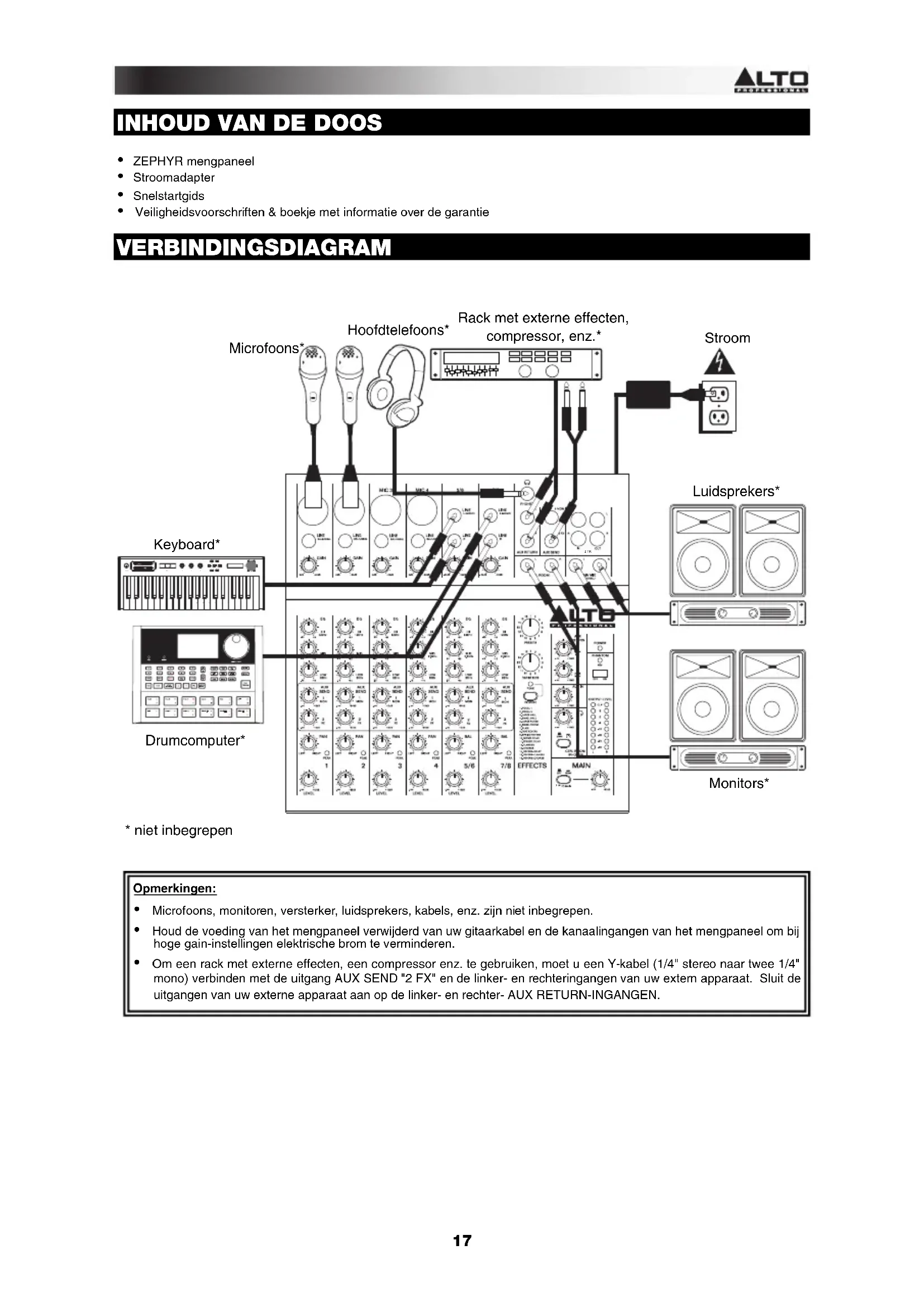 y ZEPHYR mengpaneel y Stroomadapter y Snelstartgids y Veiligheidsvoorschriften & boekje met informatie over de garantie VERBINDINGSDIAGRAM
