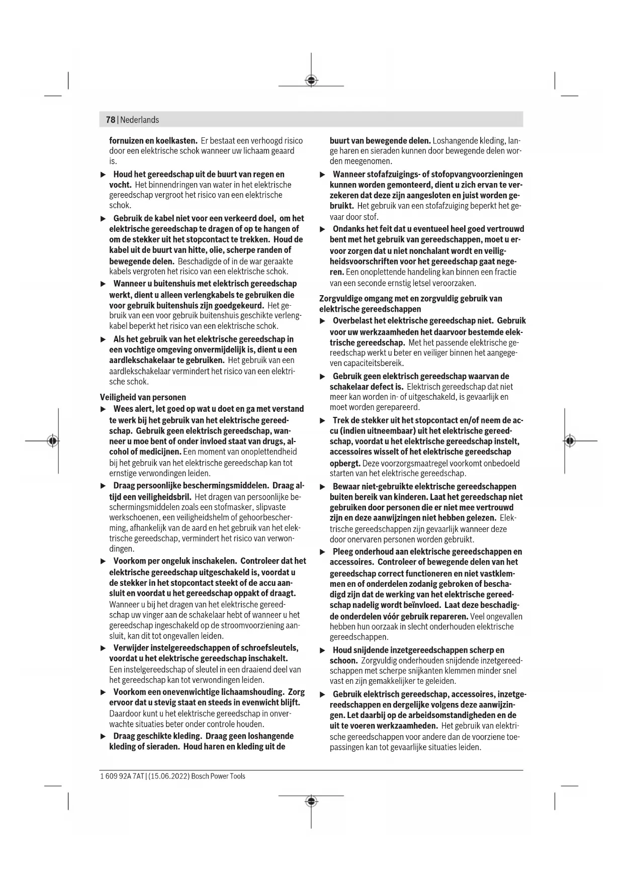 Handbescherming u Monteer voor werken met het rubber schuurplateau(18) of met de komstaalborstel/kegel- borstel altijd de handbescherming(17). Bevestig de handbescherming (17) met de extra handgreep (7). Trillingsdempende extra handgreep Aanwijzing: Bij de haakse slijpmachine GWS18V-180PC wordt een trillingsdempende extra handgreep meegeleverd (7) die zorgt voor een grotere afstand tot de drijfwerkbehui- zing. Gebruik omwille van ergonomie en arbeidsveiligheid al- tijd de in deze gebruiksaanwijzing beschreven trillingsdem- pende extra handgreep (7). Dankzij de trillingsdempende extra handgreep (7) kunt u met weinig trillingen en daardoor aangenamer en veiliger werken. Schroef de extra handgreep(7) afhankelijk van de werkwijze rechts of links van de machinekop vast. u Gebruik uw elektrische gereedschap alleen met de ex- tra handgreep (7). u Gebruik het elektrische gereedschap niet meer, wan- neer de extra handgreep (7) beschadigd is. Verander de extra handgreep (7) op geen enkele wijze. Bosch Power Tools 1 609 92A 7AT | (15.06.2022)86 | Nederlands Slijpgereedschap monteren u Neem vóór alle werkzaamheden aan het elektrische gereedschap (zoals het uitvoeren van onderhoud of het wisselen van inzetgereedschappen e.d.) en vóór het vervoeren en opbergen altijd de accu uit het elek- trische gereedschap. Bij per ongeluk bedienen van de aan/uit-schakelaar bestaat gevaar voor letsel. u Raak de (door)slijpschijven niet aan, voordat ze afge- koeld zijn. De schijven worden bij het werken erg heet. Reinig de slijpas (16) en alle te monteren delen. Druk voor het vastspannen en losmaken van de slijpgereed- schappen op de asblokkeerknop (3) om de slijpas vast te zetten. u Bedien de asblokkeerknop alleen, als de slijpas stil- staat. Anders kan het elektrische gereedschap bescha- digd raken. (Door)slijpschijf Let op de afmetingen van de slijpaccessoires. De gatdiame- ter moet bij de opnameflens passen. Gebruik geen adapters of reduceerstukken. Let er bij het gebruik van diamantdoorslijpschijven op dat de draairichtingpijl op de diamantdoorslijpschijf en de draai- richting van het elektrisch gereedschap (zie draairichtingpijl op de behuizing) overeenstemmen. De volgorde van de montage is te zien op de pagina met af- beeldingen. Aanwijzing: Bij de montage van gebonden (door)slijpschij- ven met behulp van de meegeleverde opnameflens (12) en de spanmoer (15) is het gebruik van tussenlagen niet nodig. Voor het bevestigen van de (door)slijpschijf steekt u de op- nameflens met O-ring(12) op de slijpas(16) en schroeft u de spanmoer(15) erop. Let op de uitlijning van de spanmoer(15) afhankelijk van gebruikte (door)slijpschijf (zie afbeeldingen voorin de gebruiksaanwijzing) en span de- ze met de pensleutel . u Controleer na de montage van het slijpgereedschap en vóór het inschakelen of het slijpgereedschap cor- rect is gemonteerd en vrij kan draaien. Controleer of het slijpgereedschap de beschermkap of andere delen niet raakt. In de opnameflens (12) is om de centreerkraag een kunststof deel (O-ring) geplaatst. Als de O-ring ontbreekt of beschadigd is, dan moet de opnameflens (12) vóór het verdere gebruik absoluut vervangen worden. Toegestane slijpgereedschappen U kunt alle in deze gebruiksaanwijzing genoemde slijpge- reedschappen gebruiken. Het toegestane toerental [min