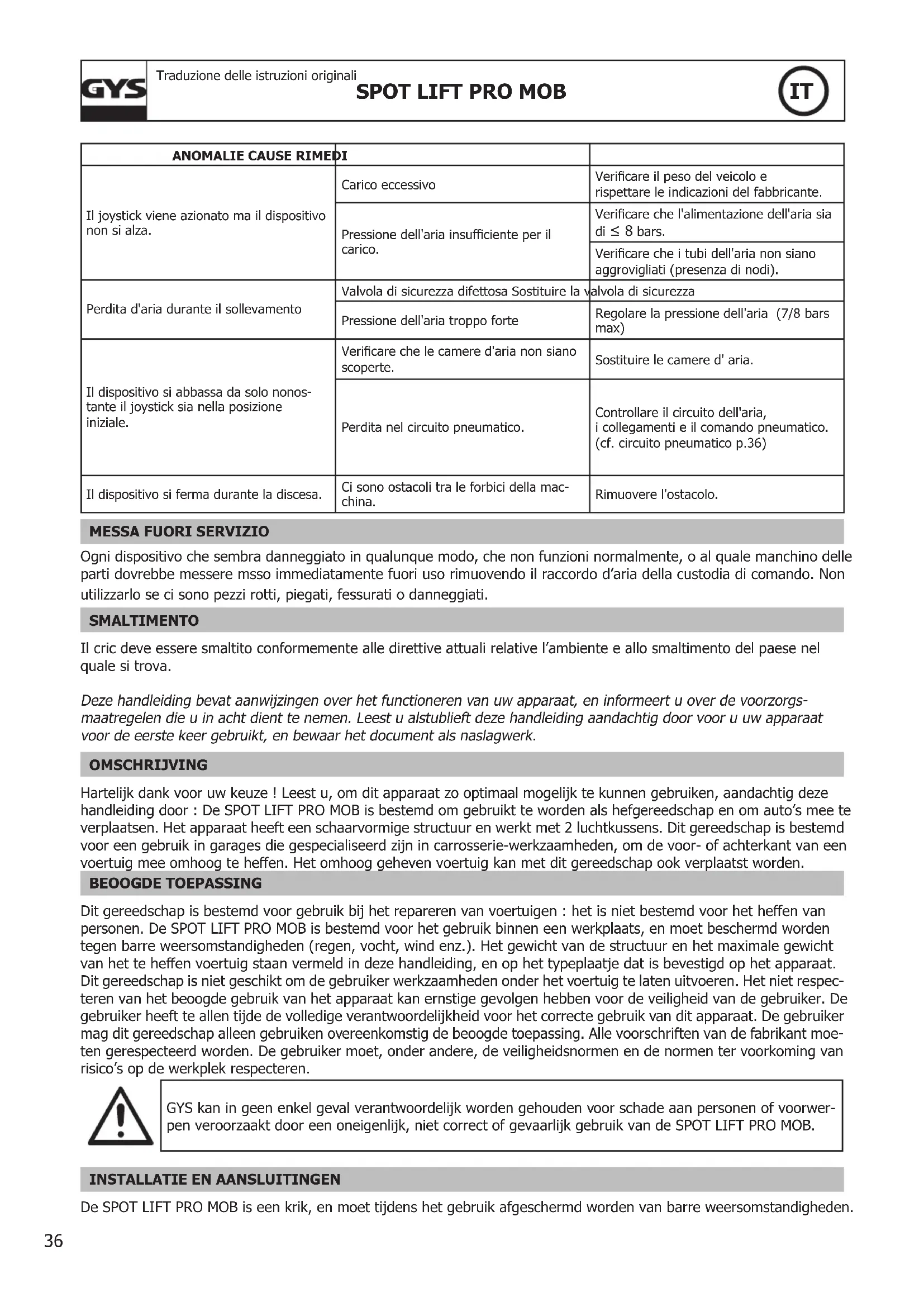 Ogni dispositivo che sembra danneggiato in qualunque modo, che non funzioni normalmente, o al quale manchino delle parti dovrebbe messere msso immediatamente fuori uso rimuovendo il raccordo d’aria della custodia di comando. Non utilizzarlo se ci sono pezzi rotti, piegati, fessurati o danneggiati. SMALTIMENTO Il cric deve essere smaltito conformemente alle direttive attuali relative l’ambiente e allo smaltimento del paese nel quale si trova. Deze handleiding bevat aanwijzingen over het functioneren van uw apparaat, en informeert u over de voorzorgs- maatregelen die u in acht dient te nemen. Leest u alstublieft deze handleiding aandachtig door voor u uw apparaat voor de eerste keer gebruikt, en bewaar het document als naslagwerk. OMSCHRIJVING Hartelijk dank voor uw keuze ! Leest u, om dit apparaat zo optimaal mogelijk te kunnen gebruiken, aandachtig deze handleiding door : De SPOT LIFT PRO MOB is bestemd om gebruikt te worden als hefgereedschap en om auto’s mee te verplaatsen. Het apparaat heeft een schaarvormige structuur en werkt met 2 luchtkussens. Dit gereedschap is bestemd voor een gebruik in garages die gespecialiseerd zijn in carrosserie-werkzaamheden, om de voor- of achterkant van een voertuig mee omhoog te heen. Het omhoog geheven voertuig kan met dit gereedschap ook verplaatst worden. BEOOGDE TOEPASSING Dit gereedschap is bestemd voor gebruik bij het repareren van voertuigen : het is niet bestemd voor het heen van personen. De SPOT LIFT PRO MOB is bestemd voor het gebruik binnen een werkplaats, en moet beschermd worden tegen barre weersomstandigheden (regen, vocht, wind enz.). Het gewicht van de structuur en het maximale gewicht van het te heen voertuig staan vermeld in deze handleiding, en op het typeplaatje dat is bevestigd op het apparaat. Dit gereedschap is niet geschikt om de gebruiker werkzaamheden onder het voertuig te laten uitvoeren. Het niet respec- teren van het beoogde gebruik van het apparaat kan ernstige gevolgen hebben voor de veiligheid van de gebruiker. De gebruiker heeft te allen tijde de volledige verantwoordelijkheid voor het correcte gebruik van dit apparaat. De gebruiker mag dit gereedschap alleen gebruiken overeenkomstig de beoogde toepassing. Alle voorschriften van de fabrikant moe- ten gerespecteerd worden. De gebruiker moet, onder andere, de veiligheidsnormen en de normen ter voorkoming van risico’s op de werkplek respecteren. GYS kan in geen enkel geval verantwoordelijk worden gehouden voor schade aan personen of voorwer- pen veroorzaakt door een oneigenlijk, niet correct of gevaarlijk gebruik van de SPOT LIFT PRO MOB.