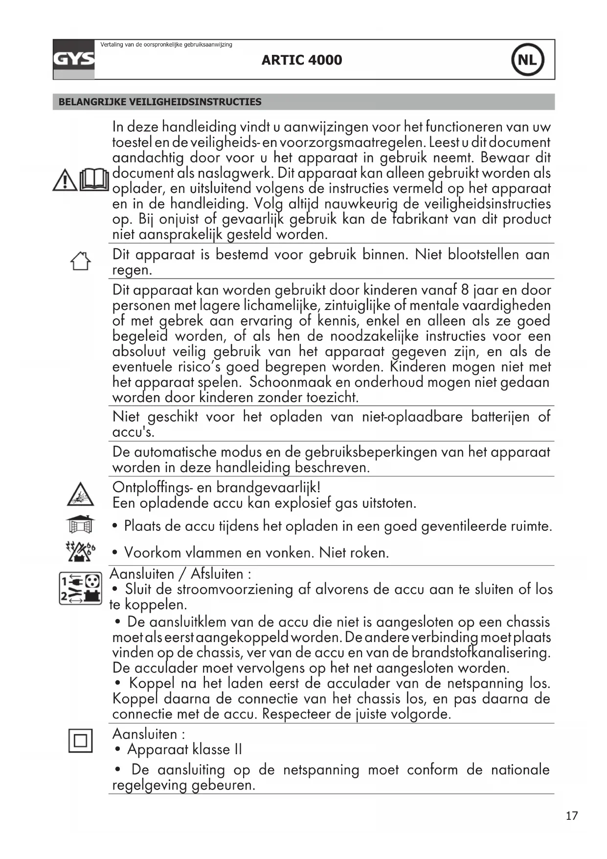 Vertaling van de oorspronkelijke gebruiksaanwijzing BELANGRIJKE VEILIGHEIDSINSTRUCTIES In deze handleiding vindt u aanwijzingen voor het functioneren van uw toestel en de veiligheids- en voorzorgsmaatregelen. Leest u dit document aandachtig door voor u het apparaat in gebruik neemt. Bewaar dit document als naslagwerk. Dit apparaat kan alleen gebruikt worden als oplader, en uitsluitend volgens de instructies vermeld op het apparaat en in de handleiding. Volg altijd nauwkeurig de veiligheidsinstructies op. Bij onjuist of gevaarlijk gebruik kan de fabrikant van dit product niet aansprakelijk gesteld worden. Dit apparaat is bestemd voor gebruik binnen. Niet blootstellen aan regen. Dit apparaat kan worden gebruikt door kinderen vanaf 8 jaar en door personen met lagere lichamelijke, zintuiglijke of mentale vaardigheden of met gebrek aan ervaring of kennis, enkel en alleen als ze goed begeleid worden, of als hen de noodzakelijke instructies voor een absoluut veilig gebruik van het apparaat gegeven zijn, en als de eventuele risico’s goed begrepen worden. Kinderen mogen niet met het apparaat spelen. Schoonmaak en onderhoud mogen niet gedaan worden door kinderen zonder toezicht. Niet geschikt voor het opladen van niet-oplaadbare batterijen of accu's. De automatische modus en de gebruiksbeperkingen van het apparaat worden in deze handleiding beschreven. Ontploffings- en brandgevaarlijk! Een opladende accu kan explosief gas uitstoten.