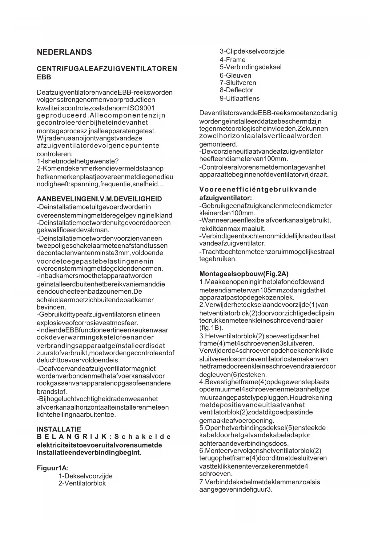INSTALLATIE BELANGRIJK: Schakel de elektriciteitstoevoer uit alvorens u met de installatie en de verbinding begint. Figuur 1A: Voor een efficiënt gebruik van de afzuigventilator: Montage als opbouw (Fig. 2A) De afzuigventilatoren van de EBB-reeks worden volgens strenge normen voor productie en kwaliteitscontrole zoals de norm ISO 9001 geproduceerd. Alle componenten zijn gecontroleerd en bij het einde van het montageproces zijn alle apparaten getest. Wij raden u aan bij ontvangst van deze afzuigventilator de volgende punten te controleren: