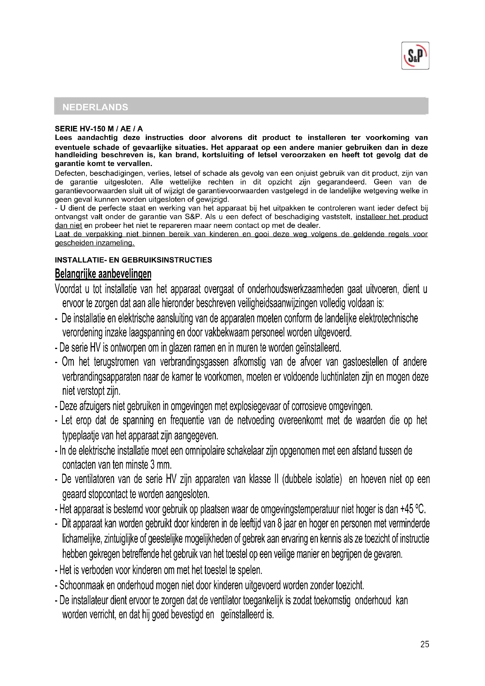 Lees aandachtig deze instructies door alvorens dit product te installeren ter voorkoming van eventuele schade of gevaarlijke situaties. Het apparaat op een andere manier gebruiken dan in deze handleiding beschreven is, kan brand, kortsluiting of letsel veroorzaken en heeft tot gevolg dat de garantie komt te vervallen. Defecten, beschadigingen, verlies, letsel of schade als gevolg van een onjuist gebruik van dit product, zijn van de garantie uitgesloten. Alle wettelijke rechten in dit opzicht zijn gegarandeerd. Geen van de garantievoorwaarden sluit uit of wijzigt de garantievoorwaarden vastgelegd in de landelijke wetgeving welke in geen geval kunnen worden uitgesloten of gewijzigd. - U dient de perfecte staat en werking van het apparaat bij het uitpakken te controleren want ieder defect bij ontvangst valt onder de garantie van S&P. Als u een defect of beschadiging vaststelt, installeer het product dan niet en probeer het niet te repareren maar neem contact op met de dealer. Laat de verpakking niet binnen bereik van kinderen en gooi deze weg volgens de geldende regels voor gescheiden inzameling.