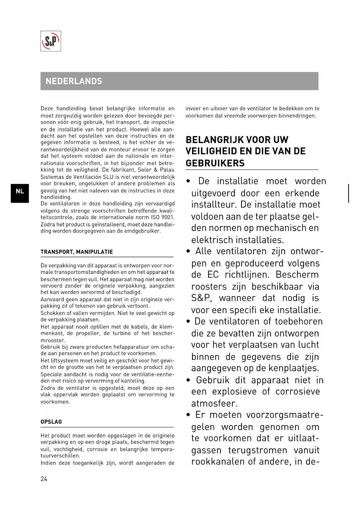 Deze handleiding bevat belangrijke informatie en moet zorgvuldig worden gelezen door bevoegde per- sonen vóór enig gebruik, het transport, de inspectie en de installatie van het product. Hoewel alle aan- dacht aan het opstellen van deze instructies en de gegeven informatie is besteed, is het echter de ve- rantwoordelijkheid van de monteur ervoor te zorgen dat het systeem voldoet aan de nationale en inter- nationale voorschriften, in het bijzonder met betre- kking tot de veiligheid. De fabrikant, Soler & Palau Sistemas de Ventilación SLU is niet verantwoordelijk voor breuken, ongelukken of andere problemen als gevolg van het niet naleven van de instructies in deze handleiding. De ventilatoren in deze handleiding zijn vervaardigd volgens de strenge voorschriften betreffende kwali- teitscontrole, zoals de internationale norm ISO 9001. Zodra het product is geïnstalleerd, moet deze handlei- ding worden doorgegeven aan de eindgebruiker. TRANSPORT, MANIPULATIE De verpakking van dit apparaat is ontworpen voor nor- male transportomstandigheden en om het apparaat te beschermen tegen vuil. Het apparaat mag niet worden vervoerd zonder de originele verpakking, aangezien het kan worden vervormd of beschadigd. Aanvaard geen apparaat dat niet in zijn originele ver- pakking zit of tekenen van gebruik vertoont. Schokken of vallen vermijden. Niet te veel gewicht op de verpakking plaatsen. Het apparaat nooit optillen met de kabels, de klem- menkast, de propeller, de turbine of het bescher- mrooster. Gebruik bij zware producten hefapparatuur om scha- de aan personen en het product te voorkomen. Het liftsysteem moet veilig en geschikt voor het gewi- cht en de grootte van het te verplaatsen product zijn. Speciale aandacht is nodig voor de ventilatie-eenhe- den met risico op vervorming of kanteling. Zodra de ventilator is opgesteld, moet deze op een vlak oppervlak worden geplaatst om vervorming te voorkomen. OPSLAG Het product moet worden opgeslagen in de originele verpakking en op een droge plaats, beschermd tegen vuil, vochtigheid, corrosie en belangrijke tempera- tuurverschillen. Indien deze toegankelijk zijn, wordt aangeraden de NEDERLANDS invoer en uitvoer van de ventilator te bedekken om te voorkomen dat vreemde voorwerpen binnendringen.