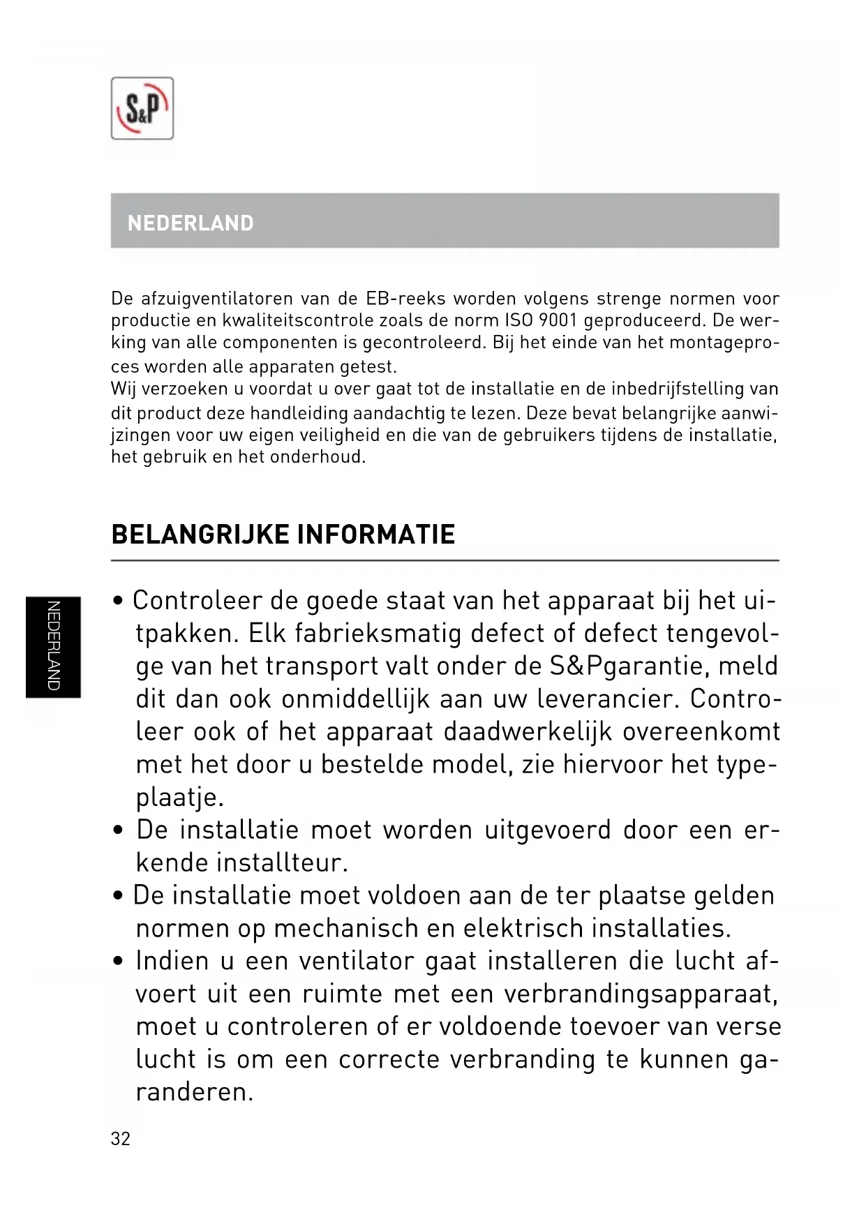 - Controleer de goede staat van het apparaat bij het ui- tpakken. Elk fabrieksmatig defect of defect tengevol- ge van het transport valt onder de S&Pgarantie, meld dit dan ook onmiddellijk aan uw leverancier. Contro- leer ook of het apparaat daadwerkelijk overeenkomt met het door u bestelde model, zie hiervoor het type- plaatje.
