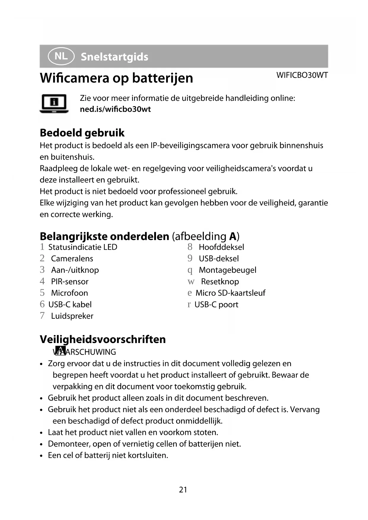 Snelstartgids Wicamera op batterijen WIFICBO30WTZie voor meer informatie de uitgebreide handleiding online: ned.is/wicbo30wt Bedoeld gebruik Het product is bedoeld als een IP-beveiligingscamera voor gebruik binnenshuis en buitenshuis.Raadpleeg de lokale wet- en regelgeving voor veiligheidscamera's voordat u deze installeert en gebruikt.Het product is niet bedoeld voor professioneel gebruik.Elke wijziging van het product kan gevolgen hebben voor de veiligheid, garantie en correcte werking. Belangrijkste onderdelen (afbeelding A) 1 Statusindicatie LED 2 Cameralens 3 Aan-/uitknop 4 PIR-sensor 5 Microfoon 6 USB-C kabel 7 Luidspreker 8 Hoofddeksel 9 USB-deksel q Montagebeugel w Resetknop e Micro SD-kaartsleuf r USB-C poort Veiligheidsvoorschriften
