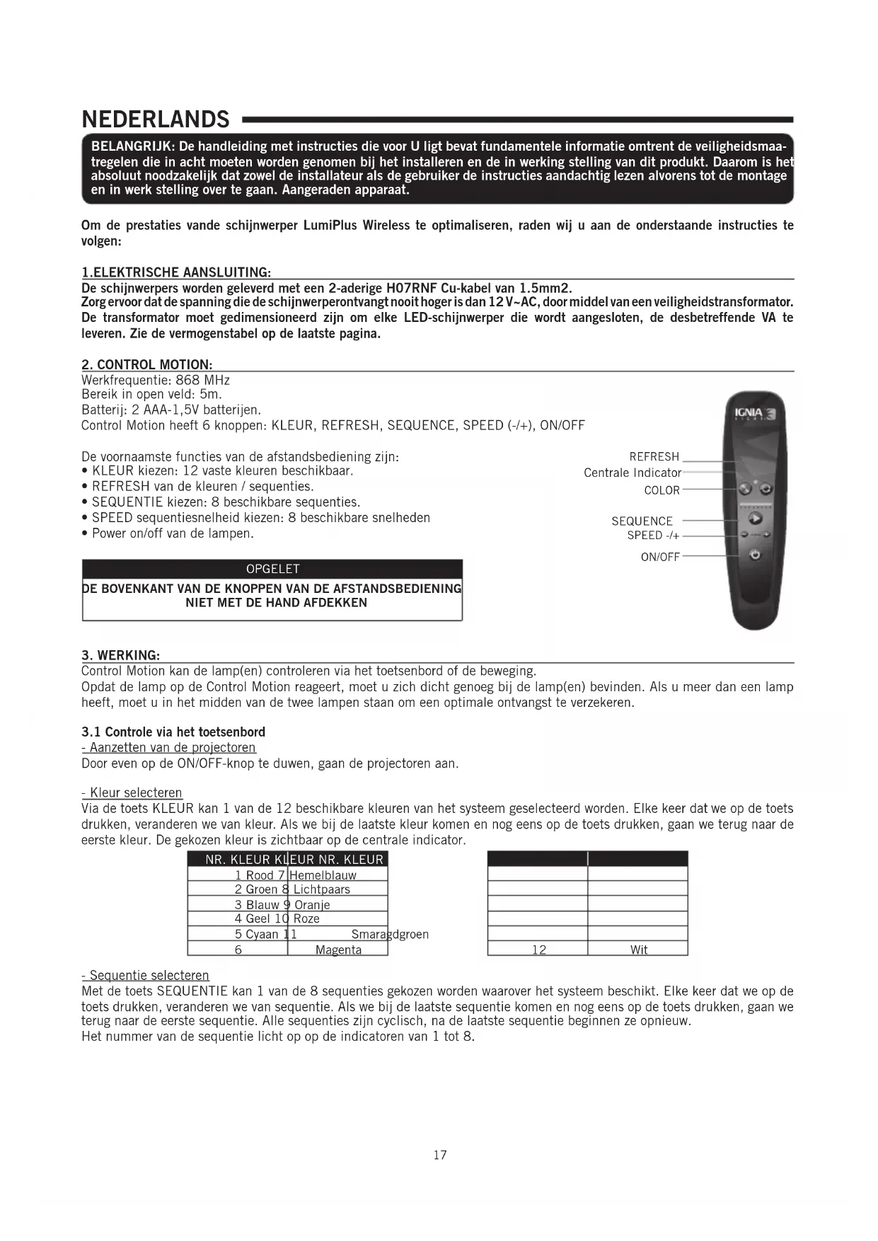 Via de toets KLEUR kan 1 van de 12 beschikbare kleuren van het systeme geseleed worden. Elke keer dat we op de toets drukken, veranderen we van kleur. Als we bij de lastste kleur komen en nog eens op de toets drukken, gaan we terug waar de eerste kleur. De gekozen kleur is zichtaar op de centrale indicator.