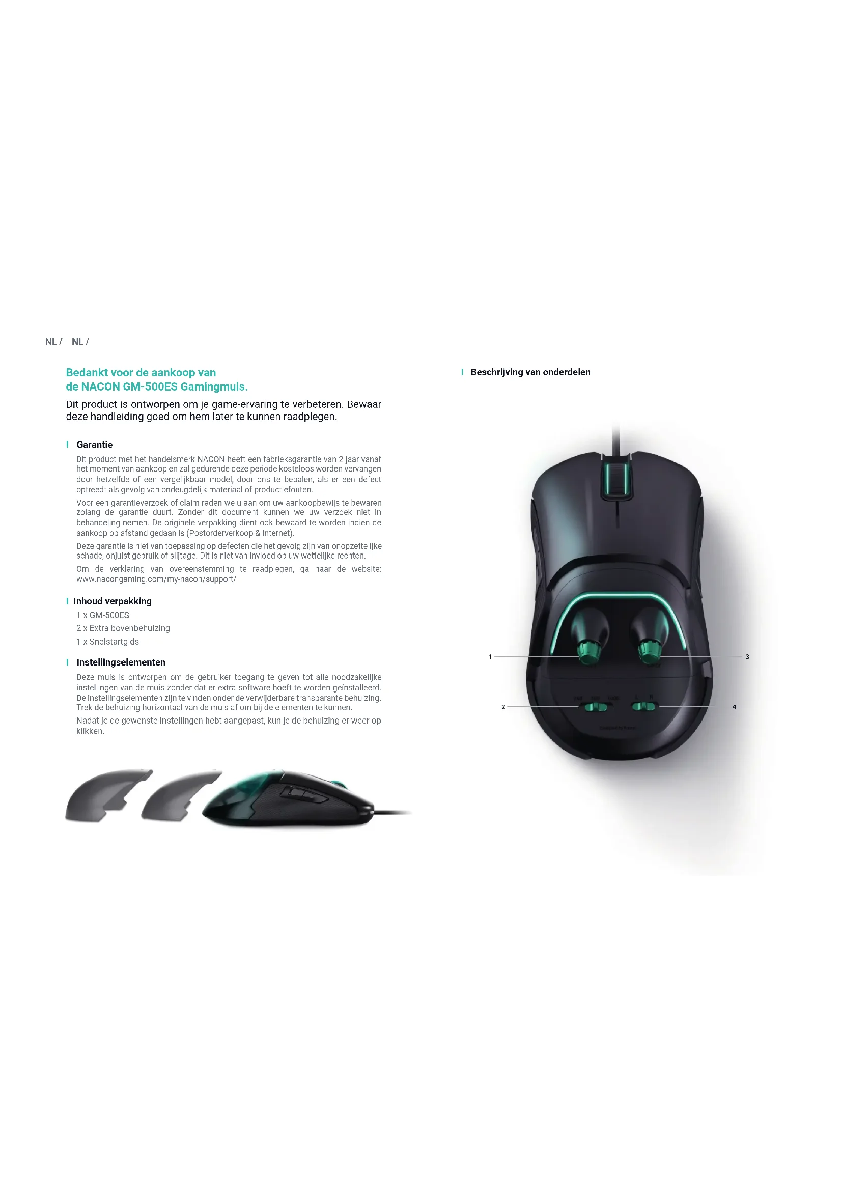 4NL / NL / 1 De resolutie aanpassen De resolutie van de muissensor bepaalt hoe snel en nauwkeurig deze reageert op de bewegingen van de muis. Met dit wieltje pas je die instelling aan. Als je aan het wieltje draait, begint het lichteffect op de muis te knipperen om de verandering van de resolutie aan te geven. Zolang het knippert, geeft de kleur van het licht de gekozen resolutie aan. Geel: 400 dpi Paars: 600 dpi Blauw: 800 dpi Groen: 1200 dpi Rood: 2000 dpi Lichtblauw: 4000 dpi Wit: 5000 dpi Als je de gewenste resolutie hebt gekozen, stopt het lampje na 3 seconden met knipperen. Het krijgt dan weer de oorspronkelijke backlightkleur. Dat betekent dat het selectieproces is afgerond. 2 De pollfrequentie aanpassen De pollfrequentie van een USB-apparaat bepaalt hoe vaak de pc een gegevensupdate vraagt (in dit geval de muispositie en stand van de knoppen) van een aangesloten apparaat. De gebruikelijke USB-pollfrequentie is 250 Hz, maar je kunt deze verhogen als je meer wilt dan de standaardspecicaties voor USB. De opties zijn: - 250 Hz: elke 4 ms een USB-gegevenspakket verzonden (standaard voor USB) - 500 Hz: elke 2 ms een USB-gegevenspakket verzonden - 1000 Hz: elke milliseconde een USB-gegevenspakket verzonden 3 De kleur van het lichteffect aanpassen Met dit wieltje kun je de kleur van de lichteffecten op de muis kiezen. 4 Schakelen tussen links- en rechtshandige instelling De schakelaar 'L/R' activeert de twee extra knoppen aan de linker- of de rechterkant van de muis. De niet-geselecteerde knoppen worden dan gedeactiveerd. I Bovenbehuizingen Deze muis wordt geleverd met in totaal drie bovenbehuizingen. Deze behuizingen beschermen niet alleen het gedeelte met de instellingselementen, maar zijn ook uitgevoerd in verschillende maten en vormen. Zo kun je de muis tot op zekere hoogte aanpassen aan de grootte en vorm van je hand. I Je muis gebruiken Deze muis is een plug-and-play-apparaat. Dat houdt in dat er geen extra drivers nodig zijn. Sluit hem simpelweg aan op een lege USB-poort en geniet! Recycling Dit product mag niet worden verwijderd met het normale huishoudelijke afval. Lever het in bij een speciaal inzamelpunt. Recycling is belangrijk en helpt het milieu beschermen door de beperking van de hoeveelheid afval. - Gebruik het lipje aan weerszijden van de behuizing aan de achterkant om het achterste blok eenvoudig te verwijderen. - Klik de behuizing op de juiste plaats om het achterste blok terug op de muis te plaatsen.NL / www.nacongaming.com naconbenelux NacongamingBenelux Nacon International I Belangrijkeveiligheids-envoorzorgsmaatregelen 1/ Dit apparaat is uitsluitend bestemd voor gebruik binnenshuis. Stel het nooit bloot aan direct zonlicht of vocht. 2/ Niet blootstellen aan spatten. Niet onderdompelen in vloeistof. 3/ Niet blootstellen aan stof, hoge temperaturen of mechanische schokken. 4/ Niet gebruiken als het apparaat beschadigd is. Als u het product demonteert, verlies je onmiddellijk je garantie. 5/ Gebruik uitsluitend een zachte, schone, vochtige doek om de buitenkant te reini- gen. Schoonmaakmiddelen kunnen de afwerking beschadigen en naar binnen lekken. 6/ Til het product nooit op aan het snoer. 7/ Dit apparaat is niet ontworpen voor gebruik door personen (onder wie kinderen) met lichamelijke, zintuiglijke of verstandelijke beperkingen of door personen zonder voldoende ervaring of kennis, tenzij zij vooraf van iemand die verantwoordelijk is voor hun veiligheid begeleiding of instructies hebben ontvangen met betrekking tot het gebruik van het apparaat. Houd dit apparaat buiten bereik van kinderen. I Ergonomie Als je je hand lange tijd in dezelfde positie houdt, kan dit leiden tot pijnklachten. Raadpleeg een arts als dit vaker gebeurt. We raden je aan uit voorzorg elk uur een kwartier pauze te nemen. I Technische helpdesk Email : naconbenelux@bigben-interactive.nl In Nederland gedistribueerd door: Bigben Interactive Nederland B.V ’s-Gravelandseweg 80 1217 EW Hilversum www.nacongaming.com Email : naconbenelux@bigben-interactive.be In België gedistribueerd door: Bigben Interactive Belgium S.A./N.V. Waterloo Ofce Park / Bâtiment H Drève Richelle 161 bte 15, 1410 Waterloo, Belgium www.nacongaming.comES / ES / Gracias por comprar el ratón para videojuegos NACON GM-500ES. Este producto ha sido diseñado para mejorar tu experiencia de juego. Por favor, conserva este manual de instrucciones para futura referencia. I Garantía Este producto con la marca registrada NACON está garantizado por el fabricante durante un periodo de 2 años a partir de la fecha de compra, y durante este periodo se sustituirá de forma gratuita por el mismo modelo u otro similar, a nuestra discreción, si existe un defecto debido a deciencias del material o la fabricación. Para cualquier solicitud o reclamación de garantía, conserva la prueba de compra mientras dure la garantía. Sin dicho documento, no podremos procesar tu solicitud. Además, debe conservar el embalaje original de cualquier compra a distancia (venta por catálogo e Internet). Esta garantía no cubre defectos producidos por daños accidentales, uso indebido o desgaste. Esto no afecta a tus derechos legales. Para acceder a la Declaración de conformidad, consulta el sitio: www.nacongaming. com/es/my-nacon/soporte/ I Contenido del paquete 1 GM-500ES 2 cubiertas adicionales 1 guía rápida I Elementos de control Este ratón ha sido diseñado para ofrecer al usuario acceso a todos los ajustes necesarios del ratón sin obligarlo a instalar software adicional. Los elementos de control se encuentran bajo la cubierta desmontable transparente. Solo hay que tirar de la cubierta en horizontal para retirarla del ratón y mostrar los elementos. Después de cambiar los ajustes que quieras, puedes volver a ajustar la cubierta. I Descripción de los elementos