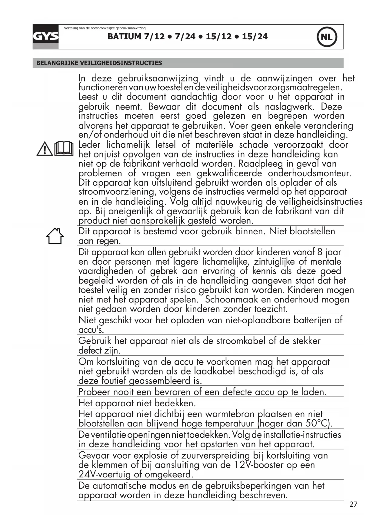 Vertaling van de oorspronkelijke gebruiksaanwijzing BELANGRIJKE VEILIGHEIDSINSTRUCTIES In deze gebruiksaanwijzing vindt u de aanwijzingen over het functioneren van uw toestel en de veiligheidsvoorzorgsmaatregelen. Leest u dit document aandachtig door voor u het apparaat in gebruik neemt. Bewaar dit document als naslagwerk. Deze instructies moeten eerst goed gelezen en begrepen worden alvorens het apparaat te gebruiken. Voer geen enkele verandering en/of onderhoud uit die niet beschreven staat in deze handleiding. Leder lichamelijk letsel of materiële schade veroorzaakt door het onjuist opvolgen van de instructies in deze handleiding kan niet op de fabrikant verhaald worden. Raadpleeg in geval van problemen of vragen een gekwaliceerde onderhoudsmonteur. Dit apparaat kan uitsluitend gebruikt worden als oplader of als stroomvoorziening, volgens de instructies vermeld op het apparaat en in de handleiding. Volg altijd nauwkeurig de veiligheidsinstructies op. Bij oneigenlijk of gevaarlijk gebruik kan de fabrikant van dit product niet aansprakelijk gesteld worden. Dit apparaat is bestemd voor gebruik binnen. Niet blootstellen aan regen. Dit apparaat kan allen gebruikt worden door kinderen vanaf 8 jaar en door personen met lagere lichamelijke, zintuiglijke of mentale vaardigheden of gebrek aan ervaring of kennis als deze goed begeleid worden of als in de handleiding aangeven staat dat het toestel veilig en zonder risico gebruikt kan worden. Kinderen mogen niet met het apparaat spelen. Schoonmaak en onderhoud mogen niet gedaan worden door kinderen zonder toezicht. Niet geschikt voor het opladen van niet-oplaadbare batterijen of accu's. Gebruik het apparaat niet als de stroomkabel of de stekker defect zijn. Om kortsluiting van de accu te voorkomen mag het apparaat niet gebruikt worden als de laadkabel beschadigd is, of als deze foutief geassembleerd is. Probeer nooit een bevroren of een defecte accu op te laden. Het apparaat niet bedekken. Het apparaat niet dichtbij een warmtebron plaatsen en niet blootstellen aan blijvend hoge temperatuur (hoger dan 50°C). De ventilatie openingen niet toedekken. Volg de installatie-instructies in deze handleiding voor het opstarten van het apparaat. Gevaar voor explosie of zuurverspreiding bij kortsluiting van de klemmen of bij aansluiting van de 12V-booster op een 24V-voertuig of omgekeerd. De automatische modus en de gebruiksbeperkingen van het apparaat worden in deze handleiding beschreven.BATIUM 7/12 • 7/24 • 15/12 • 15/24