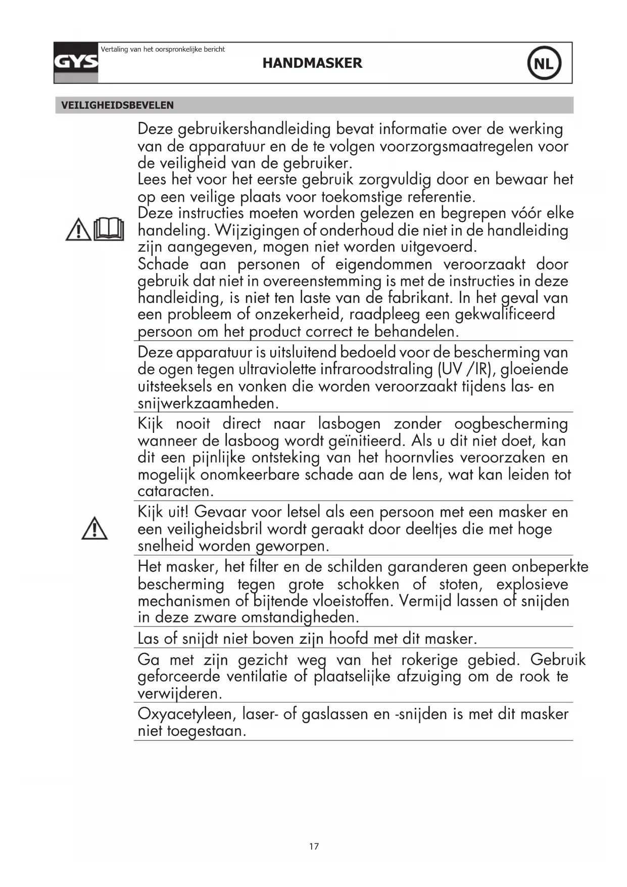Vertaling van het oorspronkelijke bericht VEILIGHEIDSBEVELEN Deze gebruikershandleiding bevat informatie over de werking van de apparatuur en de te volgen voorzorgsmaatregelen voor de veiligheid van de gebruiker. Lees het voor het eerste gebruik zorgvuldig door en bewaar het op een veilige plaats voor toekomstige referentie. Deze instructies moeten worden gelezen en begrepen vóór elke handeling. Wijzigingen of onderhoud die niet in de handleiding zijn aangegeven, mogen niet worden uitgevoerd. Schade aan personen of eigendommen veroorzaakt door gebruik dat niet in overeenstemming is met de instructies in deze handleiding, is niet ten laste van de fabrikant. In het geval van een probleem of onzekerheid, raadpleeg een gekwaliceerd persoon om het product correct te behandelen. Deze apparatuur is uitsluitend bedoeld voor de bescherming van de ogen tegen ultraviolette infraroodstraling (UV /IR), gloeiende uitsteeksels en vonken die worden veroorzaakt tijdens las- en snijwerkzaamheden. Kijk nooit direct naar lasbogen zonder oogbescherming wanneer de lasboog wordt geïnitieerd. Als u dit niet doet, kan dit een pijnlijke ontsteking van het hoornvlies veroorzaken en mogelijk onomkeerbare schade aan de lens, wat kan leiden tot cataracten. Kijk uit! Gevaar voor letsel als een persoon met een masker en een veiligheidsbril wordt geraakt door deeltjes die met hoge snelheid worden geworpen. Het masker, het lter en de schilden garanderen geen onbeperkte bescherming tegen grote schokken of stoten, explosieve mechanismen of bijtende vloeistoffen. Vermijd lassen of snijden in deze zware omstandigheden. Las of snijdt niet boven zijn hoofd met dit masker. Ga met zijn gezicht weg van het rokerige gebied. Gebruik geforceerde ventilatie of plaatselijke afzuiging om de rook te verwijderen. Oxyacetyleen, laser- of gaslassen en -snijden is met dit masker niet toegestaan.18 HANDMASKER