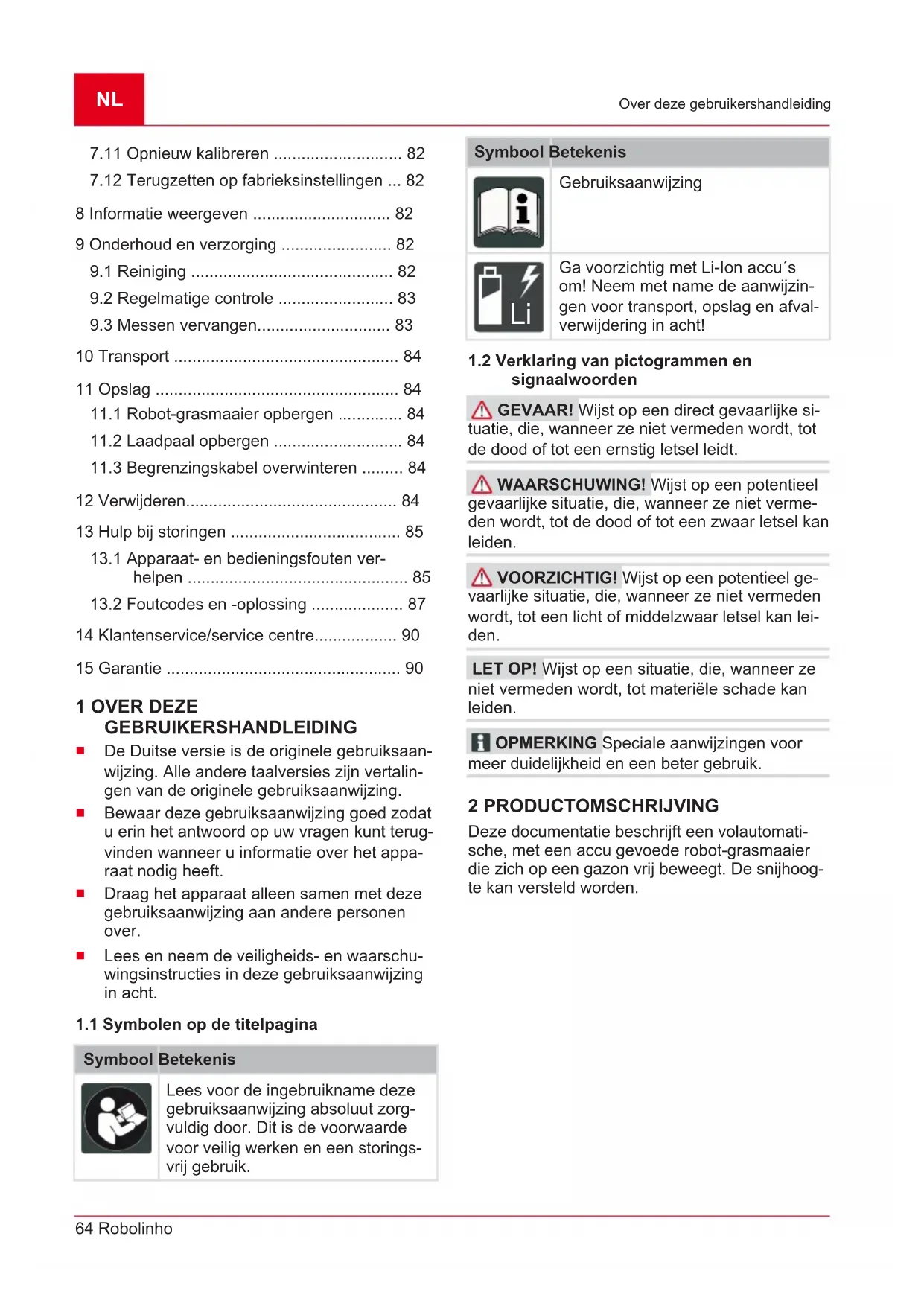 Hoofdmenu Programma Weekprogramma zie Hoofdstuk 7.5 "Maaiprogramma instellen", pagi- na80 Startpunten zie Hoofdstuk 7.5.2 "Startpunten instellen", pagina80 Programma-info zie Hoofdstuk 8 "Informatie weergeven", pagi- na82 Instel- lingen Tijdstip zie Hoofdstuk 5.2 "Basisinstellingen uitvoeren", pagina77 Datum zie Hoofdstuk 5.2 "Basisinstellingen uitvoeren", pagina77 Taal zie Hoofdstuk 5.2 "Basisinstellingen uitvoeren", pagina77 PIN code zie Hoofdstuk 5.2 "Basisinstellingen uitvoeren", pagina77 Geluidssignaal knopbediening zie Hoofdstuk 7.2 "Geluidssig- naal knopbediening activeren/deactiveren", pagina79 EcoMode zie Hoofdstuk 7.3 "Eco-Mode activeren/deactiveren (Robo- linho 700/1200/2000)", pagina79 * Regensensorzie Hoofdstuk 7.4 "Regensensor instellen (Robolinho 700/1200/2000)", pagina79 * Regensensor vertrag. zie Hoofdstuk 7.4 "Regensensor instellen (Robolinho 700/1200/2000)", pagina79* Regengevoelig zie Hoofdstuk 7.4 "Regensensor instellen (Robolin- ho 700/1200/2000)", pagina79* inTOUCH zie Hoofdstuk 7.6 "inTOUCH", pagina81 Randen maaien zie Hoofdstuk 7.7 "Randen maaien bij handmatige start", pagina81 Nevenoppervlak actief/inactief zie Hoofdstuk 7.8 "Maaien van nevenoppervlakken instellen", pagina81 Displaycontrast zie Hoofdstuk 7.9 "Displaycontrast instellen", pa- gina81 Instellingsbescherming zie Hoofdstuk 7.10 "Instellingsbescher- ming", pagina81 Opnieuw kalibreren zie Hoofdstuk 7.11 "Opnieuw kalibreren", pa- gina82 Fabrieksinstellingen zie Hoofdstuk 7.12 "Terugzetten op fa- brieksinstellingen", pagina82 Informa- tie Messenservice zie Hoofdstuk 8 "Informatie weergeven", pagina82 Hardware zie Hoofdstuk 8 "Informatie weergeven", pagina82 Software zie Hoofdstuk 8 "Informatie weergeven", pagina82 Programma-info zie Hoofdstuk 8 "Informatie weergeven", pagi- na82 Storingen zie Hoofdstuk 8 "Informatie weergeven", pagina82