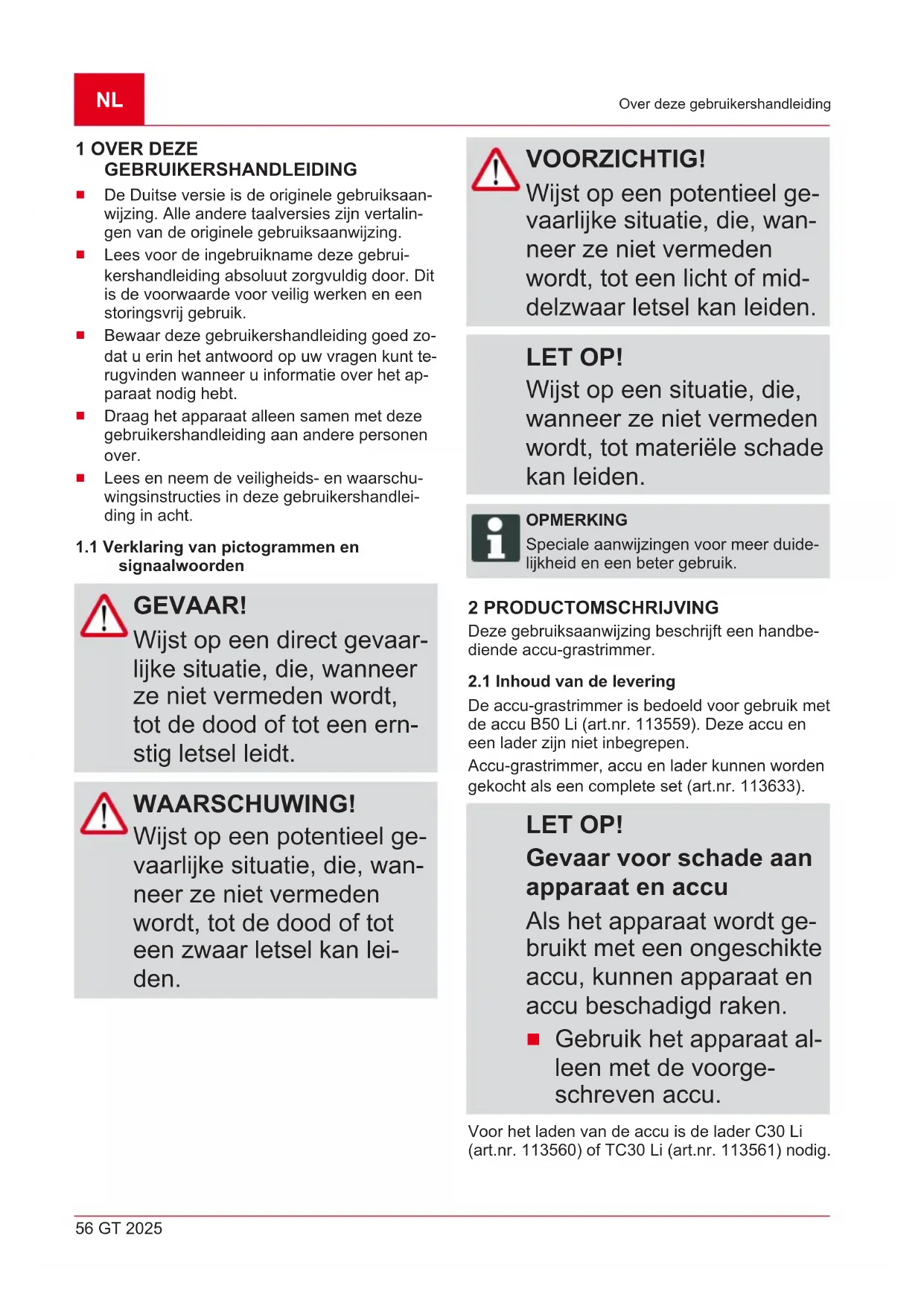 De accu-grastrimmer is bedoeld voor gebruik met de accu B50 Li (art.nr. 113559). Deze accu en een lader zijn niet inbegrepen. Accu-grastrimmer, accu en lader kunnen worden gekocht als een complete set (art.nr. 113633). LET OP! Gevaar voor schade aan apparaat en accu Als het apparaat wordt ge- bruikt met een ongeschikte accu, kunnen apparaat en accu beschadigd raken.