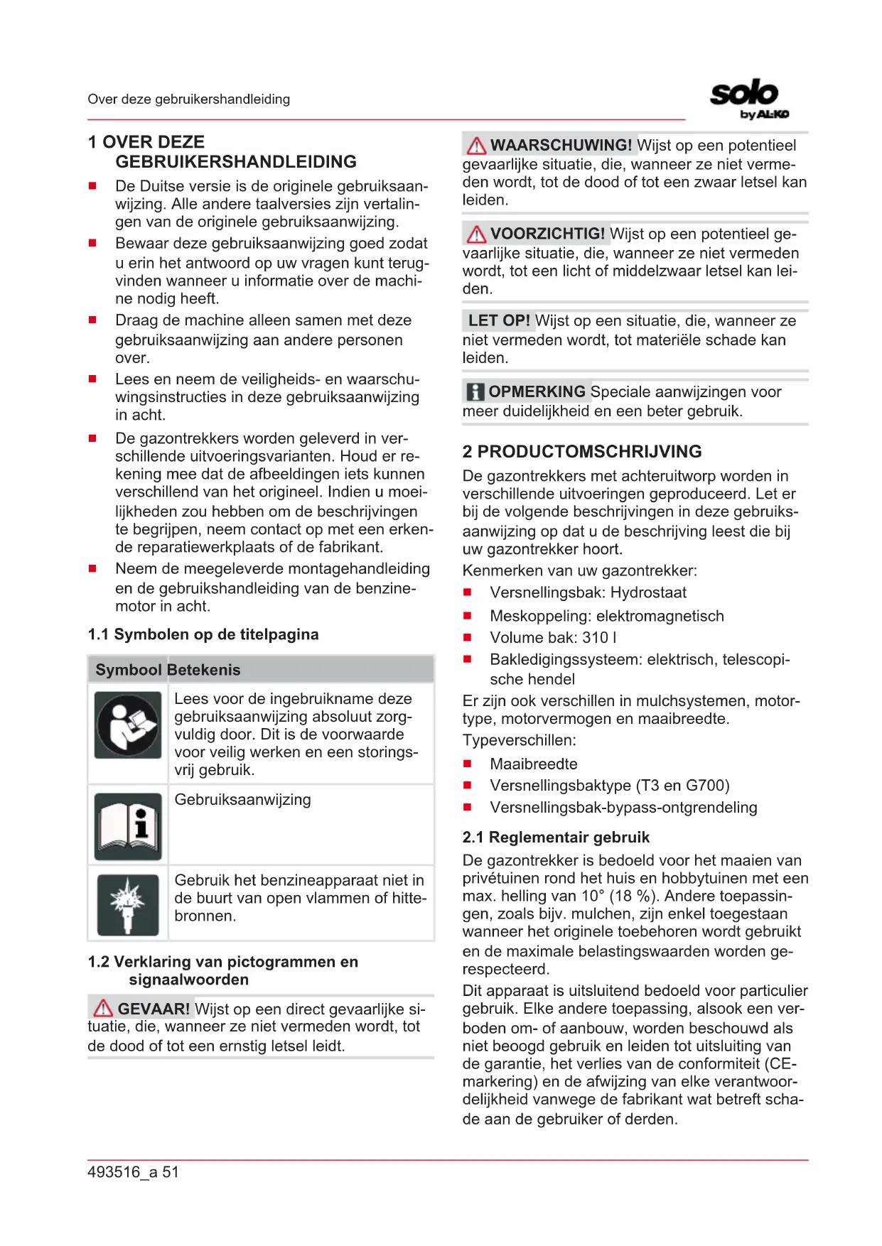 De gazontrekker is bedoeld voor het maaien van privétuinen rond het huis en hobbytuinen met een max. helling van 10° (18%). Andere toepassin- gen, zoals bijv. mulchen, zijn enkel toegestaan wanneer het originele toebehoren wordt gebruikt en de maximale belastingswaarden worden ge- respecteerd. Dit apparaat is uitsluitend bedoeld voor particulier gebruik. Elke andere toepassing, alsook een ver- boden om- of aanbouw, worden beschouwd als niet beoogd gebruik en leiden tot uitsluiting van de garantie, het verlies van de conformiteit (CE- markering) en de afwijzing van elke verantwoor- delijkheid vanwege de fabrikant wat betreft scha- de aan de gebruiker of derden.NL 52 493516_a Productomschrijving