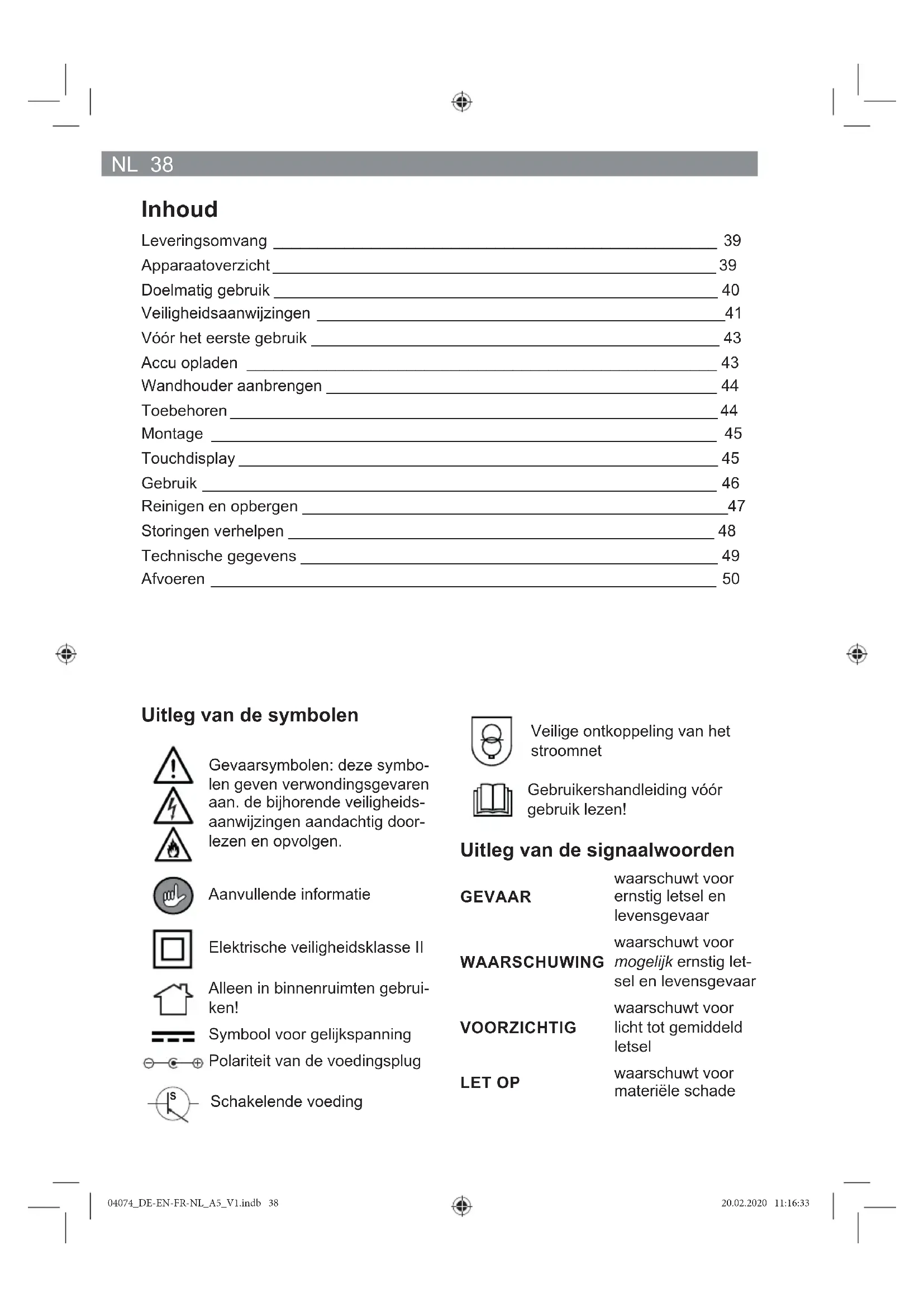 - Het combi-mondstuk (D) en voegenmondstuk (C) kunnen voor het eenvoudig en plaatsbesparend opbergen aan de wandhouder (B) worden bevestigd (afbeelding B). Mocht het apparaat langere tijd niet worden gebruikt, veiligheidshalve de accu (F) eruit halen (zie ‘Accu opladen’). Storingen verhelpen Wanneer het apparaat niet op de juiste wijze functioneert, kunt u nagaan of u een probleem zelf kunt oplossen. Neem contact op met de klantenservice als het probleem met de genoemde stappen niet kan worden opgelost. Probeer niet om een elektrisch apparaat zelf te repareren! Probleem Mogelijke oorzaak Oplossing Het apparaat werkt slechts langzaam of start niet. De accu (F) is leeg. De accu opladen. De zuigkracht is te zwak. De accu (F) is te zwak. De accu opladen. Het stofreservoir (3) is te vol. Het stofreservoir legen. De fi lters zijn vervuild. De fi lters reinigen. De zuigopening (10) is verstopt. Het apparaat uitschakelen en de verstopping verwij- deren. Te grote of zware deel- tjes kunnen aan het tapijt blijven hangen. Verwijder deze vreemde voorwerpen met de hand. 04074_DE-EN-FR-NL_A5_V1.indb 4804074_DE-EN-FR-NL_A5_V1.indb 48 20.02.2020 11:16:3520.02.2020 11:16:3549 NL Probleem Mogelijke oorzaak Oplossing Tijdens het zuigen ontsnapt er stof uit het apparaat. Stofreservoir (3) of fi lters zitten niet goed. Corrigeer de plaatsing van het stofreservoir en fi lters. Zorg ervoor dat het stofre- servoir is gesloten. De fi lters zijn vervuild. De fi lters reinigen. De fi lters zijn versleten of beschadigd. De fi lters vervangen. Het controlelampje van de oplader licht niet op, wanneer het apparaat is aangesloten op het stroomnet. De netvoeding (A) zit niet goed in de contactdoos resp. de voedingsplug zit niet goed in de aansluitbus van de accu (F). De plaatsing corrigeren. De contactdoos is defect. Een andere contactdoos proberen. Vreemde geur. Het apparaat wordt voor de eerste keer gebruikt. Bij het eerste gebruik van het apparaat is een nieuwe geur normaal, die zal met de tijd verdwijnen. Technische gegevens Artikelnummer: 04074 ID gebruikershandleiding: Z 04074 M DS V1 0220 uh Apparaat Modelnummer: HC20Pro Spanningsvoorziening: 22,2 V (li-ion 2000mAh) Vermogen: 160 W Accu Oplaadduur: ca. 4 uur Bedrijfsduur: max. 60 minuten (bij volledig opgeladen accu) Netvoeding Modelnummer: RKGSDC2700500 Ingang: 100 – 240 V ~ 50 / 60 Hz Uitgang: 27 V DC, 500 mA Elektrische veiligheidsklasse: II 04074_DE-EN-FR-NL_A5_V1.indb 4904074_DE-EN-FR-NL_A5_V1.indb 49 20.02.2020 11:16:3520.02.2020 11:16:35NL 50 Afvoeren Verwerk het verpakkingsmateriaal op milieuvriendelijke wijze en breng dit naar een recyclepunt. De accu moet vóór het afvoeren van het apparaat worden verwijderd en moet gescheiden van het apparaat worden afgedankt. Binnen het kader van de milieubescherming mogen batterijen en accu’s niet met het normale huisvuil worden afgevoerd, maar moeten op de betreff ende verzamelpunten worden afgegeven. Dit apparaat valt onder de Europese richtlijn 2012/19/EU voor afgedankte elektrische en elektronische apparatuur (Waste Electrical and Electronical Equipment - WEEE). Dit apparaat mag niet bij het normale huisafval worden gedaan, maar dient milieuvriendelijk verwerkt te worden door een erkend afvalverwerkingsbedrijf. Alle rechten voorbehouden. 04074_DE-EN-FR-NL_A5_V1.indb 5004074_DE-EN-FR-NL_A5_V1.indb 50 20.02.2020 11:16:3520.02.2020 11:16:3504074_DE-EN-FR-NL_A5_V1.indb 5104074_DE-EN-FR-NL_A5_V1.indb 51 20.02.2020 11:16:3620.02.2020 11:16:3604074_DE-EN-FR-NL_A5_V1.indb 5204074_DE-EN-FR-NL_A5_V1.indb 52 20.02.2020 11:16:3620.02.2020 11:16:36