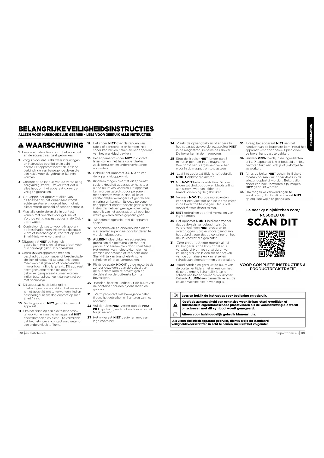 ninjakitchen.eu38 ninjakitchen.eu BELANGRIJKE VEILIGHEIDSINSTRUCTIES ALLEEN VOOR HUISHOUDELIJK GEBRUIK • LEES VOOR GEBRUIK ALLE INSTRUCTIES WAARSCHUWING 1 Lees alle instructies voor u het apparaat en de accessoires gaat gebruiken.2 Zorg ervoor dat u alle waarschuwingen en instructies begrijpt en in acht neemt. Dit apparaat bevat elektrische verbindingen en bewegende delen die een risico voor de gebruiker kunnen vormen.3 Controleer de inhoud van de verpakking zorgvuldig, zodat u zeker weet dat u alles hebt om het apparaat correct en veilig te gebruiken.4 Ontkoppel het apparaat altijd van de toevoer als het onbeheerd wordt achtergelaten en voordat het in of uit elkaar wordt gehaald of schoongemaakt.5 Was alle onderdelen die in contact komen met voedsel voor gebruik af. Volg de reinigingsinstructies in de Quick Start Guide.6 Controleer de spatel voor elk gebruik op beschadigingen. Neem als de spatel krom of beschadigd is, contact op met SharkNinja voor vervanging.7 Dit apparaat NIET buitenshuis gebruiken. Het is enkel ontworpen voor huishoudelijk gebruik binnenshuis.8 Gebruik GEEN apparaten met een beschadigd stroomsnoer of beschadigde stekker, of nadat het apparaat niet goed meer werkt, is gevallen of op een andere manier beschadigd is geraakt. Dit apparaat heeft geen onderdelen die door de gebruiker gerepareerd kunnen worden. Indien beschadigd, neem dan contact op met SharkNinja.9 Dit apparaat heeft belangrijke markeringen op de stekker. Het netsnoer is niet geschikt om te vervangen. Indien beschadigd, neem dan contact op met SharkNinja. 10 Verlengsnoeren NIET gebruiken met dit apparaat.11 Om het risico op een elektrische schok te voorkomen, mag u het apparaat NIET onderdompelen en dient u te vermijden dat het netsnoer in contact met water of een andere vloeistof komt. 12 Het snoer NIET over de randen van tafels of aanrecht laten hangen. Het snoer kan blijven haken en het apparaat van het werkblad trekken.13 Het apparaat of snoer NIET in contact laten komen met hete oppervlaktes, zoals fornuizen en andere verhittende apparaten. 14 Gebruik het apparaat ALTIJD op een droog en vlak oppervlak.15 Kinderen mogen niet met dit apparaat spelen. Houd dit apparaat en het snoer uit de buurt van kinderen. Dit apparaat kan worden gebruikt door personen met beperkte fysieke, zintuiglijke of verstandelijke vermogens of gebrek aan ervaring en kennis, mits deze personen het apparaat onder toezicht gebruiken of instructies hebben gekregen over veilig gebruik van het apparaat en zij begrijpen welke gevaren ermee gepaard gaan.16 Kinderen mogen niet met dit apparaat spelen.17 Schoonmaken en onderhouden dient niet zonder supervisie door kinderen te worden uitgevoerd. 18 ALLEEN hulpstukken en accessoires gebruiken die geleverd zijn met het product of aanbevolen door SharkNinja. Het gebruik van hulpstukken die niet worden aanbevolen of verkocht door SharkNinja kan brand, elektrische schokken of letsel veroorzaken. 19 Plaats de spatel NOOIT op de motorbasis zonder deze eerst aan de deksel van de buitenste kom te bevestigen en de deksel op de buitenste kom te bevestigen. 20 Handen, haar en kleding uit de buurt van de container houden tijdens laden en gebruik.21 Vermijd contact met bewegende delen tijdens het gebruiken en hanteren van het apparaat. 22 Vul de tubes NIET verder dan de MAX FILL lijn, tenzij anders beschreven in het Ninja recept. 23 Het apparaat NIET bedienen met een lege container.24 Plaats de opvangbakken of andere bij het apparaat geleverde accessoires NIET in de magnetron, behalve de ijsbeker. De beker kan in de magnetron. 25 Stop de ijsbeker NIET langer dan 8 minuten per keer in de magnetron. Wacht tot het is afgekoeld voor het weer in de magnetron te plaatsen. 26 Laat het apparaat tijdens het gebruik NOOIT onbeheerd achter. 27 Mix NOOIT hete vloeistoen. Dit kan leiden tot drukopbouw en blootstelling aan stoom, wat kan leiden tot brandwonden bij de gebruiker. 28 Verwerk NOOIT droge ingrediënten zonder een vloeistof aan de ingrediënten in de beker toe te voegen. Het is niet geschikt voor droog mixen.29 NIET gebruiken voor het vermalen van ingrediënten. 30 Het apparaat NOOIT bedienen zonder dat de deksels aangebracht zijn. De vergrendelingen NIET proberen te overbruggen. Zorg er voorafgaand aan het gebruik voor dat de container en het deksel correct zijn geplaatst.31 Zorg ervoor dat voor gebruik al het keukengerei uit de kom of beker is verwijderd. Het niet verwijderen van keukengerei kan leiden tot het breken van de containers en kan letsel en schade aan eigendommen veroorzaken.32 Houd handen en gerei uit de buurt van de container tijdens het mixen, om het risico op ernstig lichamelijk letsel of schade aan het apparaat te voorkomen. Gebruik ALLEEN een pannenlikker als de keukenmachine niet in werking is.33 Draag het apparaat NIET aan het handvat van de buitenste kom. Houd het apparaat vast door beide zijden onder de bovenkant vast te pakken. 34 Verwerk GEEN harde, losse ingrediënten of ijs. Dit apparaat is niet bedoeld om los, bevroren fruit, een blok ijs of ijsklontjes te verwerken.35 Vries de beker NIET schuin in. Bekers moeten op een vlak oppervlakte in de vriezer geplaatst worden. Bekers die onder een hoek bevroren zijn, mogen NIET gebruikt worden.36 Om mogelijke verwondingen te voorkomen, dient u dit apparaat NIET op onjuiste wijze te gebruiken. Ga naar qr.ninjakitchen.com/ NC300EU OF SCAN DIT
