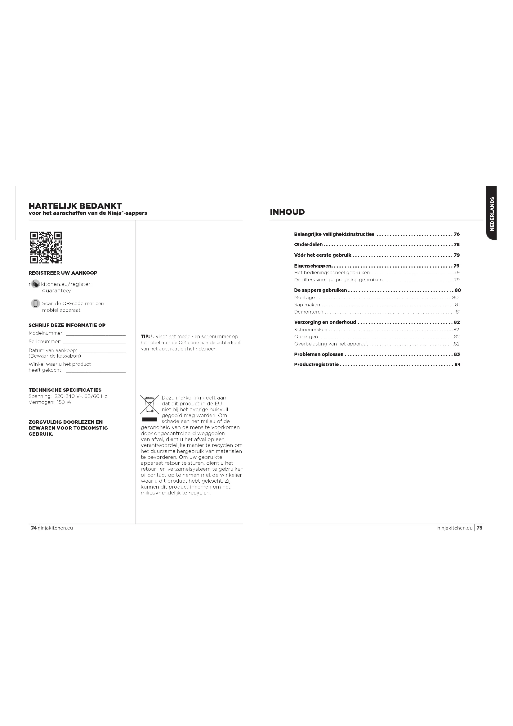 GEBRUIK TECHNISCHE SPECIFICATIES Spanning: 220-240V~, 50/60Hz Vermogen: 150 W NEDERLANDS Deze markering geeft aan dat dit product in de EU niet bij het overige huisvuil gegooid mag worden. Om schade aan het milieu of de gezondheid van de mens te voorkomen door ongecontroleerd weggooien van afval, dient u het afval op een verantwoordelijke manier te recyclen om het duurzame hergebruik van materialen te bevorderen. Om uw gebruikte apparaat retour te sturen, dient u het retour- en verzamelsysteem te gebruiken of contact op te nemen met de winkelier waar u dit product hebt gekocht. Zij kunnen dit product innemen om het milieuvriendelijk te recyclen.77 ninjakitchen.eu 76 ninjakitchen.eu