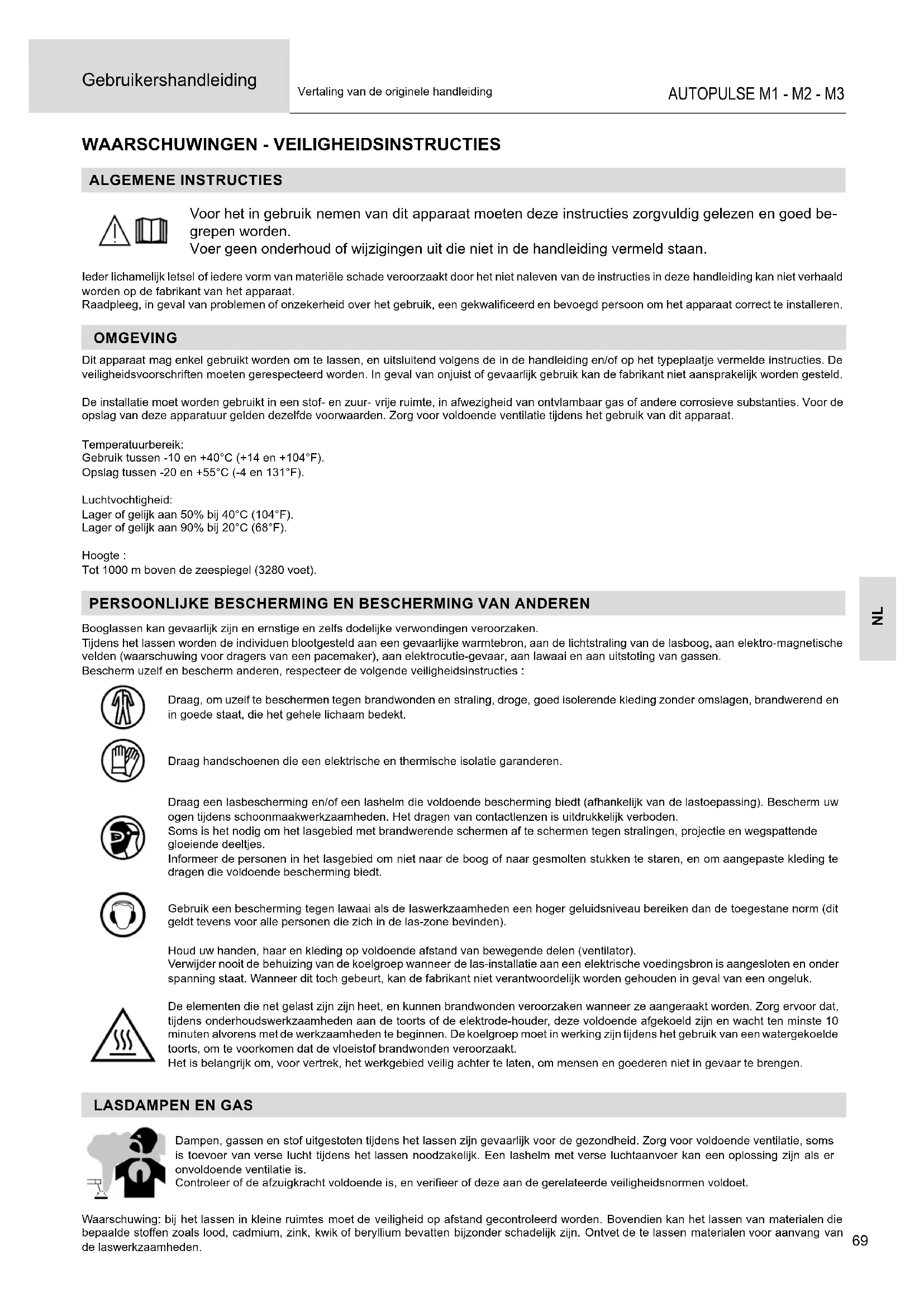 Scherm het lasgebied volledig af, brandbare stoen moeten op minimaal 11 meter afstand geplaatst worden. Een brandblusinstallatie moet aanwezig zijn in de buurt van laswerkzaamheden. Pas op voor projectie van hete onderdelen of vonken, zelfs door kieren heen. Deze kunnen brand of explosies veroorzaken. Houd personen, ontvlambare voorwerpen en containers onder druk op veilige en voldoende afstand. Het lassen in containers of gesloten buizen moet worden verboden, en als ze open zijn dan moeten ze ontdaan worden van ieder ontvlambaar of explosief product (olie, brandstof, gas-residuen....). Slijpwerkzaamheden mogen niet worden gericht naar het lasapparaat, of in de richting van brandbare materialen. GASFLESSEN Het gas dat uit de gasessen komt kan, in geval van hoge concentraties in de lasruimte, verstikking veroorzaken (goed ventileren is absoluut noodzakelijk). Het transport moet absoluut veilig gebeuren : de essen moeten gesloten zijn en de lasstroombron moet uitgeschakeld zijn. De essen moeten verticaal bewaard worden en door een ondersteuning rechtop gehouden worden, om te voorkomen dat ze omvallen. Sluit de essen na ieder gebruik. Let op temperatuurveranderingen en blootstelling aan zonlicht. De es mag niet in contact komen met een vlam, een elektrische boog, een toorts, een massa-klem of een andere warmtebron of gloeiend voorwerp. Houd de es uit de buurt van elektrische circuits en lascircuits, en las nooit een es onder druk. Wees voorzichtig bij het openen van het ventiel van de es, houd uw hoofd ver verwijderd van het ventiel en controleer voor gebruik of het gas geschikt is om mee te lassen. ELEKTRISCHE VEILIGHEID Het elektrische netwerk dat wordt gebruikt moet altijd geaard zijn. Gebruik het op de veiligheidstabel aanbevolen type zekering. Een elektrische schok kan, direct of indirect, ernstige en zelfs dodelijke ongelukken veroorzaken. Raak nooit delen aan de binnen- of buitenkant van de machine aan (toortsen, klemmen, kabels, elektrodes) die onder spanning staan. Deze delen zijn aangesloten op het lascircuit. Koppel, voordat u het lasapparaat opent, dit los van het stroom-netwerk en wacht 2 minuten totdat alle condensatoren ontladen zijn. Raak nooit tegelijkertijd de toorts of de elektrodehouder en de massa-klem aan. Zorg ervoor dat, als de kabels of toortsen beschadigd zijn, deze vervangen worden door gekwaliceerde en bevoegde personen. Gebruik alleen kabels met de geschikte doorsnede. Draag altijd droge, in goede staat verkerende kleren om uzelf van het lascircuit te isoleren. Draag isolerend schoeisel, waar u ook werkt. EMC CLASSIFICATIE VAN HET MATERIAAL (230 V-VERSIE) Dit Klasse A materiaal is niet geschikt voor gebruik in een woonomgeving waar de stroom wordt aangeleverd door een openbaar laagspanningsnet. Het is mogelijk dat er problemen ontstaan met de elektromagnetische compatibiliteit in deze omgevingen, vanwege storingen of radio-frequente straling. Dit materiaal voldoet aan de CEI 61000-3-12 norm. Deze apparatuur is conform aan de norm CEI 61000-3-11 en kan aangesloten worden aan openbare lage spanningsnetwerken, onder voorwaarde dat de impedantie van het openbare lagespanningsnetwerk op het aankoppelingspunt lager is dan Zmax = 0.349 Ohms. Het is de verantwoordelijkheid van de installateur of de gebruiker van het apparaat om zich er van te verzekeren, indien nodig in overleg met de beheerder van het stroomnetwerk, dat de impedantie van het netwerk conform is aan de beperkingen van de impedantie. ELEKTROMAGNETISCHE EMISSIES Elektrische stroom die door geleidend materiaal of kabels gaat veroorzaakt plaatselijk elektrische en magnetische velden (EMF). De lasstroom wekt een elektromagnetisch veld op rondom de laszone en het lasmateriaal. De elektromagnetische velden (EMF) kunnen de werking van bepaalde medische apparaten, zoals pacemakers, verstoren. Voor mensen met medische implantaten moeten speciale veiligheidsmaatregelen in acht genomen worden. Bijvoorbeeld : toegangsbeperking voor voorbijgangers, of een individuele risico-evaluatie voor de lassers.NL