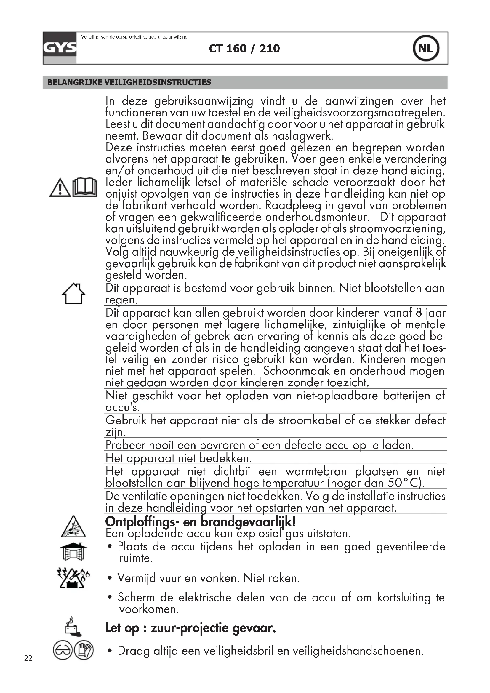 Vertaling van de oorspronkelijke gebruiksaanwijzing BELANGRIJKE VEILIGHEIDSINSTRUCTIES In deze gebruiksaanwijzing vindt u de aanwijzingen over het functioneren van uw toestel en de veiligheidsvoorzorgsmaatregelen. Leest u dit document aandachtig door voor u het apparaat in gebruik neemt. Bewaar dit document als naslagwerk. Deze instructies moeten eerst goed gelezen en begrepen worden alvorens het apparaat te gebruiken. Voer geen enkele verandering en/of onderhoud uit die niet beschreven staat in deze handleiding. Ieder lichamelijk letsel of materiële schade veroorzaakt door het onjuist opvolgen van de instructies in deze handleiding kan niet op de fabrikant verhaald worden. Raadpleeg in geval van problemen of vragen een gekwalificeerde onderhoudsmonteur. Dit apparaat kan uitsluitend gebruikt worden als oplader of als stroomvoorziening, volgens de instructies vermeld op het apparaat en in de handleiding. Volg altijd nauwkeurig de veiligheidsinstructies op. Bij oneigenlijk of gevaarlijk gebruik kan de fabrikant van dit product niet aansprakelijk gesteld worden. Dit apparaat is bestemd voor gebruik binnen. Niet blootstellen aan regen. Dit apparaat kan allen gebruikt worden door kinderen vanaf 8 jaar en door personen met lagere lichamelijke, zintuiglijke of mentale vaardigheden of gebrek aan ervaring of kennis als deze goed be- geleid worden of als in de handleiding aangeven staat dat het toes- tel veilig en zonder risico gebruikt kan worden. Kinderen mogen niet met het apparaat spelen. Schoonmaak en onderhoud mogen niet gedaan worden door kinderen zonder toezicht. Niet geschikt voor het opladen van niet-oplaadbare batterijen of accu's. Gebruik het apparaat niet als de stroomkabel of de stekker defect zijn. Probeer nooit een bevroren of een defecte accu op te laden. Het apparaat niet bedekken. Het apparaat niet dichtbij een warmtebron plaatsen en niet blootstellen aan blijvend hoge temperatuur (hoger dan 50°C). De ventilatie openingen niet toedekken. Volg de installatie-instructies in deze handleiding voor het opstarten van het apparaat. Ontplofngs- en brandgevaarlijk! Een opladende accu kan explosief gas uitstoten.