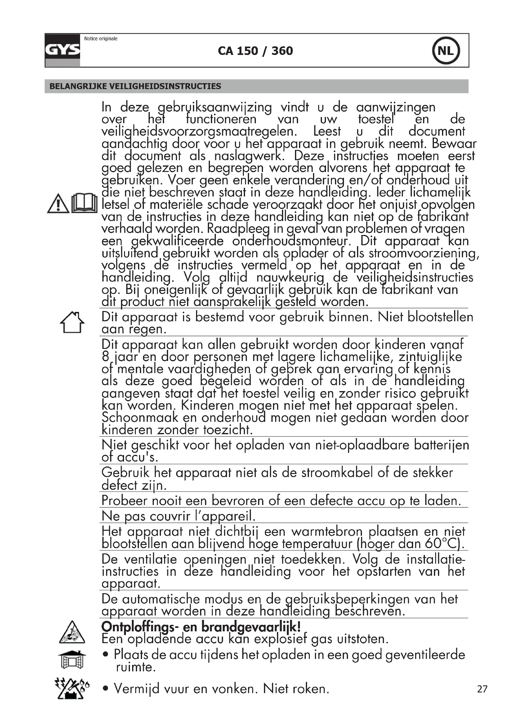 Notice originale OPMERKINGEN ◊ Het opladen van een accu Koppel alle elektronische systeem tijdens het opladen van de accu los (de accu niet opladen wanneer aangesloten aan het voertuig). ◊ Opstarten Start de motor nooit aan als de lader aangesloten is. Zo kunt u de zekering te verbranden. ◊ Afwijkingen Te snel laden kan een storing veroorzaken: - de zekering verbrandt en stopt het laden. - OK LED-verlichting gaat aan zonder dat de accu opgeladen is en hij klikt en gaat regelmatig uit. In dit geval moet u het apparaat aanzet na het kiezen van een lagere laad snelheid. ◊ Thermische beveiliging De transformator van uw apparaat is uitgerust met een thermostaat. Als hij de warmte niet kwijt kan, stopt hij met werken. Zet het apparaat op een goed geventileerde locatie, wacht tot het afkoelt is en herhaal het laad proces (wacht ongeveer ¼ uur). Zekeringen In de volgende gevallen gaat de zekering met het beveiligen van uw toestel door: polariteitomwisseling of de kostsluiting - aan de accu pollen. - opstarten van het voertuig met de aangesloten accu. - de laadstroom te lang of te sterk in de boost positie of hoger dan de nominale stroom in de standaard laad positie . Als de zekering kapot is, koppel de klemmen van de accu los, zet de schakelaar in de uit-stand, vervang de zekering, zet op de minimale laad snelheid en beginnen opnieuw met het hierboven beschreven proces. CA 150 CA 360 Primary fuse (No Gys reference for sells) Cylindrical 5×20mm - T3.15A Littelfuse reference : 02153.15MXP (No Gys reference for sells) Cylindrical 5× 20mm - T5A Littelfuse reference : 0215005.MXP Secondary fuse Gys reference : 054516 Type : ATOF blade - 25A Littelfuse reference : 287025.PXPV Gys reference : 054622 Type: BF1 – M5 - 32V 50A Littelfuse reference : 153.5631.5502 ◊ Gesulfateerde accu Het is soms mogelijk deze accu’s, die te lang niet onderhouden zijn, weer op te laden. Men kan dit type accu herken- nen wanneer tijdens het laden de naald van de ampèremeter niet beweegt (blijft op 0 staan), of als in de automa- tische module de lader snel uitschakelt. Schakel in dat geval over naar de handmatige «Manuel» module (CA 360), en zet de schakelaar op de hoogste stand. Controleer de lader ieder uur. Als na 5 uur de naald nog steeds niet beweegt is de accu denitief buiten gebruik.
