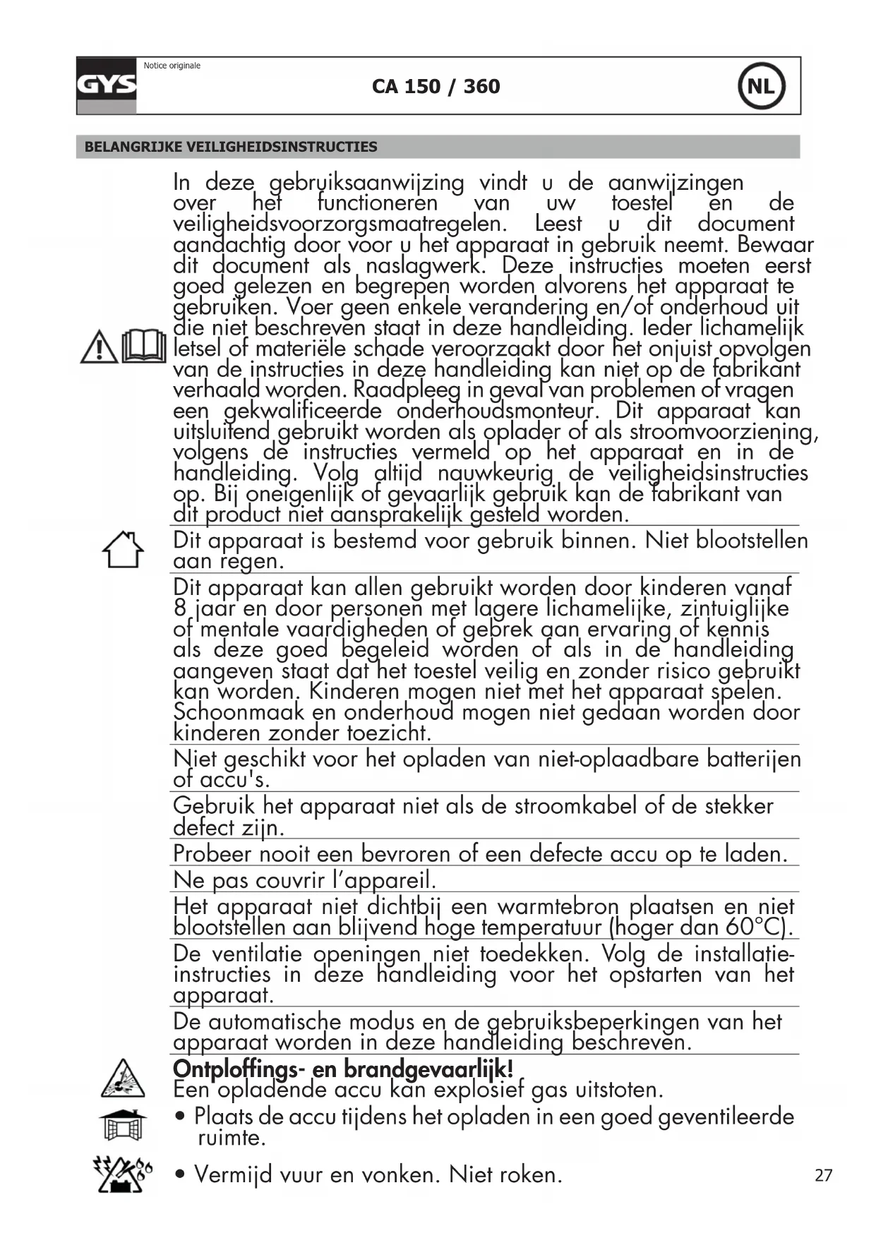 Notice originale BELANGRIJKE VEILIGHEIDSINSTRUCTIES In deze gebruiksaanwijzing vindt u de aanwijzingen over het functioneren van uw toestel en de veiligheidsvoorzorgsmaatregelen. Leest u dit document aandachtig door voor u het apparaat in gebruik neemt. Bewaar dit document als naslagwerk. Deze instructies moeten eerst goed gelezen en begrepen worden alvorens het apparaat te gebruiken. Voer geen enkele verandering en/of onderhoud uit die niet beschreven staat in deze handleiding. Ieder lichamelijk letsel of materiële schade veroorzaakt door het onjuist opvolgen van de instructies in deze handleiding kan niet op de fabrikant verhaald worden. Raadpleeg in geval van problemen of vragen een gekwaliceerde onderhoudsmonteur. Dit apparaat kan uitsluitend gebruikt worden als oplader of als stroomvoorziening, volgens de instructies vermeld op het apparaat en in de handleiding. Volg altijd nauwkeurig de veiligheidsinstructies op. Bij oneigenlijk of gevaarlijk gebruik kan de fabrikant van dit product niet aansprakelijk gesteld worden. Dit apparaat is bestemd voor gebruik binnen. Niet blootstellen aan regen. Dit apparaat kan allen gebruikt worden door kinderen vanaf 8 jaar en door personen met lagere lichamelijke, zintuiglijke of mentale vaardigheden of gebrek aan ervaring of kennis als deze goed begeleid worden of als in de handleiding aangeven staat dat het toestel veilig en zonder risico gebruikt kan worden. Kinderen mogen niet met het apparaat spelen. Schoonmaak en onderhoud mogen niet gedaan worden door kinderen zonder toezicht. Niet geschikt voor het opladen van niet-oplaadbare batterijen of accu's. Gebruik het apparaat niet als de stroomkabel of de stekker defect zijn. Probeer nooit een bevroren of een defecte accu op te laden. Ne pas couvrir l’appareil. Het apparaat niet dichtbij een warmtebron plaatsen en niet blootstellen aan blijvend hoge temperatuur (hoger dan 60°C). De ventilatie openingen niet toedekken. Volg de installatie- instructies in deze handleiding voor het opstarten van het apparaat. De automatische modus en de gebruiksbeperkingen van het apparaat worden in deze handleiding beschreven. Ontploffings- en brandgevaarlijk! Een opladende accu kan explosief gas uitstoten.