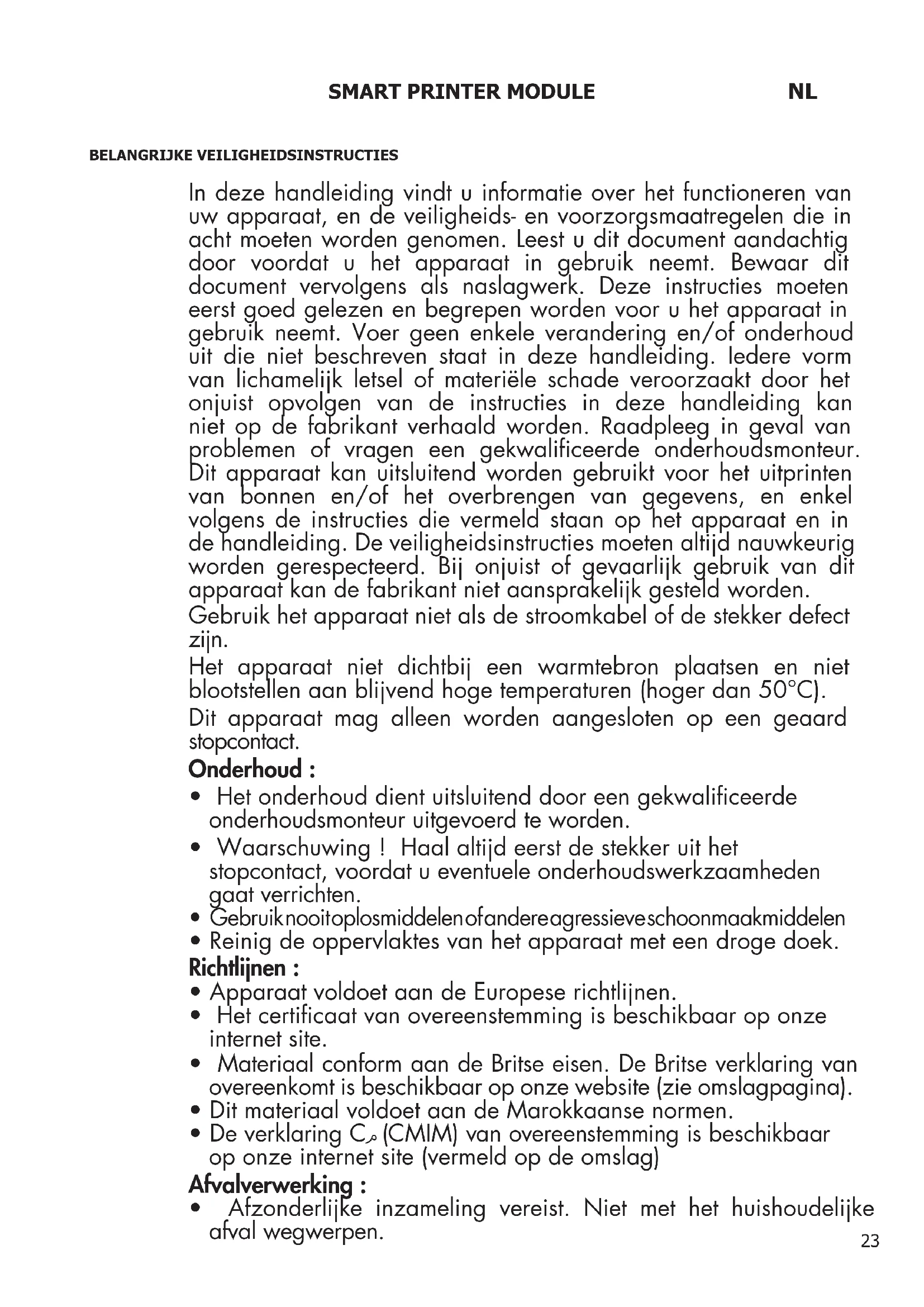 BELANGRIJKE VEILIGHEIDSINSTRUCTIES In deze handleiding vindt u informatie over het functioneren van uw apparaat, en de veiligheids- en voorzorgsmaatregelen die in acht moeten worden genomen. Leest u dit document aandachtig door voordat u het apparaat in gebruik neemt. Bewaar dit document vervolgens als naslagwerk. Deze instructies moeten eerst goed gelezen en begrepen worden voor u het apparaat in gebruik neemt. Voer geen enkele verandering en/of onderhoud uit die niet beschreven staat in deze handleiding. Iedere vorm van lichamelijk letsel of materiële schade veroorzaakt door het onjuist opvolgen van de instructies in deze handleiding kan niet op de fabrikant verhaald worden. Raadpleeg in geval van problemen of vragen een gekwaliceerde onderhoudsmonteur. Dit apparaat kan uitsluitend worden gebruikt voor het uitprinten van bonnen en/of het overbrengen van gegevens, en enkel volgens de instructies die vermeld staan op het apparaat en in de handleiding. De veiligheidsinstructies moeten altijd nauwkeurig worden gerespecteerd. Bij onjuist of gevaarlijk gebruik van dit apparaat kan de fabrikant niet aansprakelijk gesteld worden. Gebruik het apparaat niet als de stroomkabel of de stekker defect zijn. Het apparaat niet dichtbij een warmtebron plaatsen en niet blootstellen aan blijvend hoge temperaturen (hoger dan 50°C). Dit apparaat mag alleen worden aangesloten op een geaard stopcontact. Onderhoud :