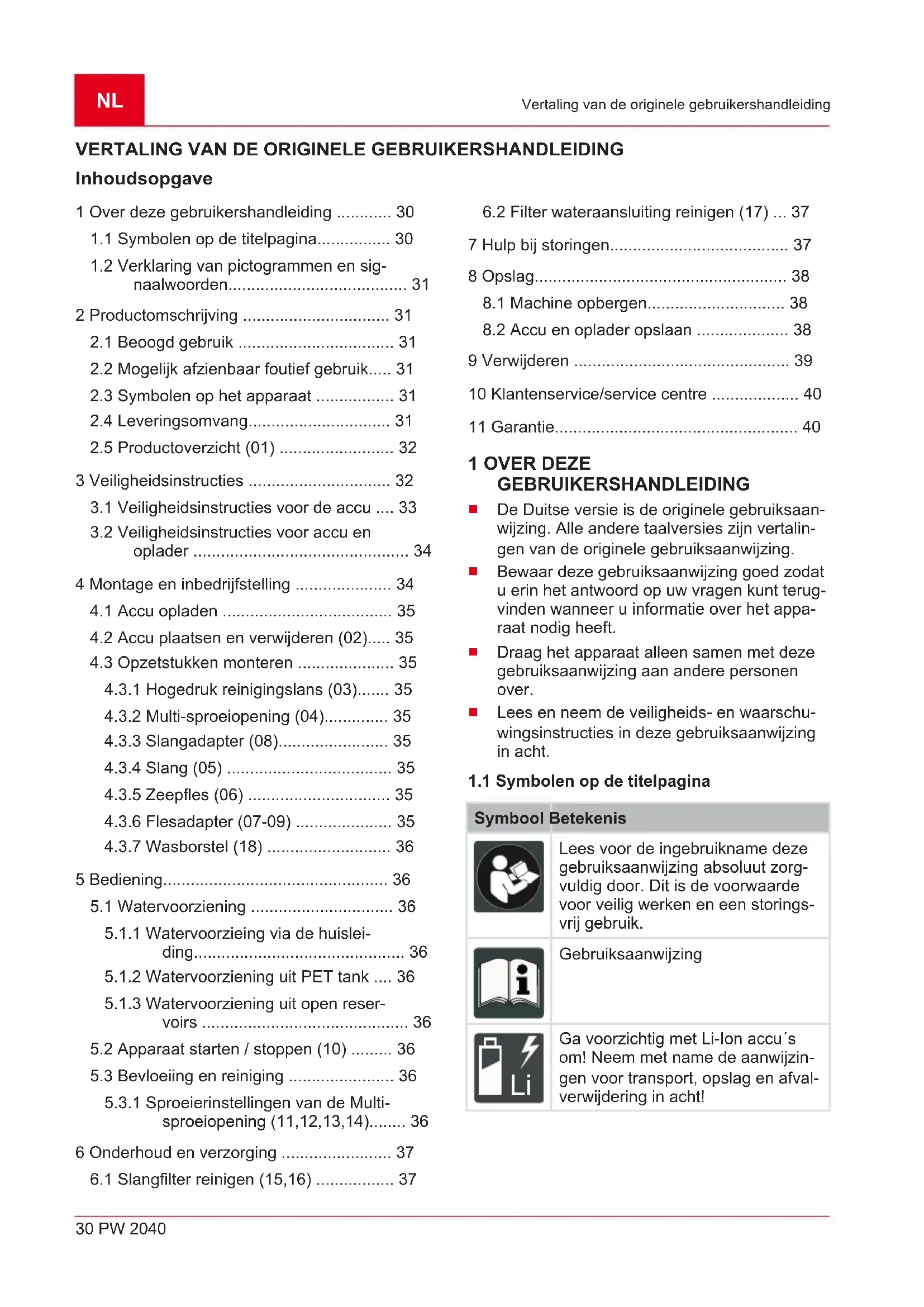 Een verzamelpunt van de fabrikant (indien hij geen lid is van het gemeenschappelijke recy- cling systeem) Deze voorschriften zijn alleen voor toepassing op accu’s en batterijen die in landen van de Europe- se Unie verkocht werden en die beantwoorden aan de Europese richtlijn 2006/66/EU. In landen buiten de Europese Unie kunnen afwijkende be- palingen voor de recycling van accu’s en batterij- en gelden.NL 40 PW 2040 Klantenservice/service centre 10 KLANTENSERVICE/SERVICE CENTRE Voor vragen over garantie, reparatie of reserve- onderdelen kunt u contact opnemen met het dichtstbijzijnde AL-KOservice centre. Deze vindt u op internet op het volgende adres: www.al-ko.com/service-contacts 11 GARANTIE Eventueel binnen de wettelijke termijn voor aansprakelijkheid optredende materiaal- of fabricagefou- ten van het apparaat worden naar eigen oordeel door ons verholpen, hetzij door reparatie of door le- vering van een vervangend apparaat. De geldende termijn voor aansprakelijkheid hangt in elk geval af van de wetgeving in het land waarin het apparaat werd aangeschaft. Onze garantie geldt alleen bij: