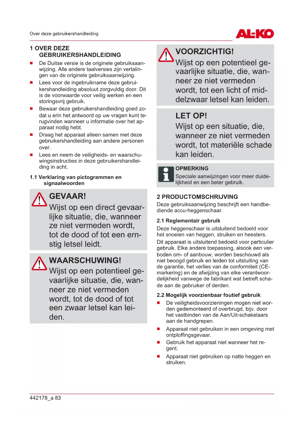 signaalwoorden GEVAAR! Wijst op een direct gevaar- lijke situatie, die, wanneer ze niet vermeden wordt, tot de dood of tot een ern- stig letsel leidt. WAARSCHUWING! Wijst op een potentieel ge- vaarlijke situatie, die, wan- neer ze niet vermeden wordt, tot de dood of tot een zwaar letsel kan lei- den. VOORZICHTIG! Wijst op een potentieel ge- vaarlijke situatie, die, wan- neer ze niet vermeden wordt, tot een licht of mid- delzwaar letsel kan leiden. LET OP! Wijst op een situatie, die, wanneer ze niet vermeden wordt, tot materiële schade kan leiden. OPMERKING Speciale aanwijzingen voor meer duide- lijkheid en een beter gebruik. 2 PRODUCTOMSCHRIJVING Deze gebruiksaanwijzing beschrijft een handbe- diende accu-heggenschaar.