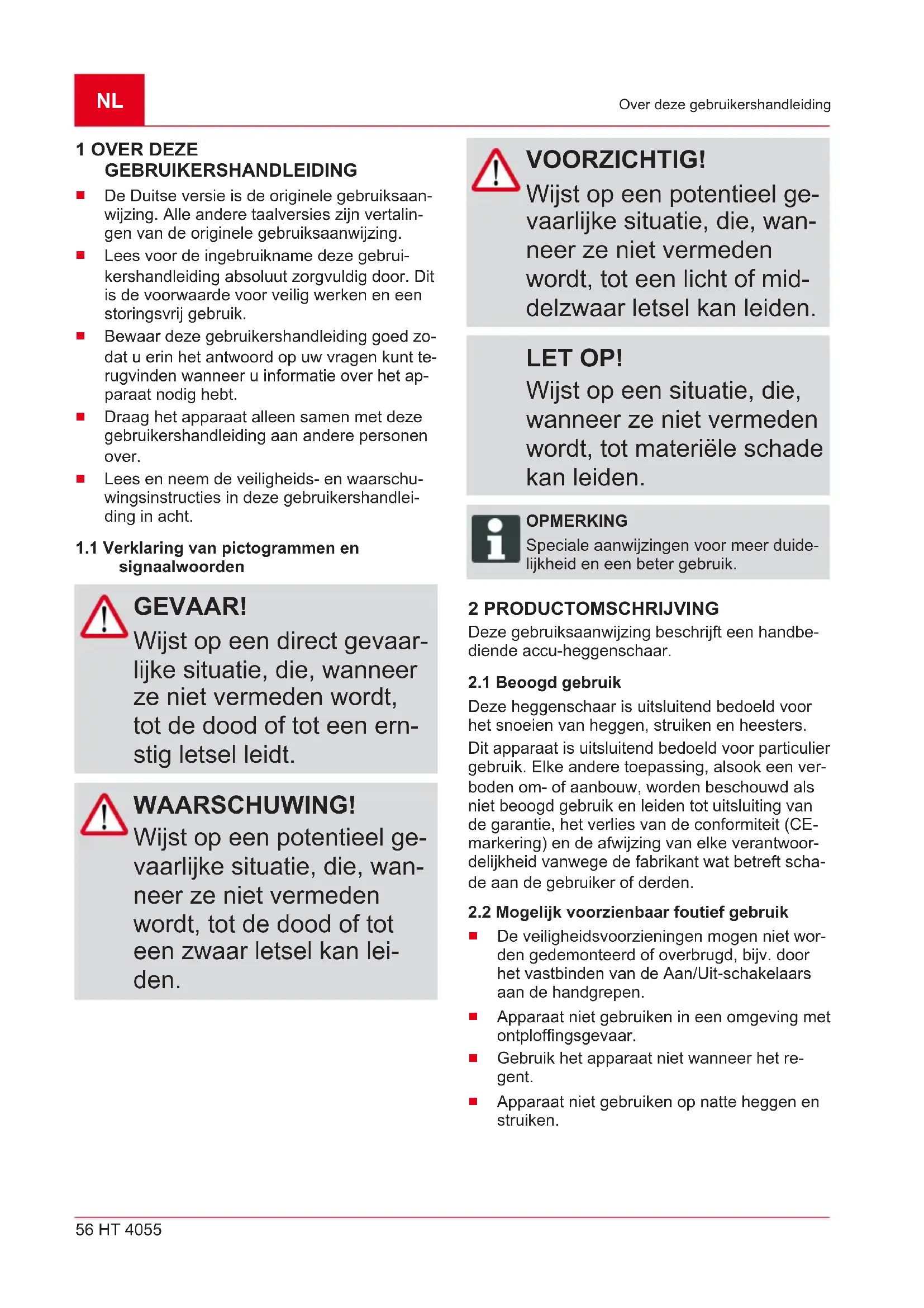 signaalwoorden GEVAAR! Wijst op een direct gevaar- lijke situatie, die, wanneer ze niet vermeden wordt, tot de dood of tot een ern- stig letsel leidt. WAARSCHUWING! Wijst op een potentieel ge- vaarlijke situatie, die, wan- neer ze niet vermeden wordt, tot de dood of tot een zwaar letsel kan lei- den. VOORZICHTIG! Wijst op een potentieel ge- vaarlijke situatie, die, wan- neer ze niet vermeden wordt, tot een licht of mid- delzwaar letsel kan leiden. LET OP! Wijst op een situatie, die, wanneer ze niet vermeden wordt, tot materiële schade kan leiden. OPMERKING Speciale aanwijzingen voor meer duide- lijkheid en een beter gebruik. 2 PRODUCTOMSCHRIJVING Deze gebruiksaanwijzing beschrijft een handbe- diende accu-heggenschaar.