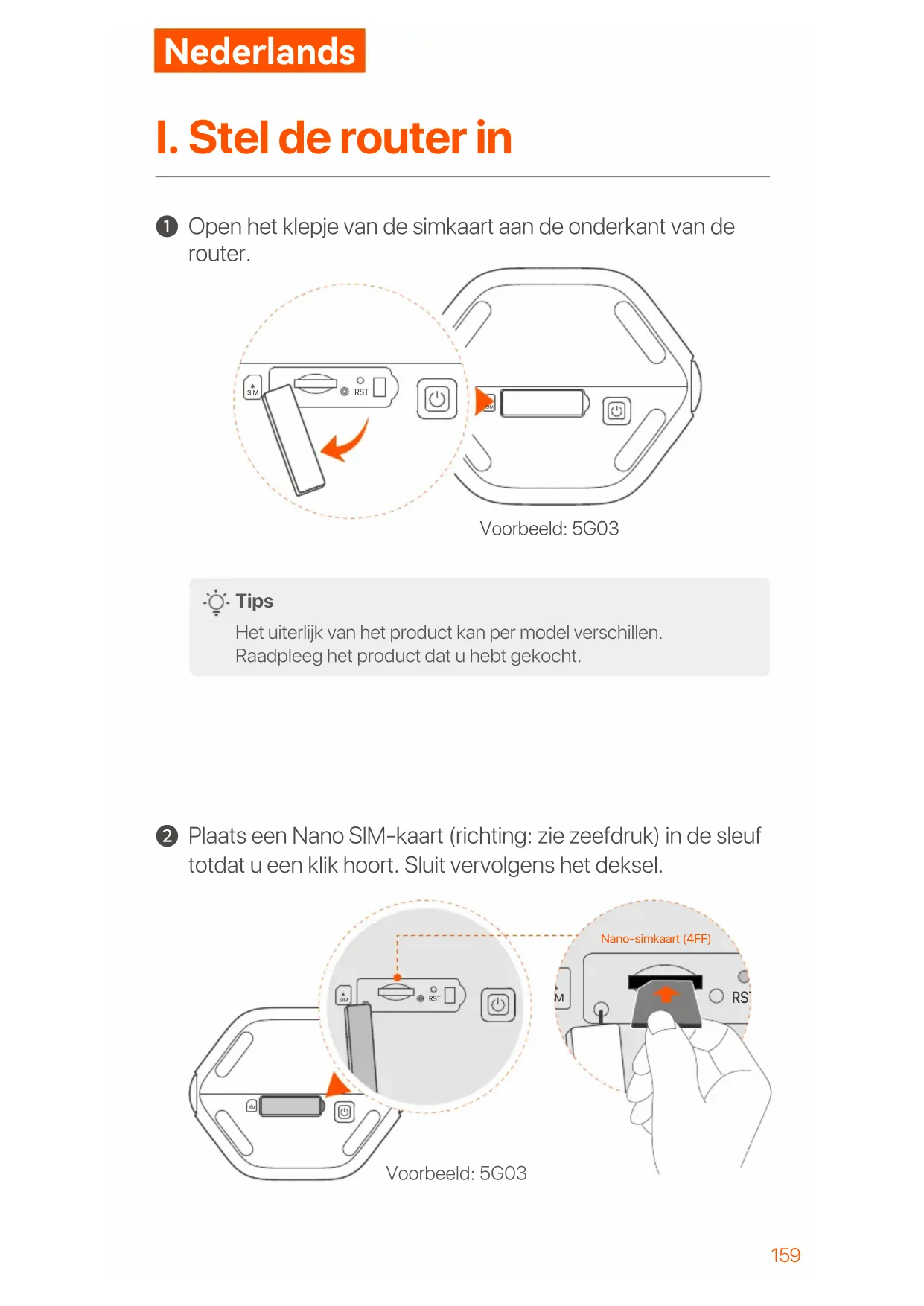 Plaats een Nano SlM-kaart (richting: zie zeefdruk) in de sleuf totdat u een klik hoort. Sluit vervolgens het deksel. SIM SIM RST Voorbeeld: 5G03 SIM SIM RST SIM RST Nano-simkaart (4FF) Voorbeeld: 5G03160 Tips Het uiterlijk van het product kan per model verschillen. Raadpleeg het product dat u hebt gekocht. Om de prestaties te garanderen en schade aan de SIM-kaart te voorkomen, mag u de SIM-kaart niet plaatsen of verwijderen terwijl de router actief is. Om de SIM-kaart te verwijderen, drukt u voorzichtig op de SIM-kaart totdat deze vastklikt. De simkaart springt er automatisch uit.