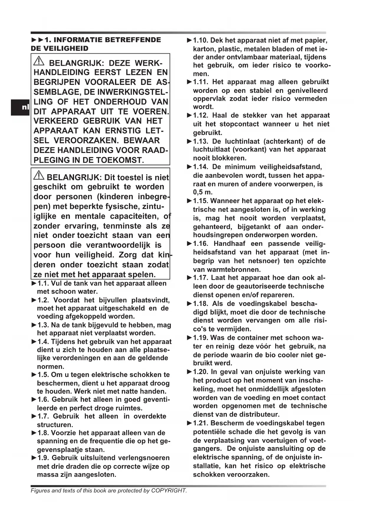 PLEGING IN DE TOEKOMST. BELANGRIJK: Dit toestel is niet geschikt om gebruikt te worden door personen (kinderen inbegre- pen) met beperkte fysische, zintu- iglijke en mentale capaciteiten, of zonder ervaring, tenminste als ze niet onder toezicht staan van een persoon die verantwoordelijk is voor hun veiligheid. Zorg dat kin- deren onder toezicht staan zodat ze niet met het apparaat spelen. ►1.1. Vul de tank van het apparaat alleen met schoon water. ►1.2. Voordat het bijvullen plaatsvindt, moet het apparaat uitgeschakeld en de voeding afgekoppeld worden. ►1.3. Na de tank bijgevuld te hebben, mag het apparaat niet verplaatst worden. ►1.4. Tijdens het gebruik van het apparaat dient u zich te houden aan alle plaatse- lijke verordeningen en aan de geldende normen. ►1.5. Om u tegen elektrische schokken te beschermen, dient u het apparaat droog te houden. Werk niet met natte handen. ►1.6. Gebruik het alleen in goed geventi- leerde en perfect droge ruimtes. ►1.7. Gebruik het alleen in overdekte structuren. ►1.8. Voorzie het apparaat alleen van de spanning en de frequentie die op het ge- gevensplaatje staan. ►1.9. Gebruik uitsluitend verlengsnoeren met drie draden die op correcte wijze op massa zijn aangesloten. ►1.10. Dek het apparaat niet af met papier, karton, plastic, metalen bladen of met ie- der ander ontvlambaar materiaal, tijdens het gebruik, om ieder risico te voorko- men. ►1.11. Het apparaat mag alleen gebruikt worden op een stabiel en genivelleerd oppervlak zodat ieder risico vermeden wordt. ►1.12. Haal de stekker van het apparaat uit het stopcontact wanneer u het niet gebruikt. ►1.13. De luchtinlaat (achterkant) of de luchtuitlaat (voorkant) van het apparaat nooit blokkeren. ►1.14. De minimum veiligheidsafstand, die aanbevolen wordt, tussen het appa- raat en muren of andere voorwerpen, is 0,5 m. ►1.15. Wanneer het apparaat op het elek- trische net aangesloten is, of in werking is, mag het nooit worden verplaatst, gehanteerd, bijgetankt of aan onder- houdsingrepen onderworpen worden. ►1.16. Handhaaf een passende veilig- heidsafstand van het apparaat (met in- begrip van het netsnoer) ten opzichte van warmtebronnen. ►1.17. Laat het apparaat hoe dan ook al- leen door de geautoriseerde technische dienst openen en/of repareren. ►1.18. Als de voedingskabel bescha- digd blijkt, moet die door de technische dienst worden vervangen om alle risi- co's te vermijden. ►1.19. Was de container met schoon wa- ter en reinig deze vóór het gebruik, na de periode waarin de bio cooler niet ge- bruikt werd. ►1.20. In geval van onjuiste werking van het product op het moment van inscha- keling, moet het onmiddellijk afgesloten worden van de voeding en moet contact worden opgenomen met de technische dienst van de distributeur. ►1.21. Bescherm de voedingskabel tegen potentiële schade die het gevolg is van de verplaatsing van voertuigen of voet- gangers. De onjuiste aansluiting op de elektrische spanning, of de onjuiste in- stallatie, kan het risico op elektrische schokken veroorzaken. nlFigures and texts of this book are protected by COPYRIGHT. ►1.22. Gebruiksvoorwaarden: A) Temperatuur van de lucht: 18°C tot 45°C; Temperatuur van het water: <45°C. B) De lucht moet vrij zijn van stof en ver- vuilende stoen, anders moet een aan- vullende reiniging plaatsvinden. ►1.23. Het water dat voor het vullen van de tank van de koeler gebruikt wordt, moet afkomstig zijn van een waterleiding. Als het niet mogelijk is van een waterleiding gebruik te maken, moet het ingevoerde water onderworpen worden aan een wa- terzuiveringsbehandeling volgens de Europese richtlijn 98/83/EG. -Er wordt aanbevolen water met een hardheid lager dan 15°f te gebruiken. -De tank van de koeler moet regelmatig, al naargelang het gebruik, geleegd en ontsmet worden. -De oppervlakken van de pads moeten regelmatig, al naargelang het gebruik, geïnspecteerd en ontsmet worden. -Voor de ontsmettingswerkzaamheden moeten biociden gebruikt worden con- form de Europese verordening 582/2012. ►►2. UITPAKKEN ►2.1. Haal al het verpakkingsmateriaal weg dat gebruikt is om het apparaat te verpak- ken en te versturen, en verwijder het vol- gens de geldende normen. ►2.2. Haal alle artikelen uit de verpakking. ►2.3. Controleer of tijdens het transport geen schade is opgetreden. Als het apparaat beschadigd lijkt, moet men onmiddellijk de concessiehouder bij wie het apparaat ge- kocht is daarover informeren. ►►3. ASSEMBLAGE Het apparaat is uitgerust met wielen om de verplaatsing te vergemakkelijken. Al naar- gelang het model, kunnen de wielen al ge- installeerd zijn of moeten nog geïnstalleerd worden. De componenten, compleet met de bijhorende montagebouten, bevinden zich in de verpakking (Fig. 1). ►►4. WERKING WAARSCHUWING: Lees aandachtig de ”INLICHTINGEN BETREFFENDE DE VEILIGHEID” alvorens het apparaat in te schakelen. WAARSCHUWING: Gebruik alleen schoon water om defecten of storingen te voorkomen. WAARSCHUWING: Controleer of uw elektrische installatie een correcte aarding heeft. De aansluiting op het elektriciteitsnet moet uitgevoerd worden in overeenstemming met de nationale normen die van kracht zijn. Voorzie het apparaat alleen van de spanning en de frequentie die op het gegevensplaatje staan. OPMERKING: Deze modellen kunnen aangesloten worden op het waternet door de leiding aan te sluiten op de koppeling (Fig. 10). ►►4.1. INSCHAKELING: ►4.1.1. Open het deurtje van de tank (Fig. 2). ►4.1.2. Vul water bij in de tank (Fig. 3), het waterpeil moet tussen MIN en MAX van de schaalverdeling liggen die zich op de zijkant van het apparaat bevindt (Fig. 4), om risico’s te voorkomen. ►4.1.3. Sluit het deurtje van de tank (Fig. 5). ►4.1.4. Steek de stekker in het stopcontact (Fig. 6). AANDACHT: Wanneer de stekker in het stopcontact gestoken wordt, zal het display de approximatieve temperatuurwaarde van de omgeving weergeven. ►4.1.5. Druk op de knop ON/OFF om het apparaat in te schakelen (F