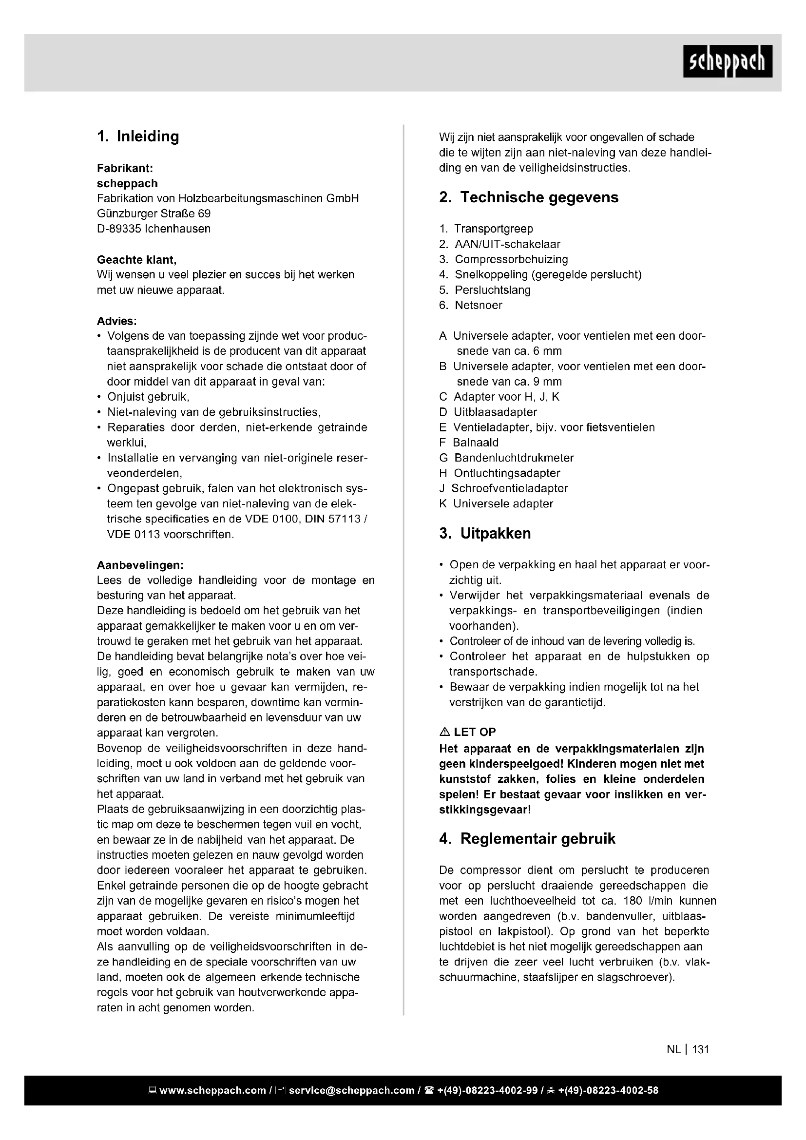 m Let op! Bij gebruik van deze compressor dienen de volgende fundamentele veiligheidsvoorschriften te worden opgevolgd ter bescherming tegen elektri- sche schok, lichamelijk gevaar en brandrisico. Lees deze voorschriften en leef ze na alvorens het toestel te gebruiken. Veilig werken 1 Hou u uw werkplaats netjes – Wanorde op uw werkplaats leidt tot gevaar voor ongelukken. 2 Hou rekening met de omgevingsinvloeden – Stel elektrisch materieel niet bloot aan de regen. – Gebruik elektrisch materieel niet in vochtige of natte omgeving. Gevaar door elektrische schok! – Zorg voor een goede verlichting. – Gebruik elektrisch materieel niet in de buurt van brandbare vloeistoffen of gassen. 3 Bescherm u tegen elektrische schok – Vermijd lichamelijk contact met geaarde de- len, b.v. buizen, radiatoren, fornuizen, koel- kasten. 4 Hou kinderen weg! – Laat geen andere personen het gereedschap of de kabel raken, hou ze weg van uw werk- gebied. 5 Bewaar uw gereedschappen op een veilige plaats – Niet gebruikte gereedschappen moeten in een droge gesloten ruimte buiten bereik van kinderen worden bewaard. 6 Overbelast uw gereedschap niet – U werkt beter en veiliger in het opgegeven vermogensgebied. 7 Draag de gepaste werkkledij – Bij het werken in open lucht draagt u best rubber handschoenen en slipvast schoeisel. – Bij het werken in open lucht draagt u best rubberhandschoenen en slipvast schoeisel. – Draag bij lang haar een haarbescherming. www.scheppach.com / service@scheppach.com / +(49)-08223-4002-99 / +(49)-08223-4002-58
