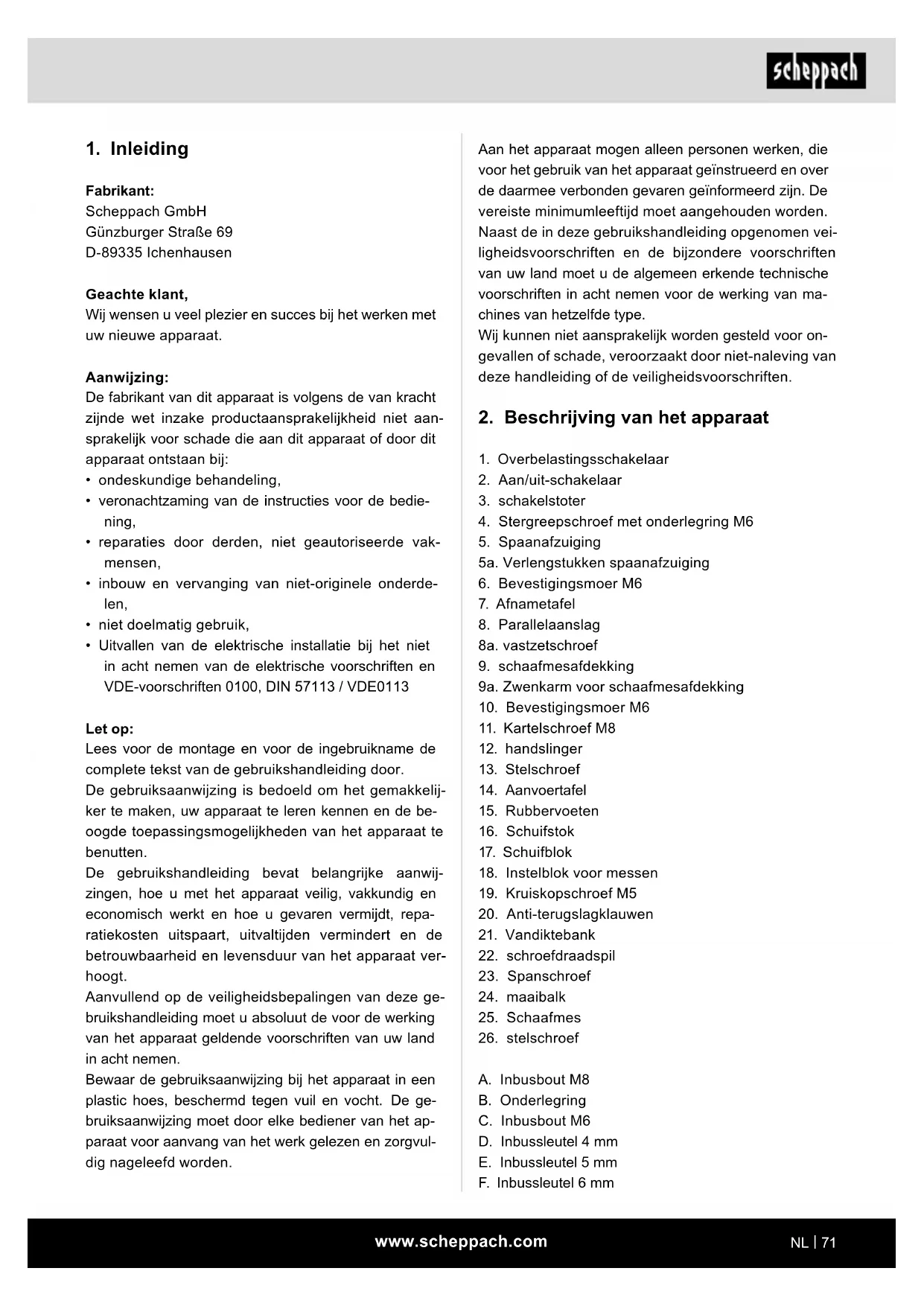 Fabrikant: Scheppach GmbH Günzburger Straße 69 D-89335 Ichenhausen Geachte klant, Wij wensen u veel plezier en succes bij het werken met uw nieuwe apparaat. Aanwijzing: De fabrikant van dit apparaat is volgens de van kracht zijnde wet inzake productaansprakelijkheid niet aan- sprakelijk voor schade die aan dit apparaat of door dit apparaat ontstaan bij: