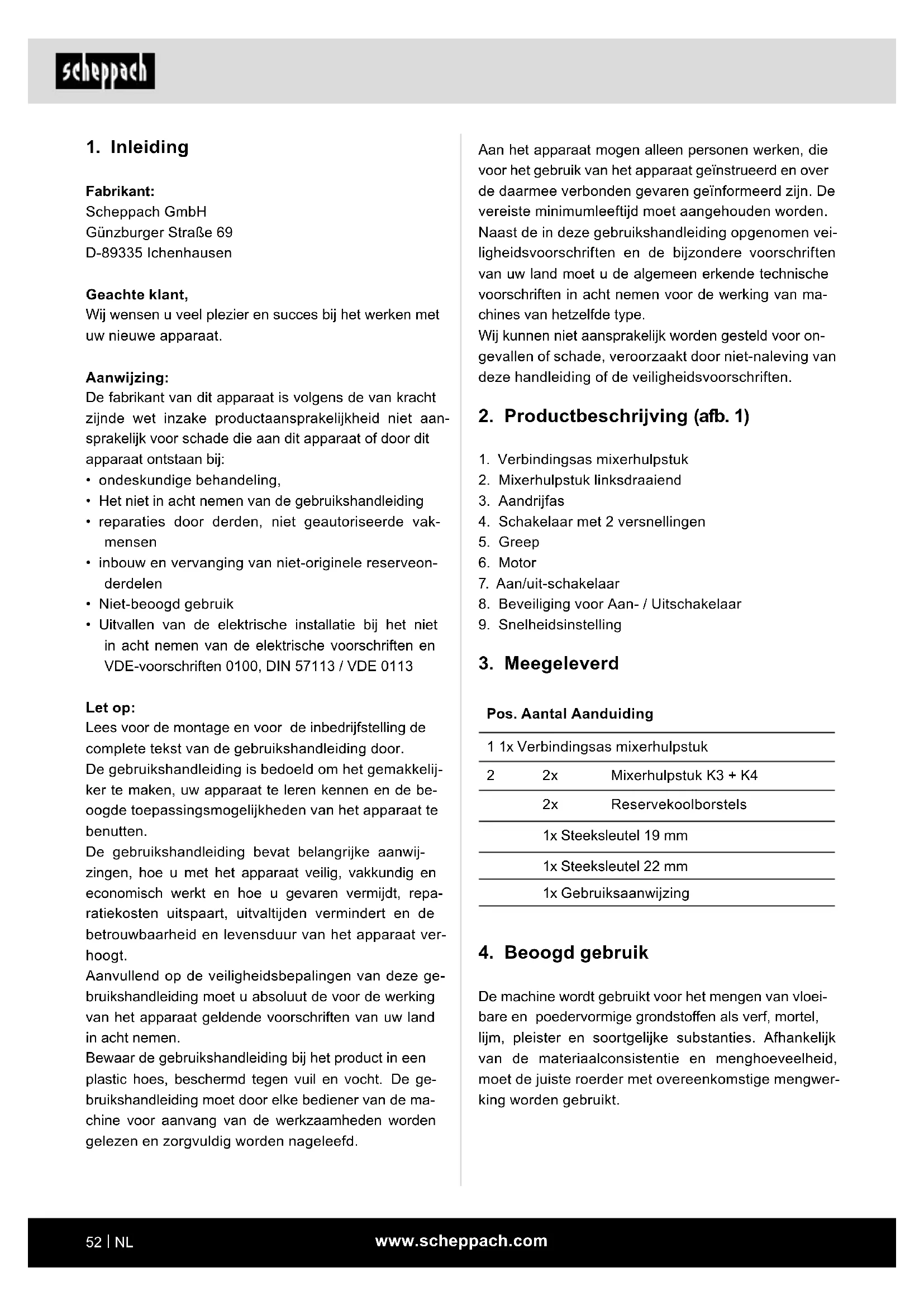 De machine wordt gebruikt voor het mengen van vloei- bare en poedervormige grondstoen als verf, mortel, lijm, pleister en soortgelijke substanties. Afhankelijk van de materiaalconsistentie en menghoeveelheid, moet de juiste roerder met overeenkomstige mengwer- king worden gebruikt.www.scheppach.com