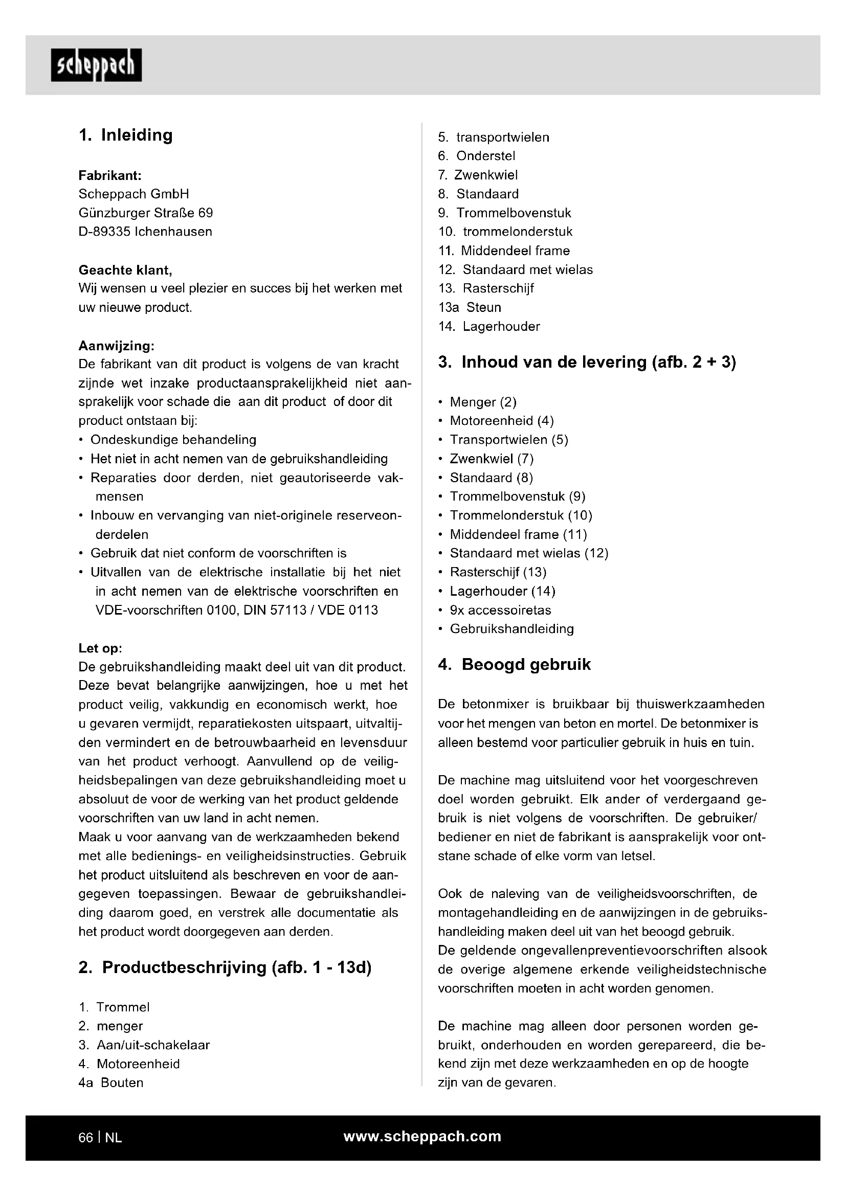 De betonmixer is bruikbaar bij thuiswerkzaamheden voor het mengen van beton en mortel. De betonmixer is alleen bestemd voor particulier gebruik in huis en tuin. De machine mag uitsluitend voor het voorgeschreven doel worden gebruikt. Elk ander of verdergaand ge- bruik is niet volgens de voorschriften. De gebruiker/ bediener en niet de fabrikant is aansprakelijk voor ont- stane schade of elke vorm van letsel. Ook de naleving van de veiligheidsvoorschriften, de montagehandleiding en de aanwijzingen in de gebruiks- handleiding maken deel uit van het beoogd gebruik. De geldende ongevallenpreventievoorschriften alsook de overige algemene erkende veiligheidstechnische voorschriften moeten in acht worden genomen. De machine mag alleen door personen worden ge- bruikt, onderhouden en worden gerepareerd, die be- kend zijn met deze werkzaamheden en op de hoogte zijn van de gevaren.