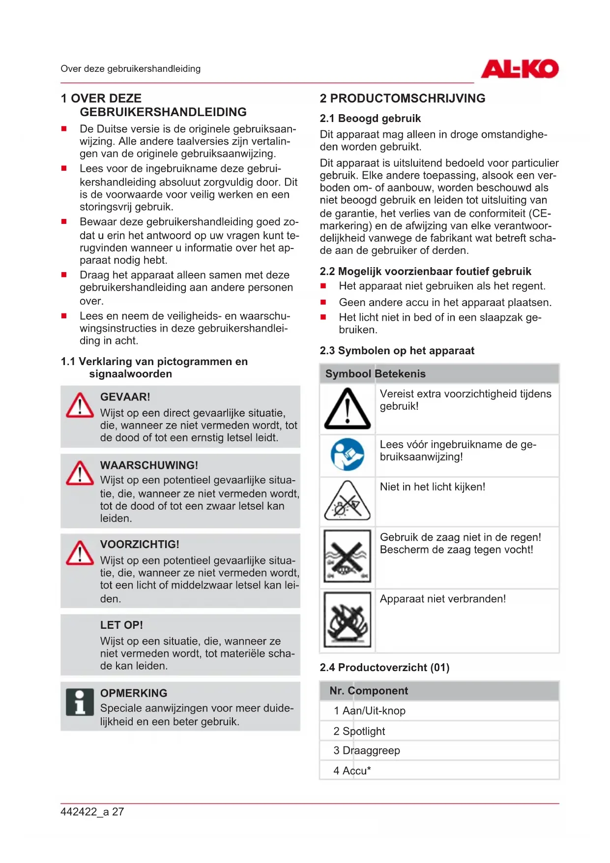 Download de handleiding voor uw Zaklamp in PDF-formaat gratis! Vind uw handleiding WL 2020 - AL-KO en neem uw elektronisch apparaat weer in handen. Op deze pagina staan alle documenten die nodig zijn voor het gebruik van uw apparaat. WL 2020 van het merk AL-KO.