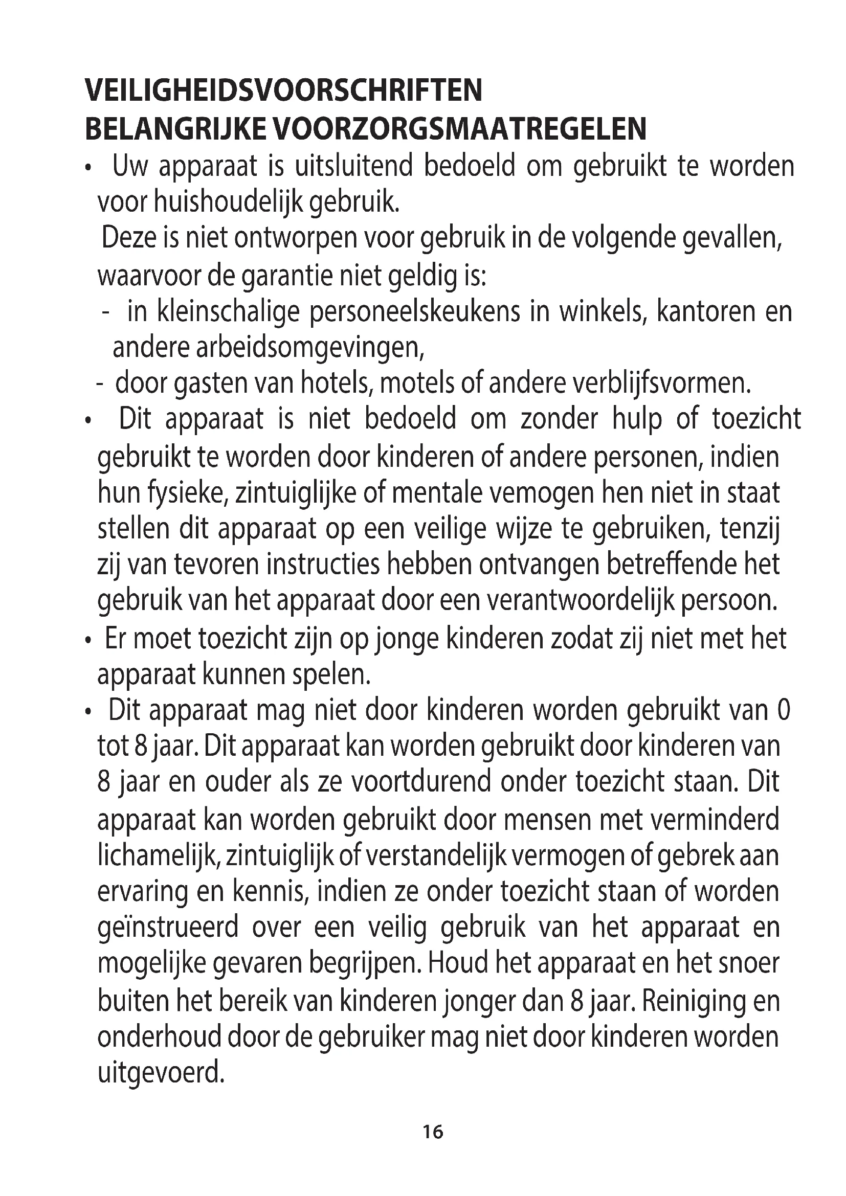 Dit apparaat mag Niet door kinderen worden gebruikt van 0 tot 8aar. Dit apparaat kan worden gebruikt door kinderen van 8aar en ouder als ze voortdurend onder toezicht staan. Dit apparaat kan worden gebruikt door mensen met verminderd lichamelijk, zintuiglijk of verstandelijk vermogen of Gebrek aan ervaring en kennis, indien ze onder toezicht staan of worden geinstrueerd over een veilig gebruik van het apparaat en mogelijk bevaren begrijpen. Houd het apparaat en het snoer buiten het bereik van kinderenjonger dan 8aar. Reiniging en onderhoud door de gebruiker mag Niet door kinderen wordenuitgevoerd.