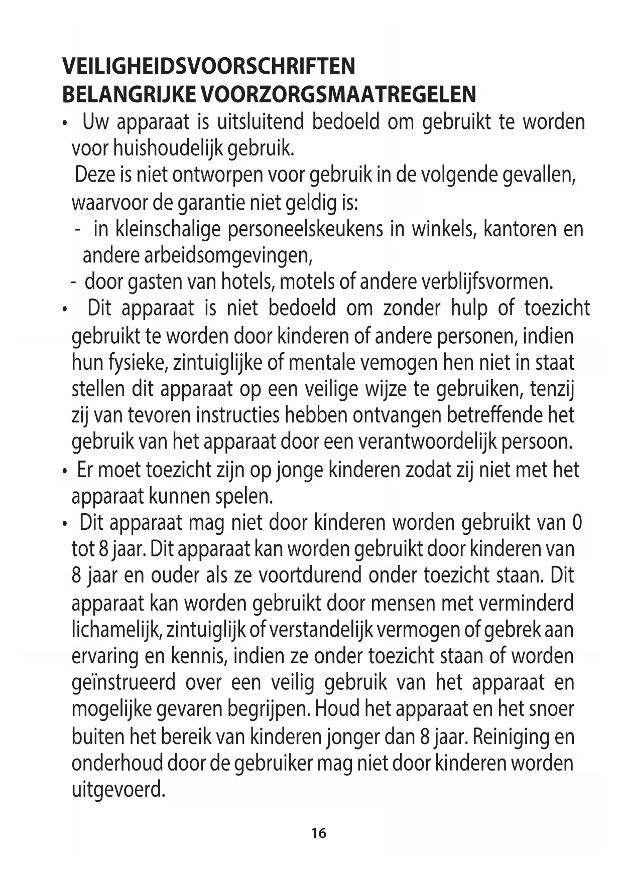 - Dit apparaat mag niet door kinderen worden gebruikt van 0 tot 8 jaar. Dit apparaat kan worden gebruikt door kinderen van 8 jaar en ouder als ze voortdurend onder toezicht staan. Dit apparaat kan worden gebruikt door mensen met verminderd lichamelijk, zintuiglijk of verstandelijk vermogen of gebrek aan ervaring en kennis, indien ze onder toezicht staan of worden geïnstrueerd over een veilig gebruik van het apparaat en mogelijke gevaren begrijpen. Houd het apparaat en het snoer buiten het bereik van kinderen jonger dan 8 jaar. Reiniging en onderhoud door de gebruiker mag niet door kinderen worden uitgevoerd.17