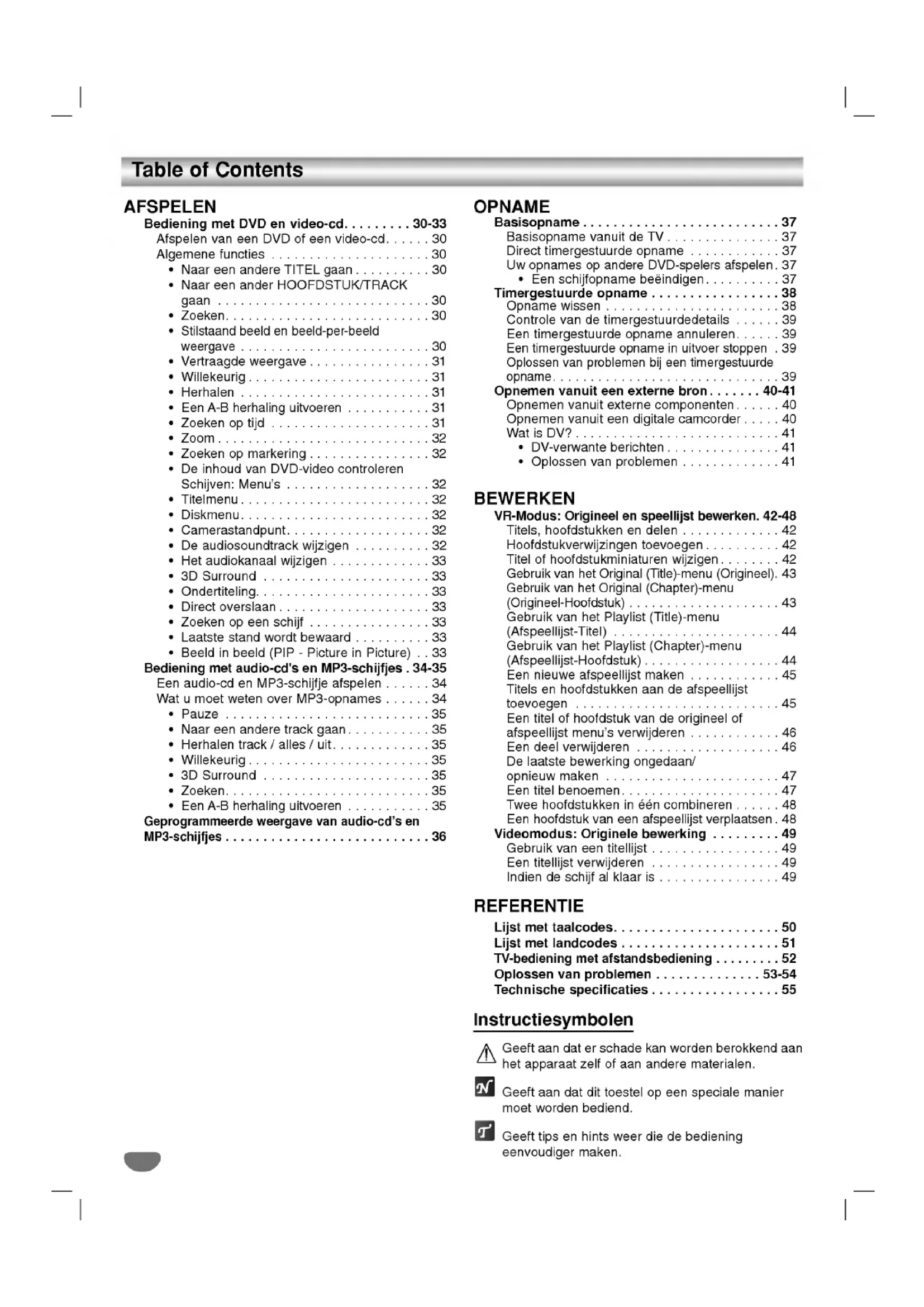 Symptoom Geenstroom.Geenbeeld.Geen geluid. Deweergaveisvaneenslechtekwaliteit.DeDVD-recorder speelt nietaf.Hetbeeldvandeexternebronismisvormd. Sommige zendersworden overgeslagen bij het gebruiken vanv/V.Hetbeeldof geluid vandeontvangenzenderiszwakof afwezig. Hetbeeldvandecamcorderwordtnietweergegeven.Hetbeeldvandecamcordervia A/V-ingang ofvanDVINnaardeDVD-recorderwordtnietopTVweergegeven.OorzaakDeelektriciteitskabelisnietaanges-loten.DeTV/DVD-modusvoorderecorderisopTV ingesteld. DeTVisniet ingesteld omhet signaal vande DVD-recorderteontvangen.Devideokabelisniet goed aangesloten. aangesloten TVheeftgeen voeding. Hettoesteldatmetdeaudiokabelisverbonden,kanhet uitvoersignaal vande DVD-recordernietontvangen.Deaudiokabels zijn niet goed aangesloten. Hettoesteldatviadeaudiokabelverbondenis,staatnietaan.Deaudiokabelis beschadigd. Dediskisvuil.Er steektgeendiskindelade.Er steekteendiskindeladedienietkanworden gespeeld. Dediskisondersteboven geplaatst. Dediskisbuitenbereik geplaatst. Dediskisvuil.De ingestelde censuur (rating) verhindertdeweergave.Het videosignaal vandeexternebronistegen kopieren beschermd.Dezezenders zijn innietderecorder opgeslagen. Deantenneofdekabels zijn los.Decamcorderisuit.DeINPUTSELECTvandeDVD-recorderisniet juist. Oplossing Steekdeelektriciteitskabel goed inhetstopcontact.Druk herhaaldelijk opTV/DVD opde afstandsbediening omdeDVD-modusteselecteren.DeTV-indicatorwordtniet langer inhet displayscherm weergegeven.Selecteerde juiste video-invoermodusopdeTV,zodathetbeeldvandeDVD-recorderophetTV-schermwordtweergegeven.Sluitdevideokabel stevig aan.SchakeldeTVaan.Selecteerdecorrecteinvoermodusvande audio-ontvanger zodatukanluisterennaardeklankvandeDVD-recorder.Sluitdeaudiokabel stevig aan.Schakelhettoestel,datverbondenismetdeaudiokabel,aan. Vervang dekabelmeteennieuwekabel.Maakdediskschoon.Plaatseendisk. (Ga naofdedisk-indicator oplicht inhet display). Plaatseendiskdiekanworden gespeeld. (Controleer het disktype, het kleursysteem ende regiocode.) Plaatsdediskmetde weergavezijde naaronder gericht. Plaatsdiskcorrectindecd-lade,zodatdediskbinnenbereikis.Maakdediskschoon.Annuleerdecensuurfunctie (Parental Control) wijzig hetcensuurniveau (rating). Ukuntgeen aansluiting viadezerecordermaken.SluitdecomponentdirectopdeTVaan.Hersteldezenders. (Zie "Eenprogramma wijzigen" pagina 18-19). Bevestig aansluitingen ofvervangdekabel.Schakeldecamcorderinenbedienhettoestelopde juiste manier.GebruikAVomde ontvangstzender teselecteren (AV1, AV2,DV, enz.) Oplossen van problemen Voorucontactopneemtmetuw servicebedrijf, neemtubestevenhet volgende overzichtdooromdeeventueleoorzaakvanhet probleem tevinden.Oplossing Beeindig schijf (pagina 26). Erisgeen oplossing. Omdeze schijf tekunnen spelen, moetdeandere speler RW-compatibel zijn. Erisgeen oplossing. Gebruikeenandere schijf. Ukuntvandezebronopnemen.Selecteerhetkanaalopdeinderecorder ingebouwde TV-ontvanger. GebruikeeninVR-modus geformatteerde schijf voorde eenmalige kopie. Steldeklokmetde juiste tijd in.Zie"Auto klokinstelling" "Handmatige klokinstelling", pagina Programmeer detimer opnieuw. Zie "Timergestuurde opname" pagina Programmeer detimer opnieuw. Erisgeen oplossing. Erisgeen oplossing. Maakde A/V-aansluitingen. Stereoisenkelbeschikbaarviade A/V-uitgang vandeDVD-recorder.SelecteerdeAUX-ofA/V-bronnenals TV-input. Stelde TV-geluidszender instereoin.Zie"HetTV-audiokanaal wijzigen", pagina Wijs metdeafstandsbedien- ing naardesensorvandeDVD-recorder.Ukande afstandsbediening gebruiken binneneenstraalvan7meter. Verwijder allevoorwerpentussende afstandsbediening endetoestel. Vervang batterijen metnieuwe.OorzaakDediskwasinvideomodusopgenomen. Sommige spellers kunnengeendisk afspelen dieinvideomodus zijn opgenomen,al zijn beeindigd. DediskwasinVR-modusopgenomen. Schijven diemeteenmaal kopie zijn opgenomenkunneninandere spelers nietworden afgespeeld. Deresterende opnametijd opde schijf isonvoldoende.Debronwaarvanu probeert kopieren isbeschermd. Bij hetinstellenvande opnamezender, werddezenderopdeTVzelf ontvangen. Bij hetopnemenopeen videomodus-schijf, kunnen programma's metde "eenmalige kopie" vergrendeling nietworden gekopieerd. DeklokindeDVD-recorderisnietcorrect ingesteld. Detimerisnietcorrect geprogrammeerd. Detimer opnameindicator brandtnietnahetprogrammerenmetdetimer.DeTVisniet stereo-compatibel. Het uitgezonden programmaheeftgeenstereoformaat.De A/V-uitgangen vandeDVD-recorder zijn nietopdeTV A/V-ingangen aangesloten. Audio/Video-uitgang vandeDVD-recorderisniet geselecteerd voordeweergaveopTV.De TV-geluidszender vandeDVD-recorderisinmono ingesteld. Urichtde afstandsbediening nietinde richting vandedaartoevoorzienesensoropdeDVD-recorder.De afstandsbediening bevindtzichtevervandeDVD-recorder.Erstaatietsindewegtussende afstandsbediening endeDVD-recorder.De batterijen vande afstandsbediening zijn leeg.