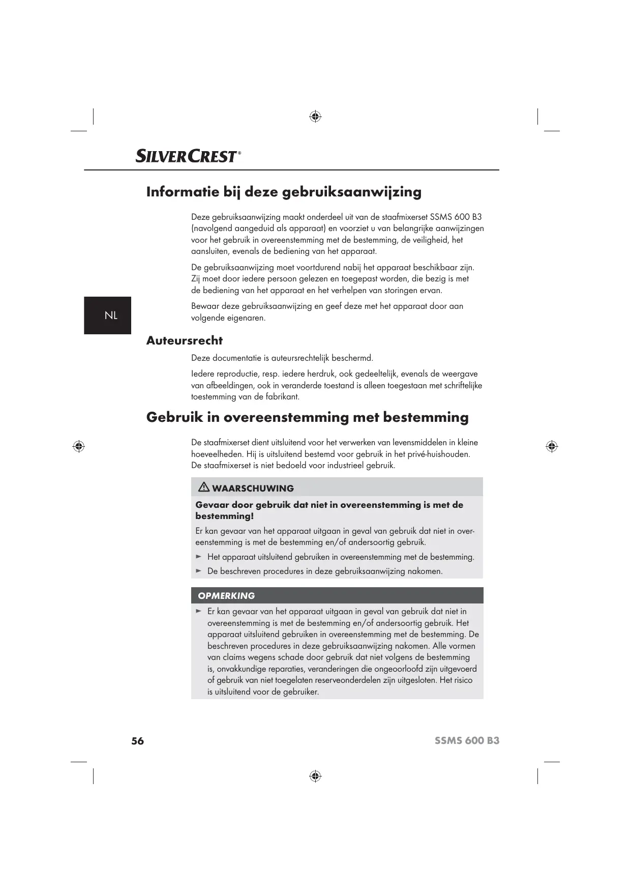 Informatie bij deze gebruiksaanwijzing Deze gebruiksaanwijzing maakt onderdeel uit van de staafmixerset SSMS 600 B3 (navolgend aangeduid als apparaat) en voorziet u van belangrijke aanwijzingen voor het gebruik in overeenstemming met de bestemming, de veiligheid, het aansluiten, evenals de bediening van het apparaat. De gebruiksaanwijzing moet voortdurend nabij het apparaat beschikbaar zijn. Zij moet door iedere persoon gelezen en toegepast worden, die bezig is met de bediening van het apparaat en het verhelpen van storingen ervan. Bewaar deze gebruiksaanwijzing en geef deze met het apparaat door aan volgende eigenaren.
