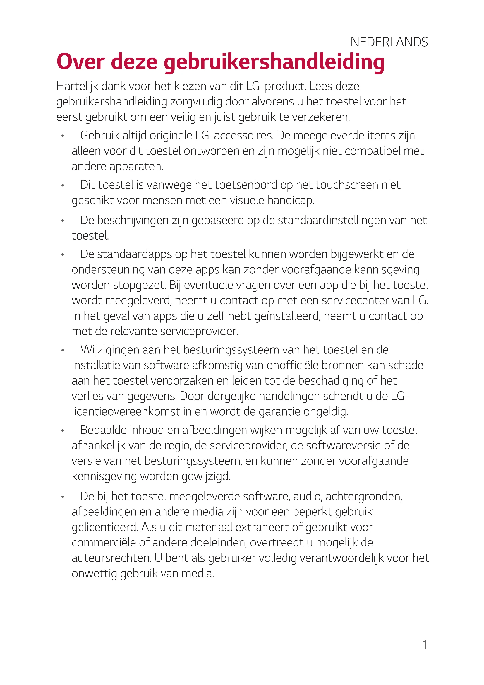 accumulatori obsoleti, contattare l’ufficio del comune di residenza, il servizio di smaltimento rifiuti o il negozio in cui è stato acquistato il prodotto.1 Over deze gebruikershandleiding Hartelijk dank voor het kiezen van dit LG-product. Lees deze gebruikershandleiding zorgvuldig door alvorens u het toestel voor het eerst gebruikt om een veilig en juist gebruik te verzekeren.