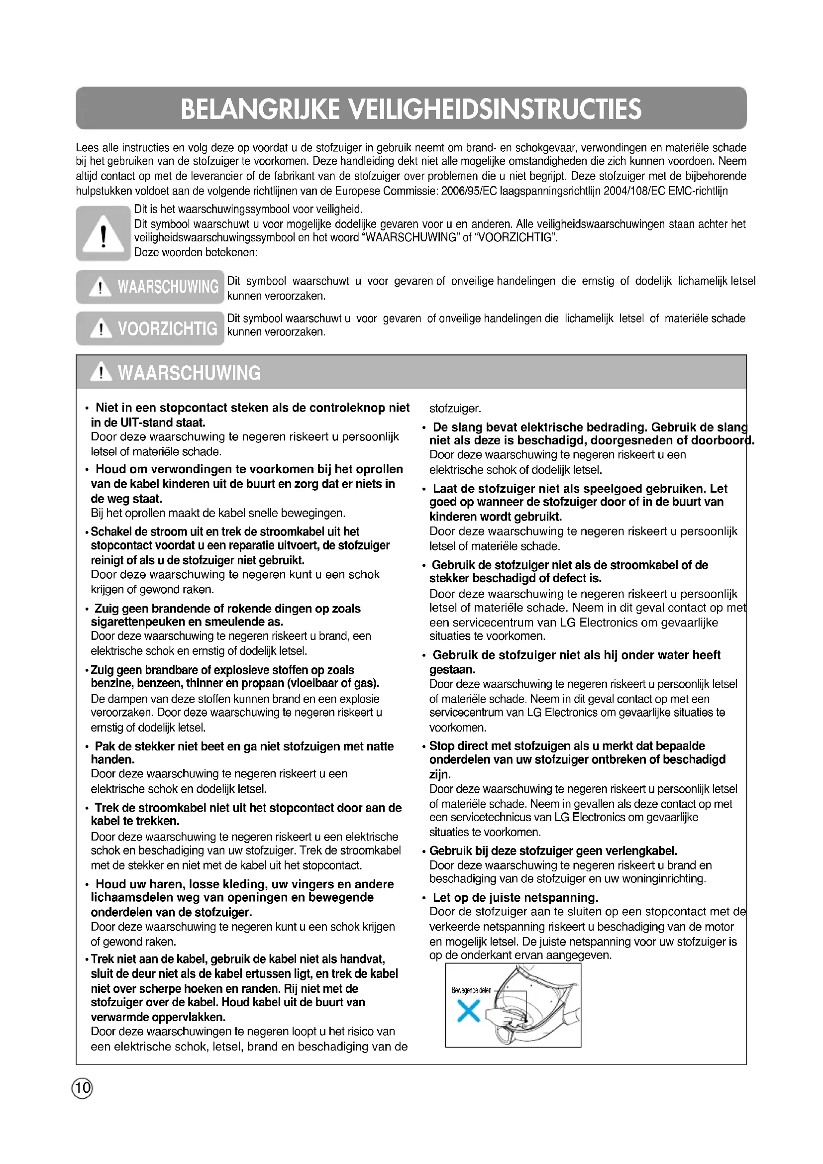 - Gebruik de stofzuiger niet als hij onder water heeft gestaan. Door deze waarschuwing te negeren riskeert u persoonlijk letsel of materiële schade. Neem in dit geval contact op met een servicecentrum van LG Electronics om gevaarlijke situaties te voorkomen.