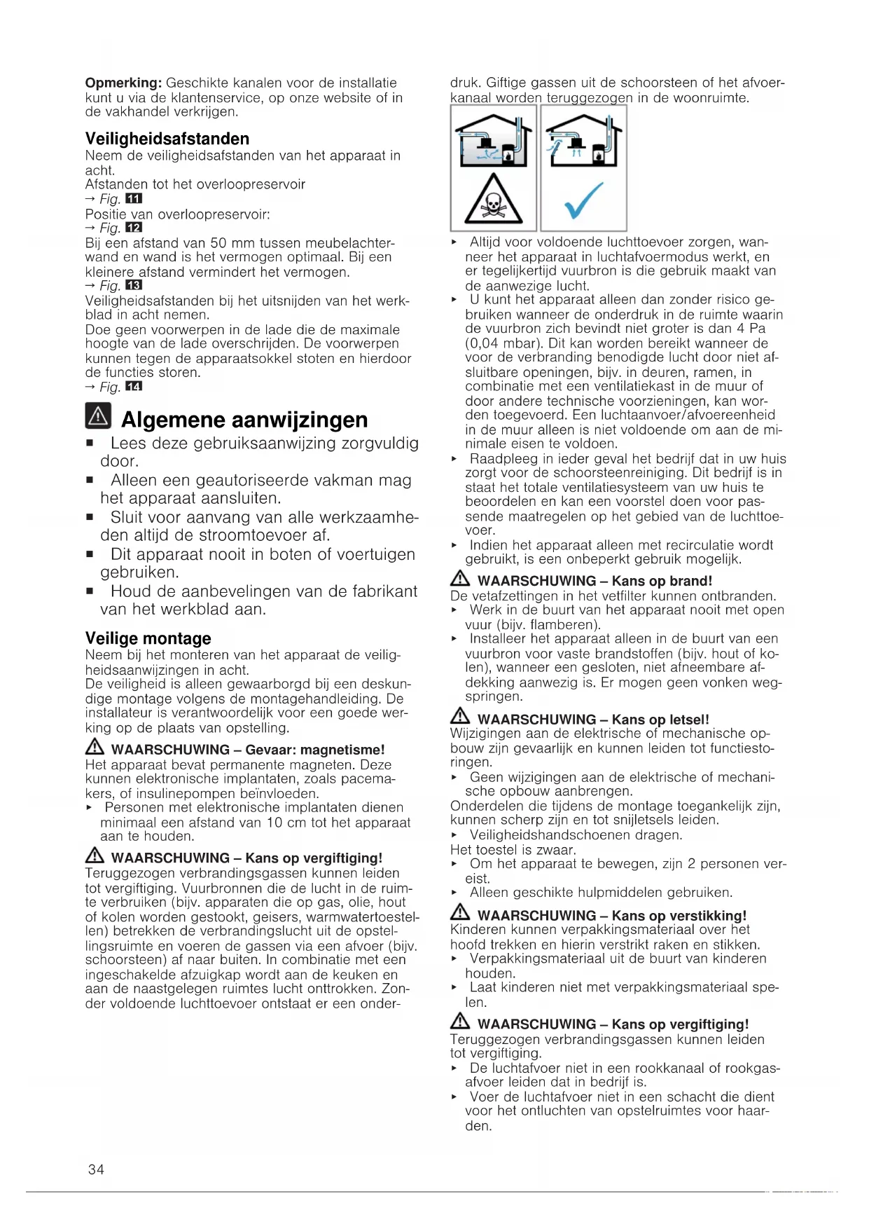 Algemene aanwijzingen ¡ Lees deze gebruiksaanwijzing zorgvuldig door. ¡ Alleen een geautoriseerde vakman mag het apparaat aansluiten. ¡ Sluit voor aanvang van alle werkzaamhe- den altijd de stroomtoevoer af. ¡ Dit apparaat nooit in boten of voertuigen gebruiken. ¡ Houd de aanbevelingen van de fabrikant van het werkblad aan. Veilige montage Neem bij het monteren van het apparaat de veilig- heidsaanwijzingen in acht. De veiligheid is alleen gewaarborgd bij een deskun- dige montage volgens de montagehandleiding. De installateur is verantwoordelijk voor een goede wer- king op de plaats van opstelling. WAARSCHUWING‒Gevaar: magnetisme! Het apparaat bevat permanente magneten. Deze kunnen elektronische implantaten, zoals pacema- kers, of insulinepompen beïnvloeden. ▶ Personen met elektronische implantaten dienen minimaal een afstand van 10 cm tot het apparaat aan te houden. WAARSCHUWING‒Kans op vergiftiging! Teruggezogen verbrandingsgassen kunnen leiden tot vergiftiging. Vuurbronnen die de lucht in de ruim- te verbruiken (bijv. apparaten die op gas, olie, hout of kolen worden gestookt, geisers, warmwatertoestel- len) betrekken de verbrandingslucht uit de opstel- lingsruimte en voeren de gassen via een afvoer (bijv. schoorsteen) af naar buiten. In combinatie met een ingeschakelde afzuigkap wordt aan de keuken en aan de naastgelegen ruimtes lucht onttrokken. Zon- der voldoende luchttoevoer ontstaat er een onder- druk. Giftige gassen uit de schoorsteen of het afvoer- kanaal worden teruggezogen in de woonruimte. ▶ Altijd voor voldoende luchttoevoer zorgen, wan- neer het apparaat in luchtafvoermodus werkt, en er tegelijkertijd vuurbron is die gebruik maakt van de aanwezige lucht. ▶ U kunt het apparaat alleen dan zonder risico ge- bruiken wanneer de onderdruk in de ruimte waarin de vuurbron zich bevindt niet groter is dan 4 Pa (0,04 mbar). Dit kan worden bereikt wanneer de voor de verbranding benodigde lucht door niet af- sluitbare openingen, bijv. in deuren, ramen, in combinatie met een ventilatiekast in de muur of door andere technische voorzieningen, kan wor- den toegevoerd. Een luchtaanvoer/afvoereenheid in de muur alleen is niet voldoende om aan de mi- nimale eisen te voldoen. ▶ Raadpleeg in ieder geval het bedrijf dat in uw huis zorgt voor de schoorsteenreiniging. Dit bedrijf is in staat het totale ventilatiesysteem van uw huis te beoordelen en kan een voorstel doen voor pas- sende maatregelen op het gebied van de luchttoe- voer. ▶ Indien het apparaat alleen met recirculatie wordt gebruikt, is een onbeperkt gebruik mogelijk. WAARSCHUWING‒Kans op brand! De vetafzettingen in het vetfilter kunnen ontbranden. ▶ Werk in de buurt van het apparaat nooit met open vuur (bijv. flamberen). ▶ Installeer het apparaat alleen in de buurt van een vuurbron voor vaste brandstoffen (bijv. hout of ko- len), wanneer een gesloten, niet afneembare af- dekking aanwezig is. Er mogen geen vonken weg- springen. WAARSCHUWING‒Kans op letsel! Wijzigingen aan de elektrische of mechanische op- bouw zijn gevaarlijk en kunnen leiden tot functiesto- ringen. ▶ Geen wijzigingen aan de elektrische of mechani- sche opbouw aanbrengen. Onderdelen die tijdens de montage toegankelijk zijn, kunnen scherp zijn en tot snijletsels leiden. ▶ Veiligheidshandschoenen dragen. Het toestel is zwaar. ▶ Om het apparaat te bewegen, zijn 2 personen ver- eist. ▶ Alleen geschikte hulpmiddelen gebruiken. WAARSCHUWING‒Kans op verstikking! Kinderen kunnen verpakkingsmateriaal over het hoofd trekken en hierin verstrikt raken en stikken. ▶ Verpakkingsmateriaal uit de buurt van kinderen houden. ▶ Laat kinderen niet met verpakkingsmateriaal spe- len. WAARSCHUWING‒Kans op vergiftiging! Teruggezogen verbrandingsgassen kunnen leiden tot vergiftiging. ▶ De luchtafvoer niet in een rookkanaal of rookgas- afvoer leiden dat in bedrijf is. ▶ Voer de luchtafvoer niet in een schacht die dient voor het ontluchten van opstelruimtes voor haar- den.35 ▶ Moet de luchtafvoer in een rook- of afvoergas- schoorsteen worden geleid die niet in gebruik is, dan dient hiervoor toestemming van een vakbe- kwame schoorsteenveger te worden verkregen. Teruggezogen verbrandingsgassen kunnen leiden tot vergiftiging. ▶ Wanneer een afzuigkap wordt geïnstalleerd met een haard die afhankelijk is van de ruimtelucht, dan moet de stroomtoevoer van de afzuigkap zijn voorzien van een geschikte veiligheidsschakeling. Aanwijzingen voor de elektrische aansluiting Om het apparaat elektrisch veilig te kunnen aanslui- ten, dient u deze aanwijzingen in acht te nemen. WAARSCHUWING‒Kans op elektrische schok! Het apparaat moet op elk gewenst moment van de stroom kunnen worden afgesloten. Het apparaat mag alleen op een geaard stopcontact worden aan- gesloten die volgens de voorschriften is geïnstal- leerd. ▶ In de vast geplaatste elektrische installatie moet een alpolige scheidingsinrichting volgens de voor- waarden van de overspanningscategorie III en vol- gens de opbouwvoorschriften worden ingebouwd. ▶ De vaste aansluiting mag alleen door een elektri- cien worden aangelegd. Wij adviseren een aard- lekschakelaar (FI-schakelaar) in de stroomkring naar het apparaat te installeren. ¡ De aansluitkabel niet knikken of inklemmen en uit de buurt van scherpe randen houden. ¡ De aansluitkabel zodanig plaatsen dat deze de he- te behuizing van het apparaat niet raakt. ¡ Alleen de bij het apparaat meegeleverde of door de technische servicedienst geleverde aansluitka- bel gebruiken. ¡ Dit apparaat voldoet aan de ontstoringsvoorschrif- ten van de EG. ¡ Het apparaat is conform de beschermingsklasse