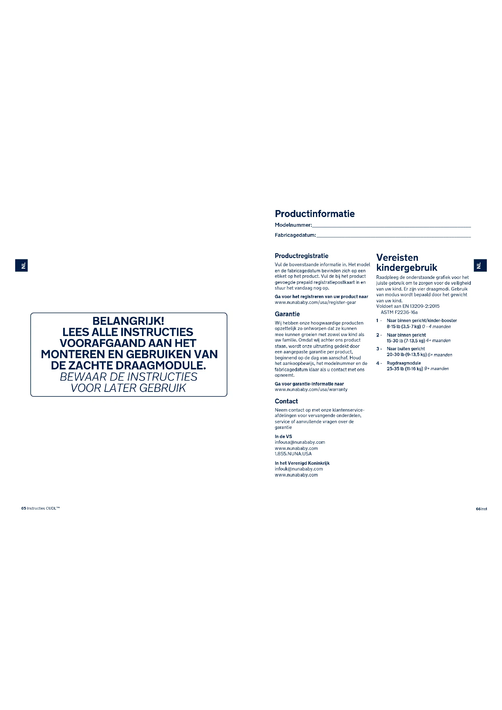 Productinformatie Modelnummer:_________________________________________________________________________________________________________________________________________________ Fabricagedatum: _____________________________________________________________________________________________________________________________________________ Productregistratie Vul de bovenstaande informatie in. Het model en de fabricagedatum bevinden zich op een etiket op het product. Vul de bij het product gevoegde prepaid registratiepostkaart in en stuur het vandaag nog op.Ga voor het registreren van uw product naar www.nunababy.com/usa/register-gear Garantie Wij hebben onze hoogwaardige producten opzettelijk zo ontworpen dat ze kunnen mee kunnen groeien met zowel uw kind als uw familie. Omdat wij achter ons product staan, wordt onze uitrusting gedekt door een aangepaste garantie per product, beginnend op de dag van aanschaf. Houd het aankoopbewijs, het modelnummer en de fabricagedatum klaar als u contact met ons opneemt.Ga voor garantie-informatie naar www.nunababy.com/usa/warranty Contact Neem contact op met onze klantenservice-afdelingen voor vervangende onderdelen, service of aanvullende vragen over de garantieIn de VS infousa@nunababy.com www.nunababy.com 1.855.NUNA.USAIn het Verenigd Koninkrijk infouk@nunababy.com www.nunababy.com Vereisten kindergebruik Raadpleeg de onderstaande grafiek voor het juiste gebruik om te zorgen voor de veiligheid van uw kind. Er zijn vier draagmodi. Gebruik van modus wordt bepaald door het gewicht van uw kind. Voldoet aan EN 13209-2:2015 ASTM F2236-16a1 - Naar binnen gericht/kinder-booster 8-15 lb (3,5-7 kg) 4 maanden2 - Naar binnen gericht 15-30 lb (7-13,5 kg) 4+ maanden3 - Naar buiten gericht 20-30 lb (9-13,5 kg) 6+ maanden4 - Rugdraagmodule 25-35 lb (11-16 kg) 9+ maanden65 Instructies CUDL™ 66Instructies CUDL™ BELANGRIJK!
