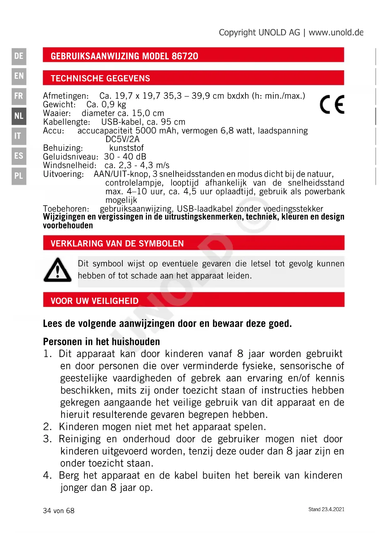 Dit symbool wijst op eventuele gevaren die letsel tot gevolg kunnen hebben of tot schade aan het apparaat leiden. Afmetingen: Ca. 19,7 x 19,7 35,3 – 39,9 cm bxdxh (h: min./max.) Gewicht: Ca. 0,9 kg Waaier: diameter ca. 15,0 cm Kabellengte: USB-kabel, ca. 95 cm Accu: accucapaciteit 5000 mAh, vermogen 6,8 watt, laadspanning DC5V/2A Behuizing: kunststof Geluidsniveau: 30 - 40 dB Windsnelheid: ca. 2,3 - 4,3 m/s Uitvoering: AAN/UIT-knop, 3 snelheidsstanden en modus dicht bij de natuur, controlelampje, looptijd afhankelijk van de snelheidsstand max. 4–10 uur, ca. 4,5 uur oplaadtijd, gebruik als powerbank mogelijk Toebehoren: gebruiksaanwijzing, USB-laadkabel zonder voedingsstekker Wijzigingen en vergissingen in de uitrustingskenmerken, techniek, kleuren en design voorbehouden Copyright UNOLD AG | www.unold.de UNOLD ©Stand 23.4.2021 35 von 68
