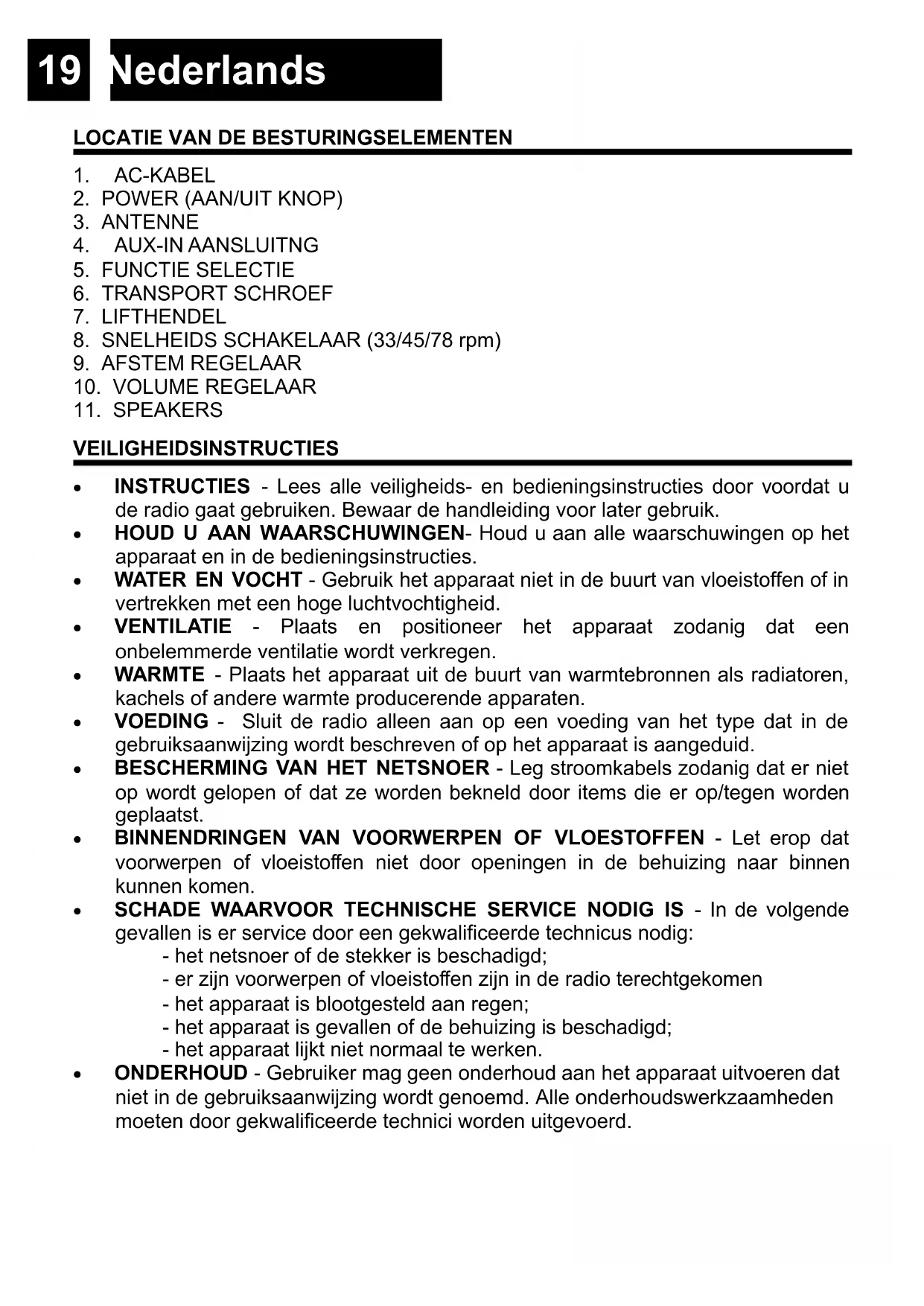 VEILIGHEIDSINSTRUCTIES INSTRUCTIES - Lees alle veiligheids- en bedieningsinstructies door voordat u de radio gaat gebruiken. Bewaar de handleiding voor later gebruik. HOUD U AAN WAARSCHUWINGEN- Houd u aan alle waarschuwingen op het apparaat en in de bedieningsinstructies. WATER EN VOCHT - Gebruik het apparaat niet in de buurt van vloeistoffen of in vertrekken met een hoge luchtvochtigheid. VENTILATIE - Plaats en positioneer het apparaat zodanig dat een onbelemmerde ventilatie wordt verkregen. WARMTE - Plaats het apparaat uit de buurt van warmtebronnen als radiatoren, kachels of andere warmte producerende apparaten. VOEDING - Sluit de radio alleen aan op een voeding van het type dat in de gebruiksaanwijzing wordt beschreven of op het apparaat is aangeduid. BESCHERMING VAN HET NETSNOER - Leg stroomkabels zodanig dat er niet op wordt gelopen of dat ze worden bekneld door items die er op/tegen worden geplaatst. BINNENDRINGEN VAN VOORWERPEN OF VLOESTOFFEN - Let erop dat voorwerpen of vloeistoffen niet door openingen in de behuizing naar binnen kunnen komen. SCHADE WAARVOOR TECHNISCHE SERVICE NODIG IS - In de volgende gevallen is er service door een gekwalificeerde technicus nodig: - het netsnoer of de stekker is beschadigd; - er zijn voorwerpen of vloeistoffen zijn in de radio terechtgekomen - het apparaat is blootgesteld aan regen; - het apparaat is gevallen of de behuizing is beschadigd; - het apparaat lijkt niet normaal te werken. ONDERHOUD - Gebruiker mag geen onderhoud aan het apparaat uitvoeren dat niet in de gebruiksaanwijzing wordt genoemd. Alle onderhoudswerkzaamheden moeten door gekwalificeerde technici worden uitgevoerd.20 Nederlands STROOMBRONNEN WISSELSTROOM: U kunt uw draagbare stereosysteem van stroom voorzien door het netsnoer op een stopcontact aan te sluiten. Controleer of de nominale span- ning van uw apparaat overeenkomt met uw lokale voltage.