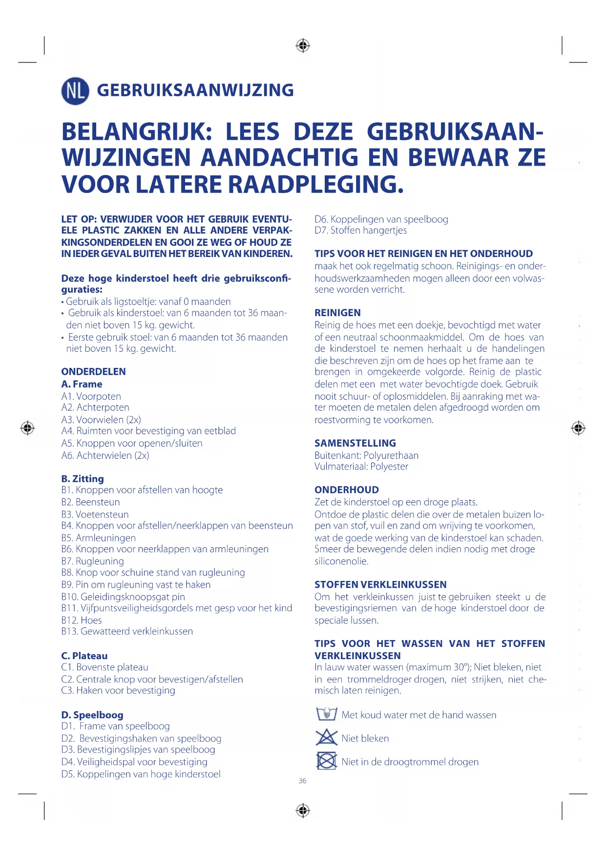 - Eerste gebruik stoel: van 6 maanden tot 36 maanden niet boven 15 kg. gewicht. ONDERDELEN A. Frame A1. Voorpoten A2. Achterpoten A3. Voorwielen (2x) A4. Ruimten voor bevestiging van eetblad A5. Knoppen voor openen/sluiten A6. Achterwielen (2x) B. Zitting B1. Knoppen voor afstellen van hoogte B2. Beensteun B3. Voetensteun B4. Knoppen voor afstellen/neerklappen van beensteun B5. Armleuningen B6. Knoppen voor neerklappen van armleuningen B7. Rugleuning B8. Knop voor schuine stand van rugleuning B9. Pin om rugleuning vast te haken B10. Geleidingsknoopsgat pin B11. Vijfpuntsveiligheidsgordels met gesp voor het kind B12. Hoes B13. Gewatteerd verkleinkussen C. Plateau C1. Bovenste plateau C2. Centrale knop voor bevestigen/afstellen C3. Haken voor bevestiging D. Speelboog D1. Frame van speelboog D2. Bevestigingshaken van speelboog D3. Bevestigingslipjes van speelboog D4. Veiligheidspal voor bevestiging D5. Koppelingen van hoge kinderstoel D6. Koppelingen van speelboog D7. Stoen hangertjes TIPS VOOR HET REINIGEN EN HET ONDERHOUD maak het ook regelmatig schoon. Reinigings- en onder- houdswerkzaamheden mogen alleen door een volwas- sene worden verricht. REINIGEN Reinig de hoes met een doekje, bevochtigd met water of een neutraal schoonmaakmiddel. Om de hoes van de kinderstoel te nemen herhaalt u de handelingen die beschreven zijn om de hoes op het frame aan te brengen in omgekeerde volgorde. Reinig de plastic delen met een met water bevochtigde doek. Gebruik nooit schuur- of oplosmiddelen. Bij aanraking met wa- ter moeten de metalen delen afgedroogd worden om roestvorming te voorkomen. SAMENSTELLING Buitenkant: Polyurethaan Vulmateriaal: Polyester ONDERHOUD Zet de kinderstoel op een droge plaats. Ontdoe de plastic delen die over de metalen buizen lo- pen van stof, vuil en zand om wrijving te voorkomen, wat de goede werking van de kinderstoel kan schaden. Smeer de bewegende delen indien nodig met droge siliconenolie. STOFFEN VERKLEINKUSSEN Om het verkleinkussen juist te gebruiken steekt u de bevestigingsriemen van de hoge kinderstoel door de speciale lussen. TIPS VOOR HET WASSEN VAN HET STOFFEN VERKLEINKUSSEN In lauw water wassen (maximum 30°); Niet bleken, niet in een trommeldroger drogen, niet strijken, niet che- misch laten reinigen. Met koud water met de hand wassen Niet bleken Niet in de droogtrommel drogen GEBRUIKSAANWIJZING